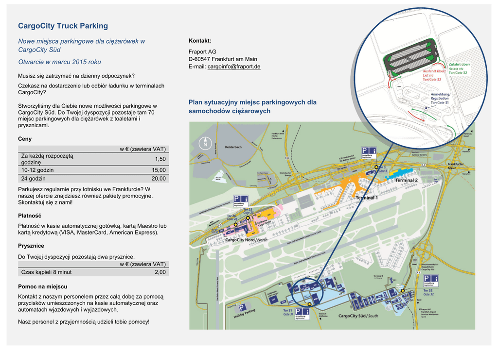 CargoCity Truck Parking Nowe miejsca parkingowe dla ciężarówek w CargoCity Süd Kontakt: Fraport AG D-60547 Frankfurt am Main E-mail: [email protected] Otwarcie w marcu 2015 roku Musisz się zatrzymać na dzienny odpoczynek? Czekasz na dostarczenie lub odbiór ładunku w terminalach CargoCity? Stworzyliśmy dla Ciebie nowe możliwości parkingowe w CargoCity Süd. Do Twojej dyspozycji pozostaje tam 70 miejsc parkingowych dla ciężarówek z toaletami i prysznicami. Ceny w € (zawiera VAT) Za każdą rozpoczętą godzinę 10-12 godzin 15,00 24 godzin 20,00 1,50 Parkujesz regularnie przy lotnisku we Frankfurcie? W naszej ofercie znajdziesz również pakiety promocyjne. Skontaktuj się z nami! Płatność Płatność w kasie automatycznej gotówką, kartą Maestro lub kartą kredytową (VISA, MasterCard, American Express). Prysznice Do Twojej dyspozycji pozostają dwa prysznice. w € (zawiera VAT) Czas kąpieli 8 minut 2,00 Pomoc na miejscu Kontakt z naszym personelem przez całą dobę za pomocą przycisków umieszczonych na kasie automatycznej oraz automatach wjazdowych i wyjazdowych. Nasz personel z przyjemnością udzieli tobie pomocy! Plan sytuacyjny miejsc parkingowych dla samochodów ciężarowych