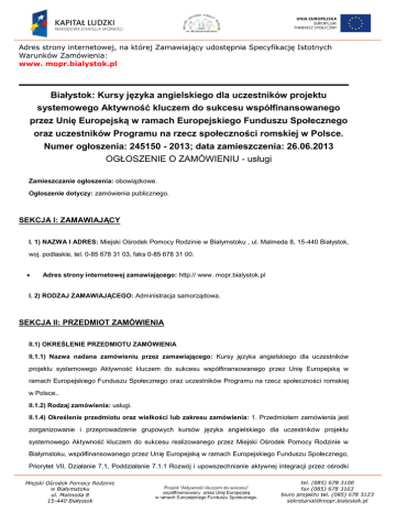 Adres strony internetowej, na której Zamawiający udostępnia Specyfikację Istotnych Warunków Zamówienia: www. mopr.bialystok.pl Białystok: Kursy języka angielskiego dla uczestników projektu systemowego Aktywność kluczem do sukcesu współfinansowanego przez Unię Europejską w ramach Europejskiego Funduszu Społecznego oraz uczestników Programu na rzecz społeczności romskiej w Polsce. Numer ogłoszenia: 245150 - 2013; data zamieszczenia: 26.06.2013 OGŁOSZENIE O ZAMÓWIENIU - usługi Zamieszczanie ogłoszenia: obowiązkowe. Ogłoszenie dotyczy: zamówienia publicznego. SEKCJA I: ZAMAWIAJĄCY I. 1) NAZWA I ADRES: Miejski Ośrodek Pomocy Rodzinie w Białymstoku , ul. Malmeda 8, 15-440 Białystok, woj. podlaskie, tel. 0-85 678 31 03, faks 0-85 678 31 00. Adres strony internetowej zamawiającego: http:// www. mopr.bialystok.pl I. 2) RODZAJ ZAMAWIAJĄCEGO: Administracja samorządowa. SEKCJA II: PRZEDMIOT ZAMÓWIENIA II.1) OKREŚLENIE PRZEDMIOTU ZAMÓWIENIA II.1.1) Nazwa nadana zamówieniu przez zamawiającego: Kursy języka angielskiego dla uczestników projektu systemowego Aktywność kluczem do sukcesu współfinansowanego przez Unię Europejską w ramach Europejskiego Funduszu Społecznego oraz uczestników Programu na rzecz społeczności romskiej w Polsce.. II.1.2) Rodzaj zamówienia: usługi. II.1.4) Określenie przedmiotu oraz wielkości lub zakresu zamówienia: 1. Przedmiotem zamówienia jest zorganizowanie i przeprowadzenie grupowych kursów języka angielskiego dla uczestników projektu systemowego Aktywność kluczem do sukcesu realizowanego przez Miejski Ośrodek Pomocy Rodzinie w Białymstoku, współfinansowanego przez Unię Europejską w ramach Europejskiego Funduszu Społecznego, Priorytet VII, Działanie 7.1, Poddziałanie 7.1.1 Rozwój i upowszechnianie aktywnej integracji przez ośrodki pomocy społecznej na lata 2007 - 2013, oraz uczestników Programu na rzecz społeczności romskiej w Polsce, podzielony na dwie części (pakiety): PAKIET NR 1: Kurs język angielskiego dla 45 osób bezrobotnych, w tym długotrwale bezrobotnych i nieaktywnych zawodowo- uczestników projektu systemowego Aktywność kluczem do sukcesu, PAKIET NR 2: Kurs języka angielskiego dla 3 osób uczestników Programu na rzecz społeczności romskiej w Polsce. 2. ZAŁOŻENIA WSPÓLNE: 1) Kurs powinien być prowadzony przez wykładowców posiadających odpowiednie kwalifikacje i doświadczenie w prowadzeniu zajęć objętych przedmiotem zamówienia, 2) W ramach realizacji przedmiotu zamówienia Wykonawca zobowiązany będzie do: a) organizacji kursu tzn. zapewnienia bezpiecznych i higienicznych warunków nauki, w tym zapewnienia sal szkoleniowych, przestronnych, odpowiednio oświetlonych, klimatyzowanych lub minimum wentylowanych, dostosowanych do liczebności grup uczestników kursu, odpowiednio wyposażonych w sprzęt dydaktyczny, np. rzutnik multimedialny, laptop, ekran, tablicę do pisania, flipcharty, stoły, krzesła, spełniających wymogi bezpieczeństwa bhp i przeciwpożarowe, z zapleczem socjalnym i sanitarnym, b) zapewnienia materiałów szkoleniowych odpowiadających programowi kursu, c) zapewnienia nadzoru nad organizacją kursu i realizacją programu merytorycznego, celem podniesienia jakości organizowanego kursu językowego, d) opracowania szczegółowego programu zajęć kursu , uwzględniającego założenia pkt. 3 i 5 specyfikacji i dostarczenie Zamawiającemu wraz ze złożoną ofertą, e) ustalenia, po konsultacjach z Zamawiającym, harmonogramu zajęć, uwzględniającego m.in. dzienny limit godzin szkolenia, tematy zajęć, miejsce odbywania zajęć, dane personalne wykładowcy i przekazania go Zamawiającemu przed rozpoczęciem zajęć. Wykonawca przed rozpoczęciem kursu zapozna uczestników z jego szczegółowym zakresem tematycznym i przekaże im harmonogram realizowanych zajęć. 3. Dodatkowe warunki dotyczące przedmiotu zamówienia: a) termin płatności: do 21 dni od daty otrzymania przez Zamawiającego faktury, b) nie przewiduje się wypłacania zaliczek na poczet wykonania zamówienia, c) forma i warunki zapłaty - jak we wzorze umowy - załącznik nr 7 a- b do specyfikacji istotnych warunków zamówienia.. II.1.5) przewiduje się udzielenie zamówień uzupełniających: Określenie przedmiotu oraz wielkości lub zakresu zamówień uzupełniających 6.1. Zamawiający przewiduje możliwość udzielania zamówień uzupełniających, o których mowa w art. 67 ust. 1 pkt 6 ustawy w odniesieniu do Pakiet Nr 1. 6.2. Zamówienia uzupełniające mogą polegać na powtórzeniu tego samego rodzaju zamówienia lub jego części, zgodnego z przedmiotem zamówienia podstawowego, o wartości do 10% zamówienia podstawowego w okresie 3 lat od udzielenia zamówienia podstawowego (od dnia podpisania umowy). II.1.6) Wspólny Słownik Zamówień (CPV): 80.58.00.00-3. II.1.7) Czy dopuszcza się złożenie oferty częściowej: tak, liczba części: 2. II.1.8) Czy dopuszcza się złożenie oferty wariantowej: nie. SEKCJA III: INFORMACJE O CHARAKTERZE PRAWNYM, EKONOMICZNYM, FINANSOWYM I TECHNICZNYM III.1) WADIUM Informacja na temat wadium: Zamawiający nie wymaga złożenia wadium. III.2) ZALICZKI III.3) WARUNKI UDZIAŁU W POSTĘPOWANIU ORAZ OPIS SPOSOBU DOKONYWANIA OCENY SPEŁNIANIA TYCH WARUNKÓW III. 3.1) Uprawnienia do wykonywania określonej działalności lub czynności, jeżeli przepisy prawa nakładają obowiązek ich posiadania Opis sposobu dokonywania oceny spełniania tego warunku o Zamawiający odstępuje od opisu sposobu dokonywania oceny spełniania warunku w tym zakresie. Zamawiający dokona oceny spełnienia warunku na podstawie oświadczenia o spełnianiu warunków udziału w postępowaniu, o którym mowa w pkt 9.1. lit. a SIWZ. III.3.2) Wiedza i doświadczenie Opis sposobu dokonywania oceny spełniania tego warunku o Warunek ten zostanie spełniony, jeżeli Wykonawca wykaże, że w ciągu ostatnich 3 lat przed upływem terminu składania ofert, a jeżeli okres pro