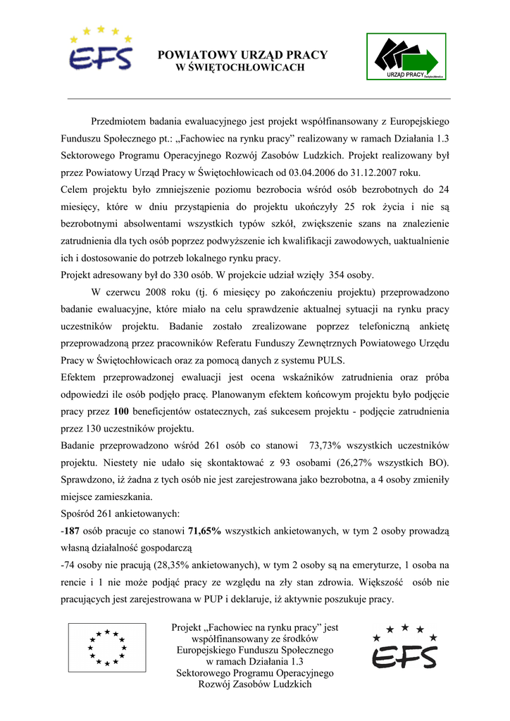 POWIATOWY URZĄD PRACY W ŚWIĘTOCHŁOWICACH Przedmiotem badania ewaluacyjnego jest projekt współfinansowany z Europejskiego Funduszu Społecznego pt.: „Fachowiec na rynku pracy” realizowany w ramach Działania 1.3 Sektorowego Programu Operacyjnego Rozwój Zasobów Ludzkich. Projekt realizowany był przez Powiatowy Urząd Pracy w Świętochłowicach od 03.04.2006 do 31.12.2007 roku. Celem projektu było zmniejszenie poziomu bezrobocia wśród osób bezrobotnych do 24 miesięcy, które w dniu przystąpienia do projektu ukończyły 25 rok życia i nie są bezrobotnymi absolwentami wszystkich typów szkół, zwiększenie szans na znalezienie zatrudnienia dla tych osób poprzez podwyższenie ich kwalifikacji zawodowych, uaktualnienie ich i dostosowanie do potrzeb lokalnego rynku pracy. Projekt adresowany był do 330 osób. W projekcie udział wzięły 354 osoby. W czerwcu 2008 roku (tj. 6 miesięcy po zakończeniu projektu) przeprowadzono badanie ewaluacyjne, które miało na celu sprawdzenie aktualnej sytuacji na rynku pracy uczestników projektu. Badanie zostało zrealizowane poprzez telefoniczną ankietę przeprowadzoną przez pracowników Referatu Funduszy Zewnętrznych Powiatowego Urzędu Pracy w Świętochłowicach oraz za pomocą danych z systemu PULS. Efektem przeprowadzonej ewaluacji jest ocena wskaźników zatrudnienia oraz próba odpowiedzi ile osób podjęło pracę. Planowanym efektem końcowym projektu było podjęcie pracy przez 100 beneficjentów ostatecznych, zaś sukcesem projektu - podjęcie zatrudnienia przez 130 uczestników projektu. Badanie przeprowadzono wśród 261 osób co stanowi 73,73% wszystkich uczestników projektu. Niestety nie udało się skontaktować z 93 osobami (26,27% wszystkich BO). Sprawdzono, iż żadna z tych osób nie jest zarejestrowana jako bezrobotna, a 4 osoby zmieniły miejsce zamieszkania. Spośród 261 ankietowanych: -187 osób pracuje co stanowi 71,65% wszystkich ankietowanych, w tym 2 osoby prowadzą własną działalność gospodarczą -74 osoby nie pracują (28,35% ankietowanych), w tym 2 osoby są na emeryturze, 1 osoba na rencie i 1 nie może podjąć pracy ze względu na zły stan zdrowia. Większość osób nie pracujących jest zarejestrowana w PUP i deklaruje, iż aktywnie poszukuje pracy. Projekt „Fachowiec na rynku pracy” jest współfinansowany ze środków Europejskiego Funduszu Społecznego w ramach Działania 1.3 Sektorowego Programu Operacyjnego Rozwój Zasobów Ludzkich 28,35% pracuje nie pracuje 71,65% Na początku 2009 roku (tj. rok po zakończeniu projektu) przeprowadzono kolejne badanie ewaluacyjne, które miało na celu sprawdzenie aktualnej sytuacji na rynku pracy uczestników projektu. Badanie przeprowadzono wśród 256 osób co stanowi 72,32% wszystkich uczestników projektu. Niestety nie udało się skontaktować z 98 osobami (27,68% wszystkich BO). Spośród 256 ankietowanych: -208 osób pracuje co stanowi 81,25% wszystkich ankietowanych, w tym 2 osoby prowadzą własną działalność gospodarczą -48 osób nie pracuje (18,75% ankietowanych), w tym 2 osoby są na emeryturze, 1 osoba na rencie i 1 nie może podjąć pracy ze względu na zły stan zdrowia. Większość osób nie pracujących jest zarejestrowana w PUP i deklaruje, iż aktywnie poszukuje pracy 18,75% pracuje nie pracuje 81,25% Projekt „Fachowiec na rynku pracy” jest współfinansowany ze środków Europejskiego Funduszu Społecznego w ramach Działania 1.3 Sektorowego Programu Operacyjnego Rozwój Zasobów Ludzkich Zakładano, iż sukcesem projektu będzie podjęcie zatrudnienia przez 130 beneficjentów ostatecznych. Po roku od zakończenia projektu, okazuje się, że wśród 256 osób, z którymi udało się skontaktować, jest aż 208 pracujących. W porównaniu do badania jakie przeprowadzono w czerwcu 2008 r., liczba osób pracujących zwiększyła się o 21, a liczba osób pozostających bez pracy zmniejszyła o 26. Tak dobry wynik jest kolejnym dowodem na to, iż udział w projekcie znacznie podwyższa szanse na znalezienie pracy. Projekt „Fachowiec na rynku pracy” jest współfinansowany ze środków Europejskiego Funduszu Społecznego w ramach Działania 1.3 Sektorowego Programu Operacyjnego Rozwój Zasobów Ludzkich