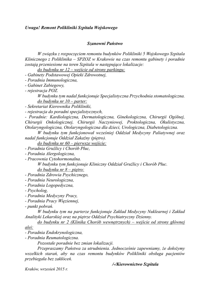 Uwaga! Remont Polikliniki Szpitala Wojskowego Szanowni Państwo W związku z rozpoczęciem remontu budynków Polikliniki 5 Wojskowego Szpitala Klinicznego z Poliklinika – SPZOZ w Krakowie na czas remontu gabinety i poradnie zostają przeniesione na teren Szpitala w następujące lokalizacje: do budynku nr 12 – wejście od strony parkingu: - Gabinety Podstawowej Opieki Zdrowotnej, - Poradnia Immunologiczna, - Gabinet Zabiegowy, - rejestracja POZ. W budynku tym nadal funkcjonuje Specjalistyczna Przychodnia stomatologiczna. do budynku nr 10 – parter: - Sekretariat Kierownika Polikliniki, - rejestracja do poradni specjalistycznych, - Poradnie: Kardiologiczna, Dermatologiczna, Ginekologiczna, Chirurgii Ogólnej, Chirurgii Onkologicznej, Chirurgii Naczyniowej, Proktologiczna, Okulistyczna, Otolaryngologiczna, Otolaryngologiczna dla dzieci, Urologiczna, Diabetologiczna. W budynku tym funkcjonował wcześniej Oddział Medycyny Paliatywnej oraz nadal funkcjonuje Oddział Zakaźny (piętro). do budynku nr 60 – pierwsze wejście: - Poradnia Gruźlicy i Chorób Płuc, - Poradnia Alergologiczna, - Pracownia Cytohormonalna. W budynku tym funkcjonuje Kliniczny Oddział Gruźlicy i Chorób Płuc. do budynku nr 8 – piętro: - Poradnia Zdrowia Psychicznego, - Poradnia Neurologiczna, - Poradnia Logopedyczna, - Psycholog, - Poradnia Medycyny Pracy, - Poradnia Pracy Więziennej, - punkt pobrań. W budynku tym na parterze funkcjonuje Zakład Medycyny Nuklearnej i Zakład Analityki Lekarskiej oraz na piętrze Oddział Psychiatryczny Dzienny. do budynku nr 2 (Klinika Chorób wewnętrznych) – wejście od strony głównej alei: - Poradnia Endokrynologiczna, - Poradnia Reumatologiczna. Pozostałe poradnie bez zmian lokalizacji. Przepraszamy Państwa za utrudnienia. Jednocześnie zapewniamy, że dołożymy wszelkich starań, aby na czas remontu budynków Polikliniki obsługa pacjentów przebiegała bez zakłóceń. /-/Kierownictwo Szpitala Kraków, wrzesień 2015 r.