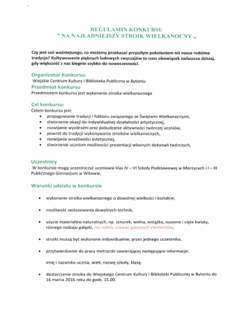 REGULAMIN KONKURSU " NA NAJŁADNIEJSZY STROIK WIELKANOCNY „ Czy jest coś ważniejszego, co możemy przekazać przyszłym pokoleniom niż nasza rodzima tradycja? Kultywowanie pięknych ludowych zwyczajów to nasz obowiązek zwłaszcza dzisiaj, gdy większość z nas biegnie szybko do nowoczesności. Organizator Konkursu: Wiejskie Centrum Kultury i Biblioteka Publiczna w Bytoniu Przedmiot konkursu Przedmiotem konkursu jest wykonanie stroika wielkanocnego Cel konkursu: Celem konkursu jest: • propagowanie tradycji i folkloru związanego ze Świętami Wielkanocnymi, • stworzenie okazji do indywidualnej działalności artystycznej, • rozwijanie wyobraźni oraz pobudzanie aktywności twórczej uczniów, • powrót do tradycji wykonywania stroików wielkanocnych, • rozwijanie wrażliwości estetycznej, • stworzenie uczniom możliwości prezentacji własnych dokonań twórczych, Uczestnicy W konkursie mogą uczestniczyć uczniowie klas IV — VI Szkoły Podstawowej w Morzycach i I — III Publicznego Gimnazjum w Witowie. Warunki udziału w konkursie • wykonanie stroika wielkanocnego o dowolnej wielkości i kształcie, • możliwość zastosowania dowolnych technik, • użycie materiałów naturalnych, np. sznurek, wełna, wstążka, suszone i cięte kwiaty, różnego rodzaju gałązki, me należy używać gotowych elementów, • stroiki muszą być wykonane indywidualnie, przez jednego uczestnika, • przytwierdzenie do pracy metryczki zawierającej następujące informacje: imię i nazwisko ucznia, wiek, nazwę szkoły, klasę. • dostarczenie stroika do Wiejskiego Centrum Kultury i Biblioteki Publicznej w Bytoniu do 16 marca 2016 roku do godz. 15.00. Ocena prac Oceny prac dokona Komisja Konkursowa. Wyniki oceny zostaną ogłoszone w dniu 20 marca 2016 roku około godziny 13.00 podczas Pokazu Stołów Wielkanocnych w WCK i BP w Bytoniu. Przy ocenie stroików wielkanocnych Komisja zastosuje następujące kryteria: • estetyka wykonania, • walory artystyczne pracy. Komisja Konkursowa oceni stroiki wielkanocne w dwóch kategoriach wiekowych: • klasy IV — VI szkoły podstawowe, • klasy I — III gimnazjum. Postanowienia końcowe Zgłoszenie stroików do konkursu jest jednoznaczne z przekazaniem praw autorskich do nich na rzecz Organizatora. Organizator zastrzega sobie prawo do zatrzymania nagrodzonych prac. Pozostałe prace będzie można odebrać. Wszystkie informacje dotyczące spraw nie wyszczególnionych w regulaminie można otrzymać pod numerem telefonu 54 285 13 17 w.22.