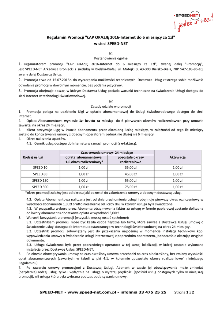 Regulamin Promocji "ŁAP OKAZJĘ 2016-Internet do 6 miesięcy za 1zł" w sieci SPEED-NET §1 Postanowienia ogólne 1. Organizatorem promocji "ŁAP OKAZJĘ 2016-Internet do 6 miesięcy za 1zł", zwanej dalej "Promocją", jest SPEED-NET Arkadiusz Broniecki z siedzibą w Bielsku-Białej, ul. Matejki 3, 43-300 Bielsko-Biała, NIP 547-183-86-10, zwany dalej Dostawcą Usług. 2. Promocja trwa od 15.07.2016r. do wyczerpania możliwości technicznych. Dostawca Usług zastrzega sobie możliwośd odwołania promocji w dowolnym momencie, bez podania przyczyny. 3. Promocja obejmuje obszar, w którym Dostawca Usług posiada warunki techniczne na świadczenie Usługi dostępu do sieci Internet w technologii światłowodowej. §2 Zasady udziału w promocji 1. Promocja polega na udzieleniu Ulgi w opłacie abonamentowej do Usługi światłowodowego dostępu do sieci Internet. 2. Opłata Abonamentowa wyniesie 1zł brutto za miesiąc- do 6 pierwszych okresów rozliczeniowych przy umowie zawartej na okres 24 miesięcy, 3. Klient otrzymuje ulgę w kwocie abonamentu przez określoną liczbę miesięcy, w zależności od tego ile miesięcy zostało do kooca trwania umowy z obecnym operatorem, jednak nie dłużej niż 6 miesięcy 4. Okres naliczenia upustów. 4.1. Cennik usług dostępu do Internetu w ramach promocji (z e-fakturą): Rodzaj usługi Czas trwania umowy- 24 miesiące opłata abonamentowa pozostałe okresy 1-6 okres rozliczeniowy* rozliczeniowe Aktywacja SPEED 10 1,00 zł 35,00 zł 1,00 zł SPEED 80 1,00 zł 45,00 zł 1,00 zł SPEED 150 1,00 zł 55,00 zł 1,00 zł SPEED 300 1,00 zł 75,00 zł 1,00 zł *okres promocji zależny jest od okresu jaki pozostał do zakooczenia umowy z obecnym dostawcą usługi. 4.2. Opłata Abonamentowa naliczana jest od dnia uruchomienia usługi i obejmuje pierwszy okres rozliczeniowy w wysokości abonamentu 1,00zł brutto niezależnie od liczby dni, w których usługa była świadczona. 4.3. W przypadku wyboru przez Abonenta otrzymywania faktur za usługę w formie papierowej zostanie doliczona do kwoty abonamentu dodatkowa opłata w wysokości 3,00zł 5. Warunki korzystania z promocji (wszystkie muszą zostad spełnione): 5.1. Uczestnikiem promocji może byd każda osoba fizyczna lub firma, która zawrze z Dostawcą Usługi umowę o świadczenie usługi dostępu do Internetu dostarczanego w technologii światłowodowej na okres 24 miesięcy. 5.2. Uczestnik promocji zobowiązany jest do przekazania najpóźniej w momencie instalacji technikowi kopi wypowiedzenia umowy o świadczenie usługi internetowej z poprzednim operatorem, jednocześnie okazując oryginał dokumentu. 5.3. Usługa świadczona była przez poprzedniego operatora w tej samej lokalizacji, w której zostanie wykonana instalacja przez Dostawcę Usługi SPEED-NET. 6. Po okresie obowiązywania umowy na czas określony umowa przechodzi na czas nieokreślony, bez zmiany wysokości opłat abonamentowych (zawartych w tabeli w pkt 4.1. w kolumnie „pozostałe okresy rozliczeniowe” niniejszego Regulaminu) 7. Po zawarciu umowy promocyjnej z Dostawcą Usługi, Abonent w czasie jej obowiązywania może zmieniad (bezpłatnie) rodzaj usługi tylko i wyłącznie na usługę o wyższej prędkości (spośród usług dostępnych tylko w niniejszej promocji), niż usługa która była wybrana podczas podpisywania umowy. SPEED-NET - www.speed-net.com.pl - infolinia 33 475 25 25 Strona 1 z 2 8. W przypadku rozwiązania umowy promocyjnej przez Abonenta lub przez Dostawcę Usługi, z przyczyn leżących po stronie abonenta, lub wygaśnięcia umowy promocyjnej z przyczyn określonych w regulaminie przed zakooczeniem terminu jej obowiązywania, Abonent zostanie obciążony Opłatą Wyrównawczą (która stanowi karę umowną za przedterminowe rozwiązanie umowy), obliczona z zasadami określnych poniżej: 8.1. Opłata wyrównawcza nie może przekroczyd przyznanej Abonentowi ulgi pomniejszonej o proporcjonalną wartośd od dnia zawarcia Umowy do dnia rozwiązania Umowy, przy czym maksymalna kwota jaka może byd naliczona, wynosi 800,00 zł Opłata wyrównawcza nie podlega podatkowi VAT i będzie naliczona proporcjonalnie do okresu jaki pozostał do daty zakooczenia obowiązywania umowy promocyjnej. Abonent będzie zobowiązany do uiszczenia opłaty wyrównawczej w terminie wskazanym przez Dostawcę Usługi w nocie debetowej. Oświadczam, iż zapoznałem się z zasadami niniejszej promocji i w pełni je akceptuję .................................................. (podpis Abonenta) SPEED-NET - www.speed-net.com.pl - infolinia 33 475 25 25 Strona 2 z 2