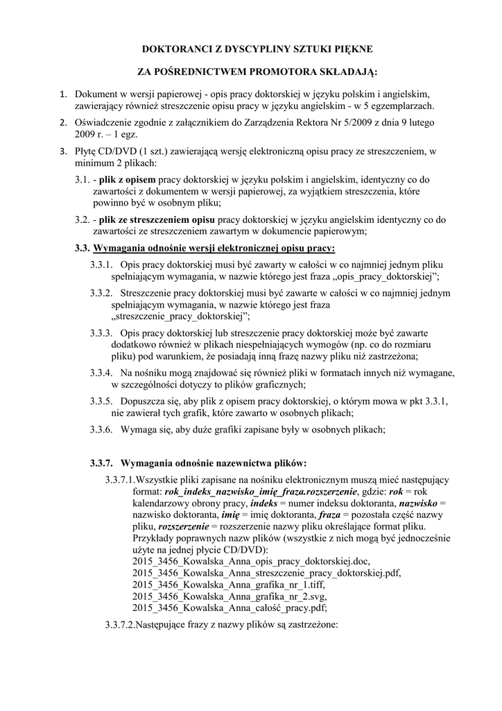 DOKTORANCI Z DYSCYPLINY SZTUKI PIĘKNE ZA POŚREDNICTWEM PROMOTORA SKŁADAJĄ: 1. Dokument w wersji papierowej - opis pracy doktorskiej w języku polskim i angielskim, zawierający również streszczenie opisu pracy w języku angielskim - w 5 egzemplarzach. 2. Oświadczenie zgodnie z załącznikiem do Zarządzenia Rektora Nr 5/2009 z dnia 9 lutego 2009 r. – 1 egz. 3. Płytę CD/DVD (1 szt.) zawierającą wersję elektroniczną opisu pracy ze streszczeniem, w minimum 2 plikach: 3.1. - plik z opisem pracy doktorskiej w języku polskim i angielskim, identyczny co do zawartości z dokumentem w wersji papierowej, za wyjątkiem streszczenia, które powinno być w osobnym pliku; 3.2. - plik ze streszczeniem opisu pracy doktorskiej w języku angielskim identyczny co do zawartości ze streszczeniem zawartym w dokumencie papierowym; 3.3. Wymagania odnośnie wersji elektronicznej opisu pracy: 3.3.1. Opis pracy doktorskiej musi być zawarty w całości w co najmniej jednym pliku spełniającym wymagania, w nazwie którego jest fraza „opis_pracy_doktorskiej”; 3.3.2. Streszczenie pracy doktorskiej musi być zawarte w całości w co najmniej jednym spełniającym wymagania, w nazwie którego jest fraza „streszczenie_pracy_doktorskiej”; 3.3.3. Opis pracy doktorskiej lub streszczenie pracy doktorskiej może być zawarte dodatkowo również w plikach niespełniających wymogów (np. co do rozmiaru pliku) pod warunkiem, że posiadają inną frazę nazwy pliku niż zastrzeżona; 3.3.4. Na nośniku mogą znajdować się również pliki w formatach innych niż wymagane, w szczególności dotyczy to plików graficznych; 3.3.5. Dopuszcza się, aby plik z opisem pracy doktorskiej, o którym mowa w pkt 3.3.1, nie zawierał tych grafik, które zawarto w osobnych plikach; 3.3.6. Wymaga się, aby duże grafiki zapisane były w osobnych plikach; 3.3.7. Wymagania odnośnie nazewnictwa plików: 3.3.7.1.Wszystkie pliki zapisane na nośniku elektronicznym muszą mieć następujący format: rok_indeks_nazwisko_imię_fraza.rozszerzenie, gdzie: rok = rok kalendarzowy obrony pracy, indeks = numer indeksu doktoranta, nazwisko = nazwisko doktoranta, imię = imię doktoranta, fraza = pozostała część nazwy pliku, rozszerzenie = rozszerzenie nazwy pliku określające format pliku. Przykłady poprawnych nazw plików (wszystkie z nich mogą być jednocześnie użyte na jednej płycie CD/DVD): 2015_3456_Kowalska_Anna_opis_pracy_doktorskiej.doc, 2015_3456_Kowalska_Anna_streszczenie_pracy_doktorskiej.pdf, 2015_3456_Kowalska_Anna_grafika_nr_1.tiff, 2015_3456_Kowalska_Anna_grafika_nr_2.svg, 2015_3456_Kowalska_Anna_całość_pracy.pdf; 3.3.7.2.Następujące frazy z nazwy plików są zastrzeżone: 3.3.7.2.1. opis_pracy_doktorskiej – musi zawierać wersję elektroniczną pracy doktorskiej, o której mowa w punkcie 3.3.1, zawierającą część tekstową pracy; 3.3.7.2.2. streszczenie_pracy_doktorskiej – musi zawierać wersję elektroniczną streszczenia pracy doktorskiej, o której mowa w punkcie 3.3.2, zawierającą część tekstową streszczenia pracy. 3.3.8. Wymogi co do formatu plików: Pliki zawierające opis pracy oraz streszczenie pracy muszą być w formacie DOC, DOCX, ODT, RTF. Dopuszcza się format PDF, o ile plik nie jest większy niż 20 MB. Informację przygotowali: Kierownik dziekanatu mgr Dorota Stępień; e-mail: [email protected] Informatyk wydziałowy mgr Kazimierz Kunisz: [email protected]