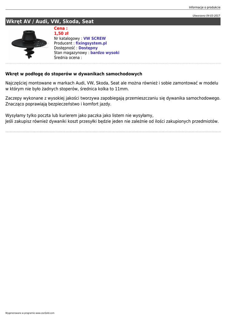 Informacje o produkcie Utworzono 04-03-2017 Wkręt AV / Audi, VW, Skoda, Seat Cena : 1,50 zł Nr katalogowy : VW SCREW Producent : fixingsystem.pl Dostępność : Dostępny Stan magazynowy : bardzo wysoki Średnia ocena : Wkręt w podłogę do stoperów w dywanikach samochodowych Najczęściej montowane w markach Audi, VW, Skoda, Seat ale można również i sobie zamontować w modelu w którym nie było żadnych stoperów, średnica kolka to 11mm. Zaczepy wykonane z wysokiej jakości tworzywa zapobiegają przemieszczaniu się dywanika samochodowego. Znacząco poprawiają bezpieczeństwo i komfort jazdy. Wysyłamy tylko poczta lub kurierem jako paczka jako listem nie wysyłamy, Jeśli zakupisz również dywaniki koszt przesyłki będzie jeden nie zależnie od ilości zakupionych przedmiotów. Wygenerowano w programie www.oscGold.com