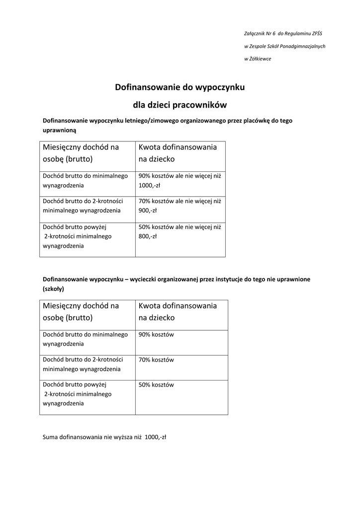 Załącznik Nr 6 do Regulaminu ZFŚS w Zespole Szkół Ponadgimnazjalnych w Żółkiewce Dofinansowanie do wypoczynku dla dzieci pracowników Dofinansowanie wypoczynku letniego/zimowego organizowanego przez placówkę do tego uprawnioną Miesięczny dochód na osobę (brutto) Kwota dofinansowania na dziecko Dochód brutto do minimalnego wynagrodzenia 90% kosztów ale nie więcej niż 1000,-zł Dochód brutto do 2-krotności minimalnego wynagrodzenia 70% kosztów ale nie więcej niż 900,-zł Dochód brutto powyżej 2-krotności minimalnego wynagrodzenia 50% kosztów ale nie więcej niż 800,-zł Dofinansowanie wypoczynku – wycieczki organizowanej przez instytucje do tego nie uprawnione (szkoły) Miesięczny dochód na osobę (brutto) Kwota dofinansowania na dziecko Dochód brutto do minimalnego wynagrodzenia 90% kosztów Dochód brutto do 2-krotności minimalnego wynagrodzenia 70% kosztów Dochód brutto powyżej 2-krotności minimalnego wynagrodzenia 50% kosztów Suma dofinansowania nie wyższa niż 1000,-zł