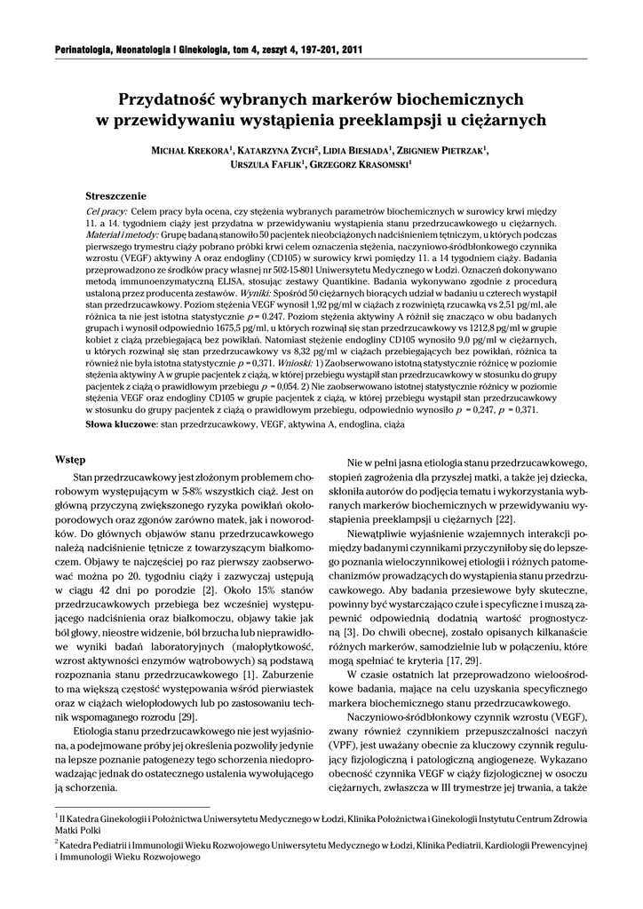 Perinatologia, Neonatologia i Ginekologia, tom 4, zeszyt 4, 197-201, 2011 Przydatność wybranych markerów biochemicznych w przewidywaniu wystąpienia preeklampsji u ciężarnych MICHAŁ KREKORA1, KATARZYNA ZYCH2, LIDIA BIESIADA1, ZBIGNIEW PIETRZAK1, URSZULA FAFLIK1, GRZEGORZ KRASOMSKI1 Streszczenie Cel pracy: Celem pracy była ocena, czy stężenia wybranych parametrów biochemicznych w surowicy krwi między 11. a 14. tygodniem ciąży jest przydatna w przewidywaniu wystąpienia stanu przedrzucawkowego u ciężarnych. Materiał i metody: Grupę badaną stanowiło 50 pacjentek nieobciążonych nadciśnieniem tętniczym, u których podczas pierwszego trymestru ciąży pobrano próbki krwi celem oznaczenia stężenia, naczyniowo-śródbłonkowego czynnika wzrostu (VEGF) aktywiny A oraz endogliny (CD105) w surowicy krwi pomiędzy 11. a 14 tygodniem ciąży. Badania przeprowadzono ze środków pracy własnej nr 502-15-801 Uniwersytetu Medycznego w Łodzi. Oznaczeń dokonywano metodą immunoenzymatyczną ELISA, stosując zestawy Quantikine. Badania wykonywano zgodnie z procedurą ustaloną przez producenta zestawów. Wyniki: Spośród 50 ciężarnych biorących udział w badaniu u czterech wystąpił stan przedrzucawkowy. Poziom stężenia VEGF wynosił 1,92 pg/ml w ciążach z rozwiniętą rzucawką vs 2,51 pg/ml, ale różnica ta nie jest istotna statystycznie p = 0.247. Poziom stężenia aktywiny A różnił się znacząco w obu badanych grupach i wynosił odpowiednio 1675,5 pg/ml, u których rozwinął się stan przedrzucawkowy vs 1212,8 pg/ml w grupie kobiet z ciążą przebiegającą bez powikłań. Natomiast stężenie endogliny CD105 wynosiło 9,0 pg/ml w ciężarnych, u których rozwinął się stan przedrzucawkowy vs 8,32 pg/ml w ciążach przebiegających bez powikłań, różnica ta również nie była istotna statystycznie p = 0,371. Wnioski: 1) Zaobserwowano istotną statystycznie różnicę w poziomie stężenia aktywiny A w grupie pacjentek z ciążą, w której przebiegu wystąpił stan przedrzucawkowy w stosunku do grupy pacjentek z ciążą o prawidłowym przebiegu p = 0,054. 2) Nie zaobserwowano istotnej statystycznie różnicy w poziomie stężenia VEGF oraz endogliny CD105 w grupie pacjentek z ciążą, w której przebiegu wystąpił stan przedrzucawkowy w stosunku do grupy pacjentek z ciążą o prawidłowym przebiegu, odpowiednio wynosiło p = 0,247, p = 0,371. Słowa kluczowe: stan przedrzucawkowy, VEGF, aktywina A, endoglina, ciąża Wstęp Stan przedrzucawkowy jest złożonym problemem chorobowym występującym w 5-8% wszystkich ciąż. Jest on główną przyczyną zwiększonego ryzyka powikłań okołoporodowych oraz zgonów zarówno matek, jak i noworodków. Do głównych objawów stanu przedrzucawkowego należą nadciśnienie tętnicze z towarzyszącym białkomoczem. Objawy te najczęściej po raz pierwszy zaobserwować można po 20. tygodniu ciąży i zazwyczaj ustępują w ciągu 42 dni po porodzie [2]. Około 15% stanów przedrzucawkowych przebiega bez wcześniej występującego nadciśnienia oraz białkomoczu, objawy takie jak ból głowy, nieostre widzenie, ból brzucha lub nieprawidłowe wyniki badań laboratoryjnych (małopłytkowość, wzrost aktywności enzymów wątrobowych) są podstawą rozpoznania stanu przedrzucawkowego [1]. Zaburzenie to ma większą częstość występowania wśród pierwiastek oraz w ciążach wielopłodowych lub po zastosowaniu technik wspomaganego rozrodu [29]. Etiologia stanu przedrzucawkowego nie jest wyjaśniona, a podejmowane próby jej określenia pozwoliły jedynie na lepsze poznanie patogenezy tego schorzenia niedoprowadzając jednak do ostatecznego ustalenia wywołującego ją schorzenia. Nie w pełni jasna etiologia stanu przedrzucawkowego, stopień zagrożenia dla przyszłej matki, a także jej dziecka, skłoniła autorów do podjęcia tematu i wykorzystania wybranych markerów biochemicznych w przewidywaniu wystąpienia preeklampsji u ciężarnych [22]. Niewątpliwie wyjaśnienie wzajemnych interakcji pomiędzy badanymi czynnikami przyczyniłoby się do lepszego poznania wieloczynnikowej etiologii i różnych patomechanizmów prowadzących do wystąpienia stanu przedrzucawkowego. Aby badania przesiewowe były skuteczne, powinny być wystarczająco czułe i specyficzne i muszą zapewnić odpowiednią dodatnią wartość prognostyczną [3]. Do chwili obecnej, zostało opisanych kilkanaście różnych markerów, samodzielnie lub w połączeniu, które mogą spełniać te kryteria [17, 29]. W czasie ostatnich lat przeprowadzono wieloośrodkowe badania, mające na celu uzyskania specyficznego markera biochemicznego stanu przedrzucawkowego. Naczyniowo-śródbłonkowy czynnik wzrostu (VEGF), zwany również czynnikiem przepuszczalności naczyń (VPF), jest uważany obecnie za kluczowy czynnik regulujący fizjologiczną i patologiczną angiogenezę. Wykazano obecność czynnika VEGF w ciąży fizjologicznej w osoczu ciężarnych, zwłaszcza w III trymestrze jej trwania, a także 1 II Katedra Ginekologii i Położnictwa Uniwersytetu Medycznego w Łodzi, Klinika Położnictwa i Ginekologii Instytutu Centrum Zdrowia Matki Polki 2 Katedra Pediatrii i Immunologii Wieku Rozwojowego Uniwersytetu Medycznego w Łodzi, Klinika Pediatrii, Kardiologii Prewencyjnej i Immunologii Wieku Rozwojowego 198 M. Krekora, K. Zych, L. Biesiada, Z. Pietrzak, U. Faflik, G. Krasomski w osoczu krwi pępowinowej. U ciężarnych ze stanem przedrzucawkowym obserwowano istotnie niższe stężenie tej substancji w porównaniu ze zdrowymi ciężarnymi już w II trymestrze ciąży [12, 13]. Bardzo obiecujące wydają się wyniki badań nad aktywiną A. W ciąży podstawowym źródłem krążącej aktywiny są: łożysko, doczesna oraz błony płodowe [9]. W ciążach o prawidłowym przebiegu stężenie aktywiny A stopniowo rośnie od początku ciąży aż do 38. tygodnia jej trwania, a następnie obniża pomiędzy 38. a 41. tygodniem ciąży [10, 11]. Stęż