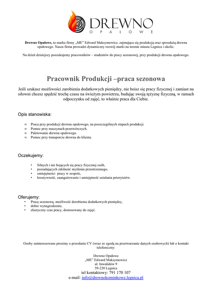 Drewno Opałowe, to marka firmy „ME” Edward Maksymowicz, zajmująca się produkcją oraz sprzedażą drewna opałowego. Nasza firma prowadzi dynamiczny rozwój marki na terenie miasta Legnica i okolic. Na dzień dzisiejszy poszukujemy pracowników – studentów do pracy sezonowej, przy produkcji drewna opałowego. Pracownik Produkcji –praca sezonowa Jeśli szukasz możliwości zarobienia dodatkowych pieniędzy, nie boisz się pracy fizycznej i zamiast na siłowni chcesz spędzić trochę czasu na świeżym powietrzu, budując swoją tężyznę fizyczną, w ramach odpoczynku od zajęć, to właśnie praca dla Ciebie. Opis stanowiska: • • • • Praca przy produkcji drewna opałowego, na poszczególnych etapach produkcji. Pomoc przy maszynach przetwórczych. Paletowanie drewna opałowego. Pomoc przy transporcie drewna do klienta. Oczekujemy: • • • • Silnych i nie bojących się pracy fizycznej osób, posiadających zdolność myślenia przestrzennego, umiejętności pracy w zespole, kreatywność, zaangażowanie i umiejętność ustalania priorytetów. Oferujemy: • • • Pracę sezonową, możliwość dorobienia dodatkowych pieniędzy, dobre wynagrodzenie, elastyczny czas pracy, dostosowany do zajęć. Osoby zainteresowane prosimy o przesłanie CV (wraz ze zgodą na przetwarzanie danych osobowych) lub o kontakt telefoniczny: Drewno Opałowe „ME” Edward Maksymowicz ul. Inwalidów 9 59-220 Legnica tel kontaktowy: 791 170 107 e-mail: [email protected]