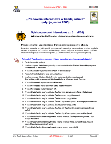 Instrukcja numer SPD3/14_03/Z4 „Pracownia internetowa w każdej szkole” (edycja jesień 2005) Opiekun pracowni internetowej cz. 3 (PD3) Windows Media Encoder - transmisja strumieniowa ekranu Przygotowanie i uruchomienie transmisji strumieniowej ekranu Instrukcja omawia, w jaki sposób przygotować transmisję strumieniową on-line wyglądu ekranu komputera, na którym uruchomiony został program Windows Media Encoder. Można w ten sposób nadawać cały pulpit, jak również okna poszczególnych aplikacji. Polecenie 1 To polecenie wykonujemy tylko na konsoli serwera (nie przez pulpit zdalny) 1. Zamknij wszystkie aplikacje 2. Uruchom program Kalkulator wybierając z paska zadań kolejno Start Wszystkie programy Akcesoria Kalkulator 3. W oknie Kalkulator wybierz z menu Widok Standardowy 4. Przesuń okno Kalkulator w lewy górny róg ekranu 5. Uruchom program Windows Media Encoder wybierając kolejno z paska zadań Start Wszystkie programy Windows Media Windows Media Encoder 6. W oknie Nowa sesja wybierz zakładkę Kreatorzy 7. W oknie Nowa sesja wskaż dokument Sesja niestandardowa 8. W oknie Nowa sesja wybierz przycisk OK. 9. W oknie Właściwości sesji w zakładce Źródła w polu Nazwa wpisz: Obraz z kalkulatora 10. W oknie Właściwości sesji w zakładce Źródła zaznacz opcję Urządzenia 11. W oknie Właściwości sesji w zakładce Źródła zaznacz opcję Wideo 12. W oknie Właściwości sesji w zakładce Źródła z listy Wideo wybierz Przechwytywanie ekranu 13. W oknie Właściwości sesji w zakładce Źródła zaznacz opcję Audio 14. W oknie Właściwości sesji w zakładce Źródła z listy Audio wybierz (domyślne urządzenie audio) 15. W oknie Właściwości sesji w zakładce Źródła z listy Wideo wybierz przycisk Konfiguruj 16. W oknie Właściwości: Przechwytywanie ekranu w ramce Źródło przechwytywania z listy wybierz Kalkulator 17. W oknie Właściwości: Przechwytywanie ekranu w ramce Opcje zaznacz Włącz miganie krawędzi podczas przechwytywania 18. W oknie Właściwości: Przechwytywanie ekranu wybierz przycisk OK. © by Darek, Janusz, Robert, Andrzej NR SPD3/14_03/z4 [v. 1.2] Strona 1/2 Windows Media Encoder - transmisja strumieniowa ekranu 19. W oknie Właściwości sesji w zakładce Wyjście w polu Numer portu wpisz 60000 20. W oknie Właściwości sesji w zakładce Kompresja z listy Wideo wybierz Przechwytywanie ekranu (CBR) 21. W oknie Właściwości sesji w zakładce Kompresja z listy Audio wybierz Audio o jakości FM (CBR) 22. W oknie Właściwości sesji w zakładce Kompresja z ramki Szybkość transmisji bitów zaznacz tylko opcję 282 Kb/s 23. Upewnij się, że w oknie Właściwości sesji w zakładce Kompresja z ramki Szybkość transmisji bitów zaznaczona została tylko opcja 282 Kb/s 24. W oknie Windows Media Encoder wybierz z menu Plik Zapisz jako… 25. W oknie Zapisywanie sesji jako w polu Nazwa pliku: wpisz Obraz pracy z kalkulatorem 26. W oknie Zapisywanie sesji jako wybierz przycisk Zapisz 27. W oknie Windows Media Encoder wybierz przycisk Uruchom kodowanie Notatka .................................................................................. .................................................................................. .................................................................................. .................................................................................. .................................................................................. .................................................................................. .................................................................................. .................................................................................. Polecenie 2 Należy wykonać na obu stacjach roboczych 1. Zaloguj się na stacji roboczej jako użytkownik nauczyciel0xxn 2. Uruchom program Internet Explorer 3. Wpisz w polu Adres przeglądarki mms://sbsNR:60000 np. mms://sbs32:60000 Notatka – Jakie jest przesunięcie czasowe odbieranego sygnału w stosunku do sygnału nadawanego i dlaczego? .................................................................................. .................................................................................. .................................................................................. .................................................................................. .................................................................................. .................................................................................. .................................................................................. .................................................................................. © by Darek, Janusz, Robert, Andrzej NR SPD3/14_03/z4 [v. 1.2] Strona 2/2