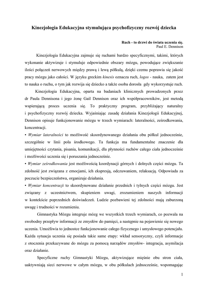 Kinezjologia Edukacyjna stymulująca psychofizyczny rozwój dziecka Ruch - to drzwi do świata uczenia się. Paul E. Dennison Kinezjologia Edukacyjna zajmuje się ruchami bardzo specyficznymi, takimi, których wykonanie aktywizuje i stymuluje odpowiednie obszary mózgu, powodujące zwiększanie ilości połączeń nerwowych między prawą i lewą półkulą, dzięki czemu poprawia się jakość pracy mózgu jako całości. W języku greckim kinesis oznacza ruch, logos - nauka, zatem jest to nauka o ruchu, o tym jak rozwija się dziecko a także osoba dorosła gdy wykorzystuje ruch. Kinezjologia Edukacyjna, oparta na badaniach klinicznych prowadzonych przez dr Paula Dennisona i jego żonę Gail Dennison oraz ich współpracowników, jest metodą wspierającą proces uczenia się. To praktyczny program, przybliżający naturalny i psychofizyczny rozwój dziecka. Wyjaśniając zasadę działania Kinezjologii Edukacyjnej, Dennison opisuje funkcjonowanie mózgu w trzech wymiarach: lateralności, ześrodkowania, koncentracji. ▪ Wymiar lateralności to możliwość skoordynowanego działania obu półkul jednocześnie, szczególnie w linii pola środkowego. Ta funkcja ma fundamentalne znaczenie dla umiejętności czytania, pisania, komunikacji, dla płynności ruchów całego ciała jednocześnie i możliwości uczenia się i poruszania jednocześnie. ▪ Wymiar ześrodkowania jest możliwością koordynacji górnych i dolnych części mózgu. Ta zdolność jest związana z emocjami, ich ekspresją, odczuwaniem, relaksacją. Odpowiada za poczucie bezpieczeństwa, organizuje działania. ▪ Wymiar koncentracji to skoordynowane działanie przednich i tylnych części mózgu. Jest związany z uczestnictwem, skupieniem uwagi, zrozumieniem naszych informacji w kontekście poprzednich doświadczeń. Ludzie pozbawieni tej zdolności mają zaburzoną uwagę i trudności w rozumieniu. Gimnastyka Mózgu integruje mózg we wszystkich trzech wymiarach, co pozwala na swobodny przepływ informacji ze zmysłów do pamięci, a następnie na pojawienie się nowego uczenia. Umożliwia to jednostce funkcjonowanie całego fizycznego i umysłowego potencjału. Każda sytuacja uczenia się posiada takie same etapy: wkład sensoryczny, czyli informacje z otoczenia przekazywane do mózgu za pomocą narządów zmysłów- integracja, asymilacja oraz działanie. Specyficzne ruchy Gimnastyki Mózgu, aktywizujące mięśnie obu stron ciała, uaktywniają sieci nerwowe w całym mózgu, w obu półkulach jednocześnie, wspomagając 1 każdy z w/w etapów. Ćwiczenia są efektywne dla każdego: dla dzieci i dla dorosłych. Integrując mózg poprawiają efektywne uczenie się i wyniki we wszystkich poznawczych przedsięwzięciach. Wpływają na poprawę komunikacji, usprawniają pamięć, koncentrację a przede wszystkim obniżają poziom stresu i w ten sposób mają związek z ogólnym stanem zdrowia [Hannaford, 1998]. Poniżej przedstawiono przykładowe ćwiczenia: ▪ Ruchy naprzemienne – w pozycji stojącej dotykanie prawą ręką uniesionego lewego kolana i na przemian lewą ręką prawego kolana. Może być też wykonywana w pozycji leżącej. Ćwiczenie to wzmaga aktywność organizmu, poprawia koordynację wzrokowo-ruchową, aktywizuje jednocześnie lewą i prawą półkulę mózgową. ▪ Leniwe ósemki – kreślenie kciukiem, płynnym ruchem poziomej ósemki, zaczynając od punktu środkowego na wysokości oczu w lewo. Ćwiczenie to koordynuje pracę obu półkul mózgowych. Poprawia płynność czytania, zapamiętywanie, myślenie. ▪ Rysowanie oburącz – rysowanie, bazgranie linii, figur, kształtów, z których każda rysowana jedną ręką jest zwierciadlanym odbiciem drugiej, rysowanej w tym samym czasie drugą ręką. Może być w powietrzu lub na dużej płaszczyźnie. Ćwiczenie poprawia pisanie, rysowanie, powoduje rozwój twórczego myślenia i zdolności plastycznych. ▪ Słoń – ręka wyciągnięta w przód grzbietem dłoni do góry, głowa przytulona uchem do ramienia, wzrok podąża ponad wierzchem dłoni za poruszającą się ręką. Pozycja stojąca, w małym rozkroku. Rysowanie ręką „Leniwych ósemek”. Ćwiczenie rozluźnia mięśnie szyi, oczu, poprawia pamięć, pomaga lepiej słuchać, aktywizuje zmysł równowagi, rozwija zdolności matematyczne, ułatwia wypowiadanie się. ▪ Pozycja Dennisona - pozycja siedząca, nogi skrzyżowane w kostkach, kolana lekko ugięte, ręce splecione, oczy zamknięte, język na podniebieniu. Ćwiczenie wpływa na poprawę koncentracji, stabilności emocjonalnej, wzmacnia poczucie własnej wartości. ▪ Punkty pozytywne - lekko dotyka się palcami punktów położonych na wypukłościach czoła, między brwiami a linią włosów, w połowie tej odległości. Ćwiczenie wpływa na racjonalne myślenie, odpręża, odblokowuje pamięć, ułatwia uczenie się, poprawia samopoczucie. ▪ Punkty na myślenie - kciukiem i palcem wskazującym, zgodnie z ruchem wskazówek zegara wykonuje się masaż punktów położonych poniżej i nieco na 2 zewnątrz początku obojczyka (dwustronnie). Druga ręka w tym czasie powinna masować okolice pępka. Ćwiczenie to powoduje dotlenienie mózgu, dotyk pępka przywraca równowagę i stabilizację całego ciała, ułatwia czytanie. ▪ Punkty równowagi - palcami prawej ręki należy dotknąć punktu za uchem, tuż poniżej wyrostka sutkowego, drugą rękę położyć na pępku, głowa prosto. Wykonujemy je 30 sekund. Potem zmiana rąk. Ćwiczenie ułatwia podejmowanie decyzji, koncentrację, myślenie skojarzeniowe, wyostrza zmysły. Poprawia umiejętność uczenia się, samopoczucie, poczucie równowagi, umiejętności potrzebne do gier sportowych. ▪ Aktywna ręka - wyciągniętą w górę przy głowie ręką stawia się opór naciskowi drugiej ręki, nacisk następuje przy wydechu w czterech kierunkach: do przodu 3x, do tyłu 3x, w kierunku głowy 3x, w kierunku przeciwnym 3x. Ćwiczenie odpręża mięśnie bark