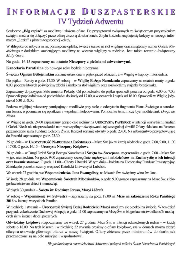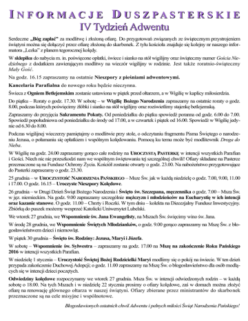 I N F O R M A C J E D U S Z PA S T E R S K I E IV Tydzień Adwentu Serdeczne „Bóg zapłać” za modlitwę i złożoną ofiarę. Do przygotowań związanych ze świątecznym przystrojeniem świątyni można się dołączyć przez ofiarę złożoną do skarbonek. Z tyłu kościoła znajduje się kolejny nr naszego informatora „Lezka” z planem tegorocznej kolędy. W sklepiku do nabycia m. in. poświęcone opłatki, świece i sianko na stół wigilijny oraz świąteczny numer Gościa Niedzielnego z dodatkiem zawierającym modlitwy na wieczór wigilijny w rodzinie. Jest także roratnio-świąteczny Mały Gość. Na godz. 16.15 zapraszamy na ostatnie Nieszpory z pieśniami adwentowymi. Kancelaria Parafialna do nowego roku będzie nieczynna. Świeca z Ogniem Betlejemskim zostanie ustawiona w piątek przed ołtarzem, a w Wigilię w kaplicy miłosierdzia. Do piątku – Roraty o godz. 17.30. W sobotę – w Wigilię Bożego Narodzenia zapraszamy na ostatnie roraty o godz. 8.00, podczas których poświęcimy żłóbki i sianko na stół wigilijny oraz rozświetlimy stajenkę betlejemską. Zapraszamy do przyjęcia Sakramentu Pokuty. Od poniedziałku do piątku spowiedź poranna od godz. 6.00 do 7.00. Spowiedź popołudniowa od poniedziałku do środy od 17.00, a w czwartek i piątek od 16.00. Spowiedź w Wigilię jedynie od 6.30 do 8.00. Podczas wigilijnej wieczerzy pamiętajmy o modlitwie przy stole, o odczytaniu fragmentu Pisma Świętego o narodzeniu Jezusa, o połamaniu się opłatkiem i wspólnym kolędowaniu. Pomocą ku temu może być modlitewnik Droga do Nieba. W Wigilię na godz. 24.00 zapraszamy gorąco całe rodziny na UROCZYSTĄ PASTERKĘ w intencji wszystkich Parafian i Gości. Niech nic nie przeszkodzi nam we wspólnym świętowaniu tej szczególnej chwili! Ofiary składane na Pasterce przeznaczone są na Fundusz Ochrony Życia. Kościół zostanie otwarty o godz. 23.00. Na nabożeństwo przygotowujące do Pasterki zapraszamy o godz. 23.30. 25 grudnia – w UROCZYSTOŚĆ NARODZENIA PAŃSKIEGO – Msze Św. jak w każdą niedzielę o godz. 7.00, 9.00, 11.00 i 17.00. O godz. 16.15 – Uroczyste Nieszpory Kolędowe. 26 grudnia – w Drugi Dzień Świąt Bożego Narodzenia i Święto św. Szczepana, męczennika o godz. 7.00 – Msza Św. w jęz. niemieckim. Na godz. 9.00 zapraszamy szczególnie mężczyzn i młodzieńców na Eucharystię w ich intencji oraz kazanie stanowe. O godz. 11.00 – Chrzty i Roczki. W tym dniu – kolekta na Diecezjalny Fundusz Inwestycyjny. Zbiórką do puszek możemy wesprzeć Katolicki Uniwersytet Lubelski. We wtorek 27 grudnia, we Wspomnienie św. Jana Ewangelisty, na Mszach Św. święcimy wino św. Jana. W środę 28 grudnia, we Wspomnienie Świętych Młodzianków, o godz. 9.00 gorąco zapraszamy na Mszę Św. z błogosławieństwem dzieci i niemowląt. W piątek 30 grudnia – Święto św. Rodziny: Jezusa, Maryi i Józefa. W sobotę – Wspomnienie św. Sylwestra – zapraszamy na godz. 17.00 na Mszę na zakończenie Roku Pańskiego 2016 w intencji wszystkich Parafian. W niedzielę 1 stycznia – Uroczystość Świętej Bożej Rodzicielki Maryi modlimy się o pokój na świecie. W ten dzień przypada zakończenie Duchowej Adopcji; o godz. 11.00 zapraszamy na Mszę Św. o błogosławieństwo dla osób modlących się w intencji dzieci poczętych. Odwiedziny kolędowe rozpoczynamy we wtorek 27 grudnia. Msza Św. w intencji odwiedzonych rodzin – w każdą sobotę o 18.00. Na tych Mszach i w niedzielę 22 stycznia prosimy o ofiary kolędowe, zaś w domach można złożyć ofiarę na renowację głównego ołtarza w naszej świątyni. Ofiary zbierane przez ministrantów do skarbonek przeznaczone są na cele misyjne i wspólnotowe. Błogosławionych ostatnich chwil Adwentu i pełnych miłości Świąt Narodzenia Pańskiego!