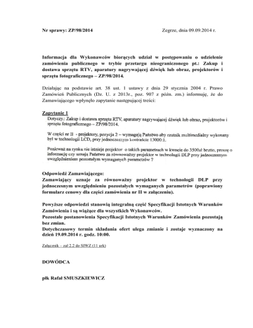 Nr sprawy: ZP/98/2014 Zegrze, dnia 09.09.2014 r. Informacja dla