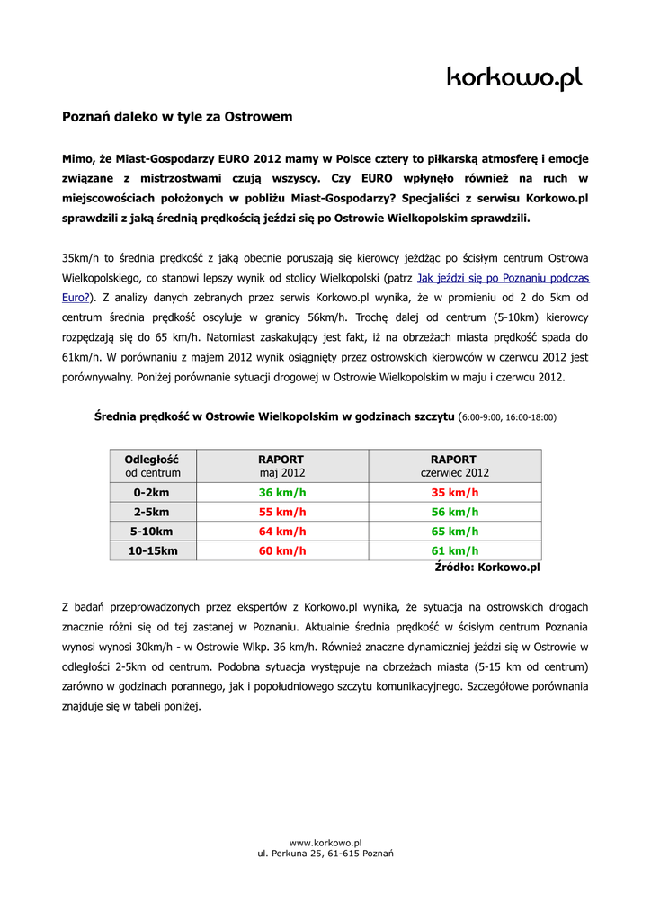 Poznań daleko w tyle za Ostrowem Mimo, że Miast-Gospodarzy EURO 2012 mamy w Polsce cztery to piłkarską atmosferę i emocje związane z mistrzostwami czują wszyscy. Czy EURO wpłynęło również na ruch w miejscowościach położonych w pobliżu Miast-Gospodarzy? Specjaliści z serwisu Korkowo.pl sprawdzili z jaką średnią prędkością jeździ się po Ostrowie Wielkopolskim sprawdzili. 35km/h to średnia prędkość z jaką obecnie poruszają się kierowcy jeżdżąc po ścisłym centrum Ostrowa Wielkopolskiego, co stanowi lepszy wynik od stolicy Wielkopolski (patrz Jak jeździ się po Poznaniu podczas Euro?). Z analizy danych zebranych przez serwis Korkowo.pl wynika, że w promieniu od 2 do 5km od centrum średnia prędkość oscyluje w granicy 56km/h. Trochę dalej od centrum (5-10km) kierowcy rozpędzają się do 65 km/h. Natomiast zaskakujący jest fakt, iż na obrzeżach miasta prędkość spada do 61km/h. W porównaniu z majem 2012 wynik osiągnięty przez ostrowskich kierowców w czerwcu 2012 jest porównywalny. Poniżej porównanie sytuacji drogowej w Ostrowie Wielkopolskim w maju i czerwcu 2012. Średnia prędkość w Ostrowie Wielkopolskim w godzinach szczytu (6:00-9:00, 16:00-18:00) Odległość od centrum RAPORT maj 2012 RAPORT czerwiec 2012 0-2km 36 km/h 35 km/h 2-5km 55 km/h 56 km/h 5-10km 64 km/h 65 km/h 10-15km 60 km/h 61 km/h Źródło: Korkowo.pl Z badań przeprowadzonych przez ekspertów z Korkowo.pl wynika, że sytuacja na ostrowskich drogach znacznie różni się od tej zastanej w Poznaniu. Aktualnie średnia prędkość w ścisłym centrum Poznania wynosi wynosi 30km/h - w Ostrowie Wlkp. 36 km/h. Również znaczne dynamiczniej jeździ się w Ostrowie w odległości 2-5km od centrum. Podobna sytuacja występuje na obrzeżach miasta (5-15 km od centrum) zarówno w godzinach porannego, jak i popołudniowego szczytu komunikacyjnego. Szczegółowe porównania znajduje się w tabeli poniżej. www.korkowo.pl ul. Perkuna 25, 61-615 Poznań Średnie prędkości w godzinach szczytu w Ostrowie Wielkopolskim i Poznaniu* Odległość od centrum Ostrów Wielkopolski czerwiec 2012 Poznań czerwiec 2012 0-2km 35 km/h 30 km/h 2-5km 56 km/h 39 km/h 5-10km 65 km/h 45 km/h 10-15km 61 km/h 51 km/h Źródło: Korkowo.pl * badania dotyczą sytuacji drogowej w czerwcu 2012 w godziny szczytu (6:00-9:00, 16:00-18:00) Dane o sytuacji drogowej zostały opracowane przez serwis Korkowo.pl, który prezentuje aktualne informacje o korkach na polskich drogach. Analizie poddano dane GPS z urządzeń Yanosik umieszczonych w pojazdach poruszających się w ścisłym centrum Ostrowa Wielkopolskiego i po głównych trasach wyjazdowych z miasta w godzinach od 06:00 do 22:00 w maju i czerwcu 2012. W promieniu do 2km od ścisłego centrum przeanalizowano prędkości z jakimi poruszają się kierowcy po wszystkich ulicach. W odległości 2-15 km od ścisłego centrum zbadano główne trasy dojazdowe do centrum miast. ------------------------------Dystrybucja materiałów: Katarzyna Florkowska [email protected] kom./+48/ 519-181-900 www.korkowo.pl ul. Perkuna 25, 61-615 Poznań