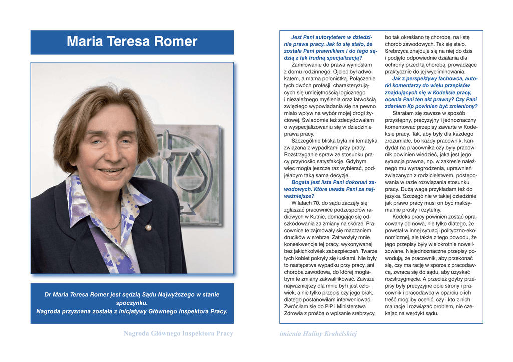 Maria Teresa Romer Dr Maria Teresa Romer jest sędzią Sądu Najwyższego w stanie spoczynku. Nagroda przyznana została z inicjatywy Głównego Inspektora Pracy. Nagroda Głównego Inspektora Pracy Jest Pani autorytetem w dziedzinie prawa pracy. Jak to się stało, że została Pani prawnikiem i do tego sędzią z tak trudną specjalizacją? Zamiłowanie do prawa wyniosłam z domu rodzinnego. Ojciec był adwokatem, a mama polonistką. Połączenie tych dwóch profesji, charakteryzujących się umiejętnością logicznego i niezależnego myślenia oraz łatwością zwięzłego wypowiadania się na pewno miało wpływ na wybór mojej drogi życiowej. Świadomie też zdecydowałam o wyspecjalizowaniu się w dziedzinie prawa pracy. Szczególnie bliska była mi tematyka związana z wypadkami przy pracy. Rozstrzyganie spraw ze stosunku pracy przynosiło satysfakcję. Gdybym więc mogła jeszcze raz wybierać, podjęłabym taką samą decyzję. Bogata jest lista Pani dokonań zawodowych. Które uważa Pani za najważniejsze? W latach 70. do sądu zaczęły się zgłaszać pracownice podzespołów radiowych w Kutnie, domagając się odszkodowania za zmiany na skórze. Pracownice te zajmowały się maczaniem drucików w srebrze. Zatrwożyły mnie konsekwencje tej pracy, wykonywanej bez jakichkolwiek zabezpieczeń. Twarze tych kobiet pokryły się łuskami. Nie były to następstwa wypadku przy pracy, ani choroba zawodowa, do której mogłabym te zmiany zakwalifikować. Zawsze najważniejszy dla mnie był i jest człowiek, a nie tylko przepis czy jego brak, dlatego postanowiłam interweniować. Zwróciłam się do PIP i Ministerstwa Zdrowia z prośbą o wpisanie srebrzycy, imienia Haliny Krahelskiej bo tak określano tę chorobę, na listę chorób zawodowych. Tak się stało. Srebrzyca znajduje się na niej do dziś i podjęto odpowiednie działania dla ochrony przed tą chorobą, prowadzące praktycznie do jej wyeliminowania. Jak z perspektywy fachowca, autorki komentarzy do wielu przepisów znajdujących się w Kodeksie pracy, ocenia Pani ten akt prawny? Czy Pani zdaniem Kp powinien być zmieniony? Starałam się zawsze w sposób przystępny, precyzyjny i jednoznaczny komentować przepisy zawarte w Kodeksie pracy. Tak, aby były dla każdego zrozumiałe, bo każdy pracownik, kandydat na pracownika czy były pracownik powinien wiedzieć, jaka jest jego sytuacja prawna, np. w zakresie należnego mu wynagrodzenia, uprawnień związanych z rodzicielstwem, postępowania w razie rozwiązania stosunku pracy. Dużą wagę przykładam też do języka. Szczególnie w takiej dziedzinie jak prawo pracy musi on być maksymalnie prosty i czytelny. Kodeks pracy powinien zostać opracowany od nowa, nie tylko dlatego, że powstał w innej sytuacji polityczno-ekonomicznej, ale także z tego powodu, że jego przepisy były wielokrotnie nowelizowane. Niejednoznaczne przepisy powodują, że pracownik, aby przekonać się, czy ma rację w sporze z pracodawcą, zwraca się do sądu, aby uzyskać rozstrzygnięcie. A przecież gdyby przepisy były precyzyjne obie strony i pracownik i pracodawca w oparciu o ich treść mogliby ocenić, czy i kto z nich ma rację i rozwiązać problem, nie czekając na werdykt sądu.