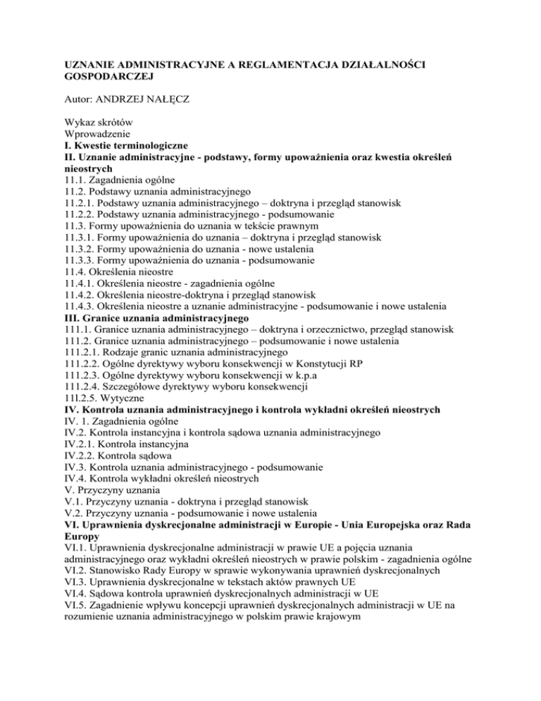 UZNANIE ADMINISTRACYJNE A REGLAMENTACJA DZIAŁALNOŚCI GOSPODARCZEJ Autor: ANDRZEJ NAŁĘCZ Wykaz skrótów Wprowadzenie I. Kwestie terminologiczne II. Uznanie administracyjne - podstawy, formy upoważnienia oraz kwestia określeń nieostrych 11.1. Zagadnienia ogólne 11.2. Podstawy uznania administracyjnego 11.2.1. Podstawy uznania administracyjnego – doktryna i przegląd stanowisk 11.2.2. Podstawy uznania administracyjnego - podsumowanie 11.3. Formy upoważnienia do uznania w tekście prawnym 11.3.1. Formy upoważnienia do uznania – doktryna i przegląd stanowisk 11.3.2. Formy upoważnienia do uznania - nowe ustalenia 11.3.3. Formy upoważnienia do uznania - podsumowanie 11.4. Określenia nieostre 11.4.1. Określenia nieostre - zagadnienia ogólne 11.4.2. Określenia nieostre-doktryna i przegląd stanowisk 11.4.3. Określenia nieostre a uznanie administracyjne - podsumowanie i nowe ustalenia III. Granice uznania administracyjnego 111.1. Granice uznania administracyjnego – doktryna i orzecznictwo, przegląd stanowisk 111.2. Granice uznania administracyjnego – podsumowanie i nowe ustalenia 111.2.1. Rodzaje granic uznania administracyjnego 111.2.2. Ogólne dyrektywy wyboru konsekwencji w Konstytucji RP 111.2.3. Ogólne dyrektywy wyboru konsekwencji w k.p.a 111.2.4. Szczegółowe dyrektywy wyboru konsekwencji 11l.2.5. Wytyczne IV. Kontrola uznania administracyjnego i kontrola wykładni określeń nieostrych IV. 1. Zagadnienia ogólne IV.2. Kontrola instancyjna i kontrola sądowa uznania administracyjnego IV.2.1. Kontrola instancyjna IV.2.2. Kontrola sądowa IV.3. Kontrola uznania administracyjnego - podsumowanie IV.4. Kontrola wykładni określeń nieostrych V. Przyczyny uznania V.1. Przyczyny uznania - doktryna i przegląd stanowisk V.2. Przyczyny uznania - podsumowanie i nowe ustalenia VI. Uprawnienia dyskrecjonalne administracji w Europie - Unia Europejska oraz Rada Europy VI.1. Uprawnienia dyskrecjonalne administracji w prawie UE a pojęcia uznania administracyjnego oraz wykładni określeń nieostrych w prawie polskim - zagadnienia ogólne VI.2. Stanowisko Rady Europy w sprawie wykonywania uprawnień dyskrecjonalnych VI.3. Uprawnienia dyskrecjonalne w tekstach aktów prawnych UE VI.4. Sądowa kontrola uprawnień dyskrecjonalnych administracji w UE VI.5. Zagadnienie wpływu koncepcji uprawnień dyskrecjonalnych administracji w UE na rozumienie uznania administracyjnego w polskim prawie krajowym VII. Koncesje VII. 1. Koncesje - zagadnienia ogólne VII.2. Przepisy ogólne o koncesjach w u.s.d.g VII.2.1. Ogólna charakterystyka VII.2.2. Uznanie w przepisach ogólnych o koncesjach VII.2.3. Określenia nieostre w przepisach ogólnych o koncesjach VII.3. Uznanie i określenia nieostre w ustawach szczegółowych VII.3.1. Ogólna charakterystyka VII.3.2. Stosunek ustaw szczegółowych do przepisów ogólnych u.s.d.g VII.3.3. Uznanie w ustawach szczegółowych VII.3.4. Określenia nieostre w przepisach szczególnych o koncesjach VII.3.5. Ustawa - Prawo lotnicze oraz rozporządzenie nr 2407/92/EWG - problem bezpośredniego stosowania przepisów prawa UE VII.3.6. Ustawa o grach hazardowych - przestroga przed legislacyjnym pośpiechem VII.4. Wnioski dotyczące uznania administracyjnego i określeń nieostrych w przepisach o koncesjach VIII. Zezwolenia, licencje i zgody na działalność gospodarczą VIII. 1. Zezwolenia, licencje i zgody na działalność gospodarczą - zagadnienia ogólne VIII.2. Zezwolenia, licencje i zgody a uznanie administracyjne VIII.2.1. Zezwolenia, licencje i zgody a uznanie administracyjne - zagadnienia ogólne VIII.2.2. Upoważnienia do uznania w przepisach o zezwoleniach, licencjach i zgodach VIII.2.3. Dyrektywy wyboru konsekwencji VIII.3. Zezwolenia, licencje i zgody a określenia nieostre VIII.3.1. Zezwolenia, licencje i zgody a określenia nieostre - zagadnienia ogólne VIII.3.2. Określenia nieostre odnoszące się do wnioskodawcy lub podmiotu posiadającego zezwolenie VIII.3.3. Określenia nieostre odnoszące się do planowanej lub prowadzonej działalności gospodarczej Vlll.4. Wnioski dotyczące upoważnień do uznania oraz określeń nieostrych stosowanych w przepisach o zezwoleniach, licencjach i zgodach IX. Działalność regulowana IX.1. Działalność regulowana - zagadnienia ogólne IX.2. Uznanie administracyjne i określenia nieostre a działalność regulowana IX.2.1. Uznanie administracyjne i określenia nieostre a działalność regulowana - przepisy ogólne IX.2.2. Uznanie administracyjne i określenia nieostre a działalność regulowana - ustawy szczegółowe IX.2.3. Rażące naruszenie warunków wymaganych do wykonywania działalności regulowanej IX.3. Wnioski dotyczące uznania i określeń nieostrych w przepisach poświęconych działalności regulowanej Podsumowanie Wykaz powoływanych aktów prawnych Akty prawa krajowego Akty prawa Unii Europejskiej Inne akty Wykaz powoływanych orzeczeń sądowych Orzeczenia sądów krajowych Najwyższy Trybunał Administracyjny Naczelny Sąd Administracyjny i wojewódzkie sądy administracyjne Trybunał Konstytucyjny Orzeczenia sądów europejskich Opracowania