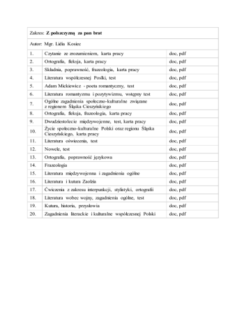 Zakres: Z polszczyzną za pan brat Autor: Mgr. Lidia Kosiec 1. Czytanie ze zrozumieniem, karta pracy doc, pdf 2. Ortografia, fleksja, karta pracy doc, pdf 3. Składnia, poprawność, frazeologia, karta pracy doc, pdf 4. Literatura współczesnej Poslki, test doc, pdf 5. Adam Mickiewicz - poeta romantyczny, test doc, pdf 6. Literatura romantyzmu i pozytywizmu, wstępny test doc, pdf 7. Ogólne zagadnienia społeczno-kulturalne związane z regionem Śląska Cieszyńskiego doc, pdf 8. Ortografia, fleksja, frazeologia, karta pracy doc, pdf 9. Dwudziestolecie międzywojenne, test, karta pracy doc, pdf 11. Życie społeczno-kulturalne Polski oraz regionu Śląska Cieszyńskiego, karta pracy Literatura oświecenia, test 12. Nowele, test doc, pdf 13. Ortografia, poprawność językowa doc, pdf 14. Frazeologia doc, pdf 15. Literatura międzywojenna i zagadnienia ogólne doc, pdf 16. Literatura i kutura Zaolzia doc, pdf 17. Ćwiczenia z zakresu interpunkcji, stylistyki, ortografii doc, pdf 18. Literatura wobec wojny, zagadnienia ogólne, test doc, pdf 19. Kutura, historia, przysłowia doc, pdf 20. Zagadnienia literackie i kulturalne współczesnej Polski doc, pdf 10. doc, pdf doc, pdf