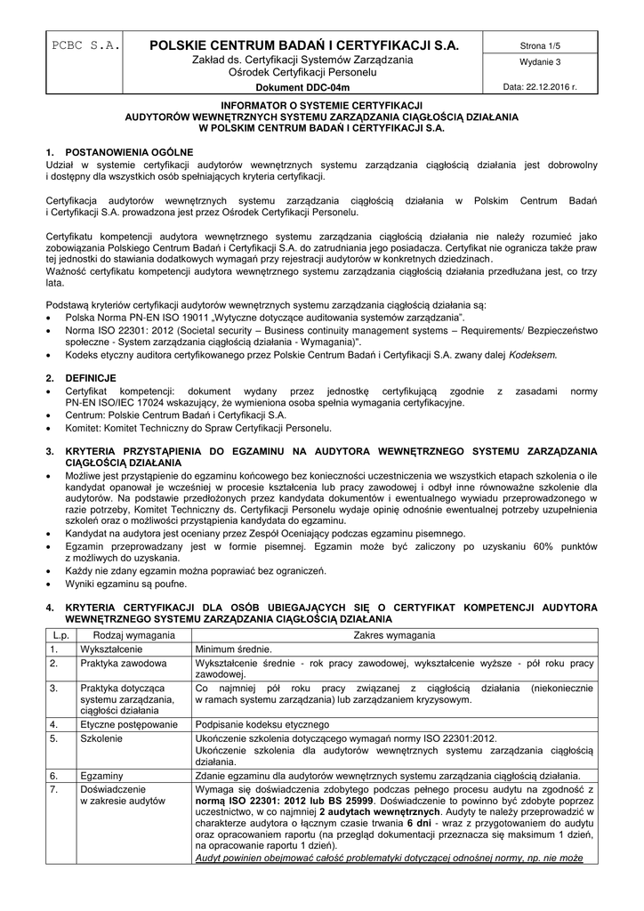 PCBC S.A. POLSKIE CENTRUM BADAŃ I CERTYFIKACJI S.A. Strona 1/5 Zakład ds. Certyfikacji Systemów Zarządzania Ośrodek Certyfikacji Personelu Wydanie 3 Dokument DDC-04m Data: 22.12.2016 r. INFORMATOR O SYSTEMIE CERTYFIKACJI AUDYTORÓW WEWN TRZNYCH SYSTEMU ZARZ DZANIA CI GŁO CI DZIAŁANIA W POLSKIM CENTRUM BADAŃ I CERTYFIKACJI S.A. 1. POSTANOWIENIA OGÓLNE Udział w systemie certyfikacji audytorów wewnętrznych systemu zarządzania ciągłością działania jest dobrowolny i dostępny dla wszystkich osób spełniających kryteria certyfikacji. Certyfikacja audytorów wewnętrznych systemu zarządzania ciągłością i Certyfikacji S.A. prowadzona jest przez Ośrodek Certyfikacji Personelu. działania w Polskim Centrum Badań Certyfikatu kompetencji audytora wewnętrznego systemu zarządzania ciągłością działania nie nale y rozumieć jako zobowiązania Polskiego Centrum Badań i Certyfikacji S.A. do zatrudniania jego posiadacza. Certyfikat nie ogranicza tak e praw tej jednostki do stawiania dodatkowych wymagań przy rejestracji audytorów w konkretnych dziedzinach. Wa ność certyfikatu kompetencji audytora wewnętrznego systemu zarządzania ciągłością działania przedłu ana jest, co trzy lata. Podstawą kryteriów certyfikacji audytorów wewnętrznych systemu zarządzania ciągłością działania są: Polska Norma PN-źN ISO 19011 „Wytyczne dotyczące auditowania systemów zarządzania”. Norma ISO 22301: 2012 (Societal security – Business continuity management systems – Requirements/ Bezpieczeństwo społeczne - System zarządzania ciągłością działania - Wymagania)". Kodeks etyczny auditora certyfikowanego przez Polskie Centrum Badań i Certyfikacji S.A. zwany dalej Kodeksem. 2. 3. 4. DEFINICJE Certyfikat kompetencji: dokument wydany przez jednostkę certyfikującą zgodnie PN-źN ISO/IźC 17024 wskazujący, e wymieniona osoba spełnia wymagania certyfikacyjne. Centrum: Polskie Centrum Badań i Certyfikacji S.A. Komitet: Komitet Techniczny do Spraw Certyfikacji Personelu. normy KRYTERIA CERTYFIKACJI DLA OSÓB UBIEGAJ CYCH SI O CERTYFIKAT KOMPETENCJI AUDYTORA WEWN TRZNEGO SYSTEMU ZARZ DZANIA CI GŁO CI DZIAŁANIA Rodzaj wymagania Wykształcenie Praktyka zawodowa 3. Praktyka dotycząca systemu zarządzania, ciągłości działania źtyczne postępowanie Szkolenie 6. 7. zasadami KRYTERIA PRZYST PIENIA DO EGZAMINU NA AUDYTORA WEWN TRZNEGO SYSTEMU ZARZ DZANIA CI GŁO CI DZIAŁANIA Mo liwe jest przystąpienie do egzaminu końcowego bez konieczności uczestniczenia we wszystkich etapach szkolenia o ile kandydat opanował je wcześniej w procesie kształcenia lub pracy zawodowej i odbył inne równowa ne szkolenie dla audytorów. Na podstawie przedło onych przez kandydata dokumentów i ewentualnego wywiadu przeprowadzonego w razie potrzeby, Komitet Techniczny ds. Certyfikacji Personelu wydaje opinię odnośnie ewentualnej potrzeby uzupełnienia szkoleń oraz o mo liwości przystąpienia kandydata do egzaminu. Kandydat na audytora jest oceniany przez Zespół Oceniający podczas egzaminu pisemnego. Egzamin przeprowadzany jest w formie pisemnej. źgzamin mo e być zaliczony po uzyskaniu 60% punktów z mo liwych do uzyskania. Ka dy nie zdany egzamin mo na poprawiać bez ograniczeń. Wyniki egzaminu są poufne. L.p. 1. 2. 4. 5. z Egzaminy Doświadczenie w zakresie audytów Zakres wymagania Minimum średnie. Wykształcenie średnie - rok pracy zawodowej, wykształcenie wy sze - pół roku pracy zawodowej. Co najmniej pół roku pracy związanej z ciągłością działania (niekoniecznie w ramach systemu zarządzania) lub zarządzaniem kryzysowym. Podpisanie kodeksu etycznego Ukończenie szkolenia dotyczącego wymagań normy ISO 22301:2012. Ukończenie szkolenia dla audytorów wewnętrznych systemu zarządzania ciągłością działania. Zdanie egzaminu dla audytorów wewnętrznych systemu zarządzania ciągłością działania. Wymaga się doświadczenia zdobytego podczas pełnego procesu audytu na zgodność z norm ISO 22301Ś 2012 lub BS 25999. Doświadczenie to powinno być zdobyte poprzez uczestnictwo, w co najmniej 2 audytach wewn trznych. Audyty te nale y przeprowadzić w charakterze audytora o łącznym czasie trwania 6 dni - wraz z przygotowaniem do audytu oraz opracowaniem raportu (na przegląd dokumentacji przeznacza się maksimum 1 dzień, na opracowanie raportu 1 dzień). Audyt powinien obejmować całość problematyki dotyczącej odnośnej normy, np. nie mo e POLSKIE CENTRUM BADAŃ I CERTYFIKACJI S.A. PCBC S.A. Strona 2/5 Zakład ds. Certyfikacji Systemów Zarządzania Ośrodek Certyfikacji Personelu Wydanie 3 Dokument DDC-04m Data: 22.12.2016 r. być to audyt dotyczący jednego wybranego punktu normy. Udział w audytach wewnętrznych powinien być potwierdzony przez Pełnomocnika lub Dyrektora organizacji, na zlecenie, której audyt był wykonywany. Audyty dostawców powinna potwierdzić osoba (Pełnomocnik lub Dyrektor firmy), która zarządza takimi audytami, natomiast audyty na rzecz jednostki certyfikującej powinien potwierdzić upowa niony przedstawiciel danej jednostki certyfikującej. Potwierdzając udział w audycie nale y podać datę audytu, charakter w jakim osoba brała udział w audycie (audytor wiodący, audytor techniczny, audytor), rodzaj audytu (np. wewnętrzny, zewnętrzny, dostawcy), normę na zgodność, z którą audyt był prowadzony oraz miejsce jego realizacji. Centrum mo e wydać certyfikat kompetencji audytora osobom posiadającym wa ne certyfikaty kompetencji wydane przez inne organizacje, z którymi Centrum zawarło porozumienie (dwu- lub wielostronne) o wzajemnym uznawaniu certyfikatów kompetencji audytora. Proces certyfikacji przy wydaniu certyfikatu kompetencji audytora odbywa się w trybie rutynowym lub specjalnym. Tryb rutynowy Wydanie certyfikatu kompetencji audytora wewnętrznego systemu zarządzania ciągłością działania 5. osoba ukończyła pełny cykl szkolenia, zdała wymagany egzamin zgodnie z wymaganym programe