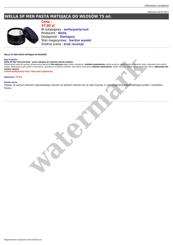 Informacje o produkcie Utworzono 04-03-2017 WELLA SP MEN PASTA MATUJĄCA DO WŁOSÓW 75 ml. Cena : 37,00 zł Nr katalogowy : wella/pasta/mat Producent : Wella Dostępność : Dostępny Stan magazynowy : bardzo wysoki Średnia ocena : brak recenzji WELLA SP MEN PASTA MATUJĄCA DO WŁOSÓW Pojemność: er m ar k Opis Produktu: Wella SP Men Textured Style - pasta matująca do stylizacji włosów męskich. Matowa pasta pasta do stylizacji przeznaczona specjalnie dla mężczyzn dająca lekkie utrwalenie z efektem zmatowienia, szybko wysycha, nadaje kształt powierzchni włosa, odpowiedni dla cienkich włosów. Skład pasty oparty został o nowoczesne, sprawdzone w działaniu składniki. Daje lekkie utrwalenie z efektem zmatowienia, szybko wysycha, nadaje kształt powierzchni włosa, odpowiedni dla cienkich włosów. Produkt profesjonalny nowy i fabrycznie zapakowany. 75 ml Sposób użycia: w at Używać na suchych włosach rozprowadzając palcami na sekcjach włosów lub na całej fryzurze, w celu osiągnięcia indywidualnego kształtu i charakteru fryzury. Wygenerowano w programie www.oscGold.com