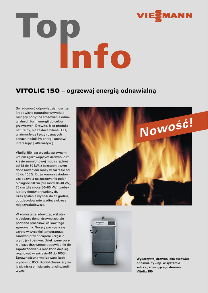 VITOLIG 150 – ogrzewaj energią odnawialną Świadomość odpowiedzialności za środowisko naturalne wywołuje rosnący popyt na stosowanie odnawialnych form energii do celów grzewczych. Drewno, jako produkt naturalny, nie zakłóca bilansu CO2 w atmosferze i przy rosnących cenach nośników energii stanowi interesującą alternatywę. ! ć ś o N ow Vitolig 150 jest wysokosprawnym kotłem zgazowującym drewno, o zakresie znamionowej mocy cieplnej od 18 do 80 kW, z bezstopniowym dopasowaniem mocy w zakresie od 40 do 100%. Duża komora załadowcza pozwala na zgazowanie polan o długości 50 cm (dla mocy 18–40 kW), 75 cm (dla mocy 60–80 kW), zrębek lub brykietów drewnianych. Czas spalania wynosi do 12 godzin, co zdecydowanie wydłuża okresy międzyzaładowcze. W komorze załadowczej, wskutek niedoboru tlenu, drewno zostaje poddane procesowi całkowitego zgazowania. Gorący gaz spala się czysto w wysokiej temperaturze, zarówno przy obciążeniu częściowym, jak i pełnym. Dzięki generowaniu gazu drzewnego odpowiednio do zapotrzebowania moc kotła daje się regulować w zakresie 40 do 100%. Sprawność znormalizowana kotła wynosi do 85%. Kocioł charakteryzuje się niską emisją substancji szkodliwych. Wykorzystaj drewno jako surowiec odnawialny – np. w systemie kotła zgazowującego drewno Vitolig 150 Dla każdych wymagań odpowiedni system na paliwo stałe Elektroniczny regulator kotła Proces spalania regulowany jest przez prosty w obsłudze elektroniczny regulator kotła z czujnikiem temperatury pomieszczenia. Wyposażony jest on w funkcję sygnalizacji braku opału. Vitolig 150 Kocioł zgazowujący drewno Przegląd zalet: Wysokosprawny kocioł zgazowujący drewno: duża komora załadowcza pozwala na zgazowanie polan o długości 50 cm (dla mocy 18–40 kW), 75 cm (dla mocy 60–80 kW), zrębek lub brykietów drewnianych; Wysokowydajny wentylator nadmuchowy o regulowanych obrotach w zakresie od 40 do 100%; Praca modulowana z optymalnym dopasowaniem do aktualnego zapotrzebowania cieplnego; Optymalizacja procesu spalania zapewnia sprawność znormalizowaną do 85% oraz niską emisję substancji szkodliwych; Brak uciążliwych woni dzięki hermetycznej konstrukcji komory załadowczej i komory spalania; Duża komora załadowcza zapewniająca długi czas spalania do 12 godzin bez uzupełniania opału; Proste, mechaniczne czyszczenie powierzchni grzewczych, dzięki zintegrowanym szczotkom czyszczącym; Zakres znamionowej mocy cieplnej od 18 do 80 kW. Przekrój schematyczny kotła Vitolig 150 Twój Zakład Instalatorski: Zmiany techniczne zastrzeżone T002 17 PL 07/2004 Prosty w obsłudze, elektroniczny regulator kotła z czujnikiem temperatury pomieszczenia; Elektroniczny regulator kotła z czujnikiem temperatury pomieszczenia