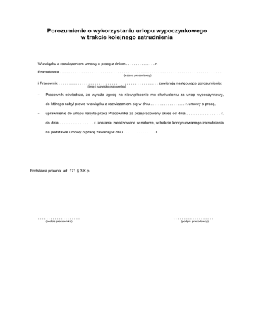 Porozumienie o wykorzystaniu urlopu wypoczynkowego w trakcie kolejnego zatrudnienia W związku z rozwiązaniem umowy o pracę z dniem . . . . . . . . . . . . . . . r. Pracodawca . . . . . . . . . . . . . . . . . . . . . . . . . . . . . . . . . . . . . . . . . . . . . . . . . . . . . . . . . . . . . . . . . . . . . . . . . . . . (nazwa pracodawcy) i Pracownik . . . . . . . . . . . . . . . . . . . . . . . . . . . . . . . . . . . . . . . . . . . . . . . zawierają następujące porozumienie: (imię i nazwisko pracownika) - Pracownik oświadcza, że wyraża zgodę na niewypłacenie mu ekwiwalentu za urlop wypoczynkowy, do którego nabył prawo w związku z rozwiązaniem się w dniu . . . . . . . . . . . . . . . . . . r. umowy o pracę, - uprawnienie do urlopu nabyte przez Pracownika za przepracowany okres od dnia . . . . . . . . . . . . . . . r. do dnia . . . . . . . . . . . . . . . r. zostanie zrealizowane w naturze, w trakcie kontynuowanego zatrudnienia na podstawie umowy o pracę zawartej w dniu . . . . . . . . . . . . . . . r. Podstawa prawna: art. 171 § 3 K.p. .................... (podpis pracownika) ................... (podpis pracodawcy)
