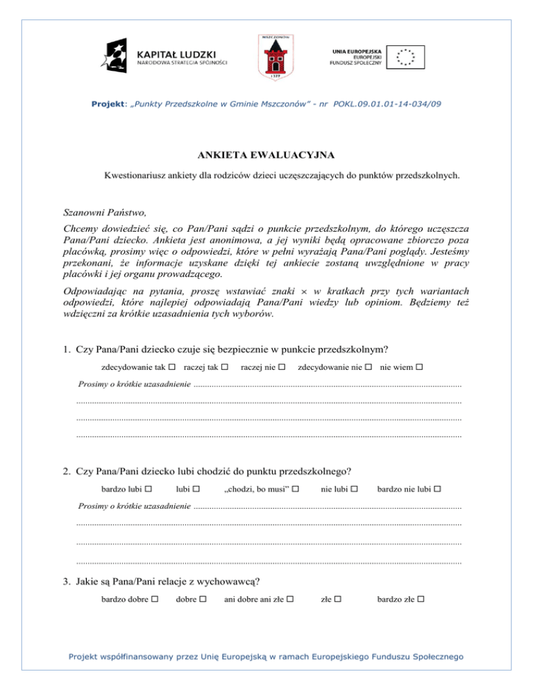 Projekt: „Punkty Przedszkolne w Gminie Mszczonów” - nr POKL.09.01.01-14-034/09 ANKIETA EWALUACYJNA Kwestionariusz ankiety dla rodziców dzieci uczęszczających do punktów przedszkolnych. Szanowni Państwo, Chcemy dowiedzieć się, co Pan/Pani sądzi o punkcie przedszkolnym, do którego uczęszcza Pana/Pani dziecko. Ankieta jest anonimowa, a jej wyniki będą opracowane zbiorczo poza placówką, prosimy więc o odpowiedzi, które w pełni wyrażają Pana/Pani poglądy. Jesteśmy przekonani, że informacje uzyskane dzięki tej ankiecie zostaną uwzględnione w pracy placówki i jej organu prowadzącego. Odpowiadając na pytania, proszę wstawiać znaki w kratkach przy tych wariantach odpowiedzi, które najlepiej odpowiadają Pana/Pani wiedzy lub opiniom. Będziemy też wdzięczni za krótkie uzasadnienia tych wyborów. 1. Czy Pana/Pani dziecko czuje się bezpiecznie w punkcie przedszkolnym? zdecydowanie tak raczej tak raczej nie zdecydowanie nie nie wiem Prosimy o krótkie uzasadnienie ....................................................................................................................... ........................................................................................................................................................................... ........................................................................................................................................................................... ........................................................................................................................................................................... 2. Czy Pana/Pani dziecko lubi chodzić do punktu przedszkolnego? bardzo lubi lubi „chodzi, bo musi” nie lubi bardzo nie lubi Prosimy o krótkie uzasadnienie ....................................................................................................................... ........................................................................................................................................................................... ........................................................................................................................................................................... ........................................................................................................................................................................... 3. Jakie są Pana/Pani relacje z wychowawcą? bardzo dobre dobre ani dobre ani złe złe bardzo złe Projekt współfinansowany przez Unię Europejską w ramach Europejskiego Funduszu Społecznego 4. Czy wychowawca chętnie wyjaśnia dzieciom, odpowiada na ich pytania, pomaga, gdy coś jest szczególnie trudne? zdecydowanie tak raczej tak raczej nie zdecydowanie nie nie wiem Prosimy o krótkie uzasadnienie ........................................................................................................................ ........................................................................................................................................................................... ........................................................................................................................................................................... ........................................................................................................................................................................... 5. Czy zajęcia są ciekawe i urozmaicone? zdecydowanie tak raczej tak raczej nie zdecydowanie nie nie wiem Prosimy o krótkie uzasadnienie ........................................................................................................................ ........................................................................................................................................................................... ........................................................................................................................................................................... ........................................................................................................................................................................... 6. Czy oferta zajęć z psychologiem i logopedą mająca na celu udzielanie pomocy psychologiczno – pedagogicznej dzieciom i wspomaganie rodziców odpowiada Pana/Pani oczekiwaniom? zdecydowanie tak raczej tak raczej nie zdecydowanie nie nie wiem Prosimy o krótkie uzasadnienie ........................................................................................................................ ........................................................................................................................................................................... ........................................................................................................................................................................... ........................................................................................................................................................................... 7. Czy uważa Pan/Pani, że rodzice są dobrze informowani o postępach dziecka i jego problemach w punkcie przedszkolnym? zdecydowanie tak raczej tak raczej nie zdecydowanie nie nie wiem Prosimy o krótkie uzasadnienie ........................................................................................................................ ........................................................................................................................................................................... ........................................................................................................................................................................... .......................................................................................................................................
