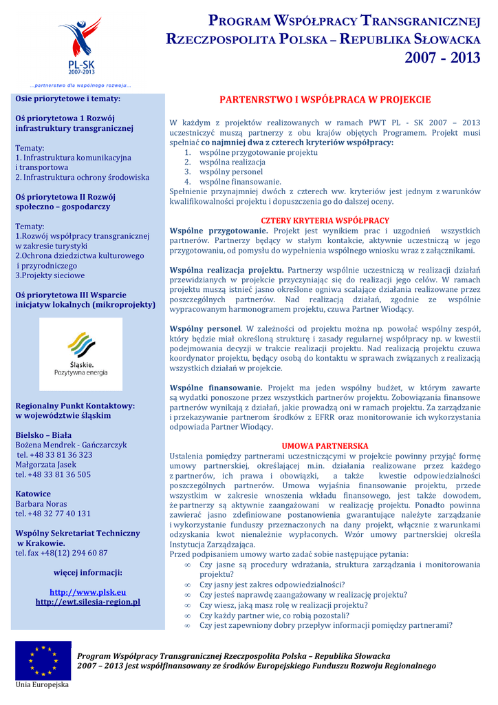PROGRAM WSPÓŁPRACY TRANSGRANICZNEJ RZECZPOSPOLITA POLSKA – REPUBLIKA SŁOWACKA 2007 - 2013 Osie priorytetowe i tematy: Oś priorytetowa 1 Rozwój infrastruktury transgranicznej Tematy: 1. Infrastruktura komunikacyjna i transportowa 2. Infrastruktura ochrony środowiska Oś priorytetowa II Rozwój społeczno – gospodarczy Tematy: 1.Rozwój współpracy transgranicznej w zakresie turystyki 2.Ochrona dziedzictwa kulturowego i przyrodniczego 3.Projekty sieciowe Oś priorytetowa III Wsparcie inicjatyw lokalnych (mikroprojekty) PARTENRSTWO I WSPÓŁPRACA W PROJEKCIE W każdym z projektów realizowanych w ramach PWT PL - SK 2007 – 2013 uczestniczyć muszą partnerzy z obu krajów objętych Programem. Projekt musi spełniać co najmniej dwa z czterech kryteriów współpracy: 1. wspólne przygotowanie projektu 2. wspólna realizacja 3. wspólny personel 4. wspólne finansowanie. Spełnienie przynajmniej dwóch z czterech ww. kryteriów jest jednym z warunków kwalifikowalności projektu i dopuszczenia go do dalszej oceny. CZTERY KRYTERIA WSPÓŁPRACY Wspólne przygotowanie. Projekt jest wynikiem prac i uzgodnień wszystkich partnerów. Partnerzy będący w stałym kontakcie, aktywnie uczestniczą w jego przygotowaniu, od pomysłu do wypełnienia wspólnego wniosku wraz z załącznikami. Wspólna realizacja projektu. Partnerzy wspólnie uczestniczą w realizacji działań przewidzianych w projekcie przyczyniając się do realizacji jego celów. W ramach projektu muszą istnieć jasno określone ogniwa scalające działania realizowane przez poszczególnych partnerów. Nad realizacją działań, zgodnie ze wspólnie wypracowanym harmonogramem projektu, czuwa Partner Wiodący. Wspólny personel. W zależności od projektu można np. powołać wspólny zespół, który będzie miał określoną strukturę i zasady regularnej współpracy np. w kwestii podejmowania decyzji w trakcie realizacji projektu. Nad realizacją projektu czuwa koordynator projektu, będący osobą do kontaktu w sprawach związanych z realizacją wszystkich działań w projekcie. Regionalny Punkt Kontaktowy: w województwie śląskim Bielsko – Biała Bożena Mendrek - Gańczarczyk tel. +48 33 81 36 323 Małgorzata Jasek tel. +48 33 81 36 505 Katowice Barbara Noras tel. +48 32 77 40 131 Wspólny Sekretariat Techniczny w Krakowie. tel. fax +48(12) 294 60 87 więcej informacji: http://www.plsk.eu http://ewt.silesia-region.pl Wspólne finansowanie. Projekt ma jeden wspólny budżet, w którym zawarte są wydatki ponoszone przez wszystkich partnerów projektu. Zobowiązania finansowe partnerów wynikają z działań, jakie prowadzą oni w ramach projektu. Za zarządzanie i przekazywanie partnerom środków z EFRR oraz monitorowanie ich wykorzystania odpowiada Partner Wiodący. UMOWA PARTNERSKA Ustalenia pomiędzy partnerami uczestniczącymi w projekcie powinny przyjąć formę umowy partnerskiej, określającej m.in. działania realizowane przez każdego z partnerów, ich prawa i obowiązki, a także kwestie odpowiedzialności poszczególnych partnerów. Umowa wyjaśnia finansowanie projektu, przede wszystkim w zakresie wnoszenia wkładu finansowego, jest także dowodem, że partnerzy są aktywnie zaangażowani w realizację projektu. Ponadto powinna zawierać jasno zdefiniowane postanowienia gwarantujące należyte zarządzanie i wykorzystanie funduszy przeznaczonych na dany projekt, włącznie z warunkami odzyskania kwot nienależnie wypłaconych. Wzór umowy partnerskiej określa Instytucja Zarządzająca. Przed podpisaniem umowy warto zadać sobie następujące pytania: • Czy jasne są procedury wdrażania, struktura zarządzania i monitorowania projektu? • Czy jasny jest zakres odpowiedzialności? • Czy jesteś naprawdę zaangażowany w realizację projektu? • Czy wiesz, jaką masz rolę w realizacji projektu? • Czy każdy partner wie, co robią pozostali? • Czy jest zapewniony dobry przepływ informacji pomiędzy partnerami? Program Współpracy Transgranicznej Rzeczpospolita Polska – Republika Słowacka 2007 – 2013 jest współfinansowany ze środków Europejskiego Funduszu Rozwoju Regionalnego Unia Europejska PROGRAM CEZHRANIČNEJ SPOLUPRÁCE POĽSKO– SLOVENSKA REPUBLIKA 2007 – 2013 PARTNERSTVO A SPOLUPRACA PRI PROJEKTE Prioritne osi a témy: Prioritná os I: Rozvoj cezhraničnej infraštruktúry Témy: 1. Komunikačná a dopravná a infraštruktúra 2. Infraštruktúra životného prostredia Prioritná os II: Socio-ekonomický rozvoj Témy: 1. Rozvoj cezhraničnej spolupráce v oblasti turizmu. 2. Ochrana prírodného a kultúrneho dedičstva 3. Vytváranie sieti Prioritná os: III Podpora mietsnych iniciatív (mikroprojekty) V každom projekte realizovanom v rámci PWT PL - SK 2007 – 2013 sa musia zúčastniť’ partneri z oboch krajín zúčastnených na Programe. Projekt musí spĺňať’ najmenej dve zo štyroch kritérií spolupráci: 5. spoločná príprava projektu 6. spoločná realizácia 7. spoločný personál 8. spoločné rozvojové financovanie. Splnenie najmenej dvoch zo štyroch vyššie uvedených kritérií je jednou z podmienok oprávnenosti projektu a jeho ďalšieho hodnotenia. ŠTYRI KRITÉRIA SPOLUPRÁCE Spoločná príprava. Projekt je výsledkom práce a dohody všetkých partnerov. Partneri sú stále v kontakte, aktívne sa zúčastňujú na jeho príprave, od návrhu po spoločné vyhotovenie projektu a priloh. Spoločná realizácia projektu. Partneri sa spoločne zúčastňujú na aktivitách plánovaných v projekte a tiež prispievajú k realizácii projektu. Projekt musí obsahovať jasne vymedzene spojivá medzi aktivitami realizovanými jednotlivými partnermi. Vedúci partner dozerá na realizáciu aktivít v súlade so spoločne spracovaným rozpisom projektu. Spoločný personál. V závislosti od projektu je možne napr. vymenovať’ spoločnú skupinu, ktorá bude mať určenú štruktúru a dohodnuté pravidla systematickej spolupráce tykajúcej sa