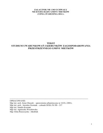 ZAŁACZNIK NR 1 DO UCHWAŁY NR II/5/2014 RADY GMINY MIETKÓW Z DNIA 29 GRUDNIA 2014 r. TEKST STUDIUM UWARUNKOWAŃ I KIERUNKÓW ZAGOSPODAROWANIA PRZESTRZENNEGO GMINY MIETKÓW ----------------------------------------------------------------------------------------------------------------OPRACOWANIE: Mgr inż. arch. Irena Głuszek – uprawnienia urbanistyczne nr 1610 z 2001r. Mgr inż. arch. Jarosław Korniak – członek DOIA Nr DS - 337 Mgr inż. Natalia Korniak Mgr inż. Agnieszka Wesołowska Mgr Alina Ruszczycka - Jakubiak 1 Spis treści: I.Wstęp. II.Dane ogólne. III.Materiały wejściowe. IV.Uwarunkowania: 1. Dotychczasowe przeznaczenie, zagospodarowanie i uzbrojenie terenu: 1.1. Studium uwarunkowań i kierunków zagospodarowania przestrzennego gminy. 1.2. Dotychczasowe przeznaczenie terenu w miejscowych planach zagospodarowania przestrzennego. 1.3. Zagospodarowanie terenu. 1.4. Uzbrojenie terenu. 1.5. Stan komunikacji. 2. Stan środowiska. 2.1. Rolnicza przestrzeń produkcyjna 2.2. Lasy 2.3. Zasoby wodne 2.4. Surowce mineralne 2.5. Rzeźba terenu 2.6. Budowa geologiczna 2.7. Warunki klimatyczne 2.8. Walory przyrodnicze 2.9. Ochrona przyrody 3. Stan dziedzictwa kulturowego i zabytków oraz dóbr kultury współczesnej. 3.1. Zabytki architektury i budownictwa 3.2. Zabytkowe cmentarze 3.3. Stanowiska archeologiczne 3.4. Krajobraz kulturowy 3.5. Charakterystyka konserwatorska poszczególnych sołectw 3.6. Archeologia. 4. Warunki i jakość życia mieszkańców, w tym ochrony ich zdrowia. 4.1. Sieć osadnicza i demografia 4.2. Warunki zamieszkiwania 4.3. Oświata 4.4. Kultura 4.5. Rekreacja, sport i wypoczynek 4.6. Ochrona zdrowia i pomoc społeczna 4.7. Rynek pracy 4.8. Bezrobocie 5. Stan prawny gruntów. 6. Zagrożenia bezpieczeństwa ludności i jej mienia oraz zagrożenia dla środowiska. 6.1. Zagrożenia powodziowe 6.2. Obszary naturalnych zagrożeń geologicznych. 6.3. Zagrożenia dla jakości wód powierzchniowych i podziemnych. 6.4. Zagrożenia dla jakości powietrza. 6.5. Zagrożenia akustyczne. 6.6. Zagrożenia dla walorów przyrodniczych. 6.7. Zagrożenia dla gleb. 6.8. Zagrożenia wynikające z eksploatacji surowców mineralnych. 6.9. Zagrożenia promieniowaniem elektomagnetycznym. 6.10. Inne zagrożenia 2 7. 8. 9. 10. 11. 12. 13. Obiekty i tereny chronione na podstawie przepisów odrębnych. Wymagania ochrony przeciwpowodziowej. Udokumentowane złoża kopalin oraz zasoby wód podziemnych. Tereny górnicze. Zadania służące realizacji ponadlokalnych celów publicznych. Ograniczenia rozwoju przestrzennego gminy. Atuty gminy. V. Kierunki rozwoju: 1. Kierunki zmian w strukturze przestrzennej gminy oraz w przeznaczeniu terenów. 2. Kierunki i wskaźniki dotyczące zagospodarowania oraz użytkowania terenów, w tym tereny wyłączone spod zabudowy. 3. Obszary oraz zasady ochrony środowiska i jego zasobów, ochrony przyrody, krajobrazu kulturowego. 4. Obszary i zasady ochrony dziedzictwa kulturowego i zabytków oraz dóbr kultury współczesnej. 5. Kierunki rozwoju systemów komunikacji. 6. Kierunki rozwoju systemów infrastruktury technicznej. 7. Obszary, na których rozmieszczone będą inwestycje celu publicznego o znaczeniu lokalnym. 8. Obszary, na których rozmieszczone będą inwestycje celu publicznego o znaczeniu ponadlokalnym. 9. Obszary, dla których obowiązkowe jest sporządzenie miejscowego planu zagospodarowania przestrzennego, w tym wymagające scaleń i podziału oraz obszary przestrzeni publicznej. 10. Obszary, dla których gmina zamierza sporządzić plany miejscowe, w tym obszary wymagające zmiany przeznaczenia gruntów rolnych i leśnych na cele nierolnicze i nieleśne. 11. Kierunki i zasady kształtowania rolniczej i leśnej przestrzeni produkcyjnej. 12. Obszary szczególnego zagrożenia powodzią oraz obszary osuwania się mas ziemnych. 13. Obiekty lub obszary, dla których wyznacza się w złożu kopaliny filar ochronny. 14. Obszary wymagające przekształceń, rehabilitacji lub rekultywacji. 15. Granice terenów zamkniętych i ich stref ochronnych. 16. Obszary, na których rozmieszczone będą urządzenia wytwarzające energię z odnawialnych źródeł energii o mocy przekraczającej 100 kW, a także ich stref ochronnych, związanych z ograniczeniami w zabudowie oraz w zagospodarowaniu i użytkowaniu terenu. VI. Uzasadnienie zawierające objaśnienia przyjętych rozwiązań oraz syntezę ustaleń projektu zmiany studium 3 I. WSTĘP Podstawy prawne sporządzenia niniejszego opracowania, tj. zmiany studium uwarunkowań i kierunków zagospodarowania przestrzennego gminy Mietków stanowią: - ustawa z dnia 27 marca 2003 r. o planowaniu i zagospodarowaniu przestrzennym (t.j. Dz. U. z 2012 r., poz. 647 – z późn. zm.), - rozporządzenie Ministra Infrastruktury z dnia 28 kwietnia 2004 r. w sprawie zakresu projektu studium uwarunkowań i kierunków zagospodarowania przestrzennego (Dz. U. Nr 118, poz. 1233), - uchwała Rady Gminy Mietków nr XXVI/129/2013 z dnia 28 stycznia 2013 r. w sprawie przystąpienia do sporządzenia zmiany Studium uwarunkowań i kierunków zagospodarowania przestrzennego gminy Mietków w granicach administracyjnych gminy. Studium uwarunkowań i kierunków zagospodarowania przestrzennego gminy jest dokumentem, który określa kierunki polityki przestrzennej, zgodnie z art. 9 ust. 1 ustawy o planowaniu i zagospodarowaniu przestrzennym (t.j. Dz. U. z 2012 r., poz. 647 – z późn.zm.). Organem właściwym do uchwalania studium jest rada gminy. Dotychczasowe studium uwarunkowań i kierunków zagospodarowania przestrzennego gminy Mietków uchwalone w 2000 r. było dwukrotnie zmieniane na fragmentach obszaru gminy zmiana studium na obszarach położonych w obrębie Borzygniew i Maniów została uchwalona uchwałą Rady Gminy Mietków nr XXVII/162/2005 z dnia 28 grudnia 2005 r., natomiast zmiana studium na obszarach położonych w miejscowościach Borzygniew, Domanice, Maniów, Maniów Mały i Proszkowice została uchwalona uchwałą Rady Gm
