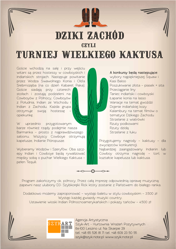 Dziki zachód czyli turniej Wielkiego Kaktusa Goście wchodzą na salę i przy wejściu witani są przez hostessy w cowboyskich i indiańskich strojach. Następuje powitanie przez Wodza Swawolnego Konia i Old'a Srebrnozęba (na co dzień Kabaret Paka). Goście siadają przy czterech stołach i zostają podzieleni na Cowboyów z Północy, Cowboyów z Południa, Indian ze Wschodu i Indian z Zachodu. Każda grupa otrzymuje swoją hostessę – opiekunkę. W uprzednio przygotowanym barze również rządy podejmie nasza Barmanka – prosto z najprawdziwszego saloonu. Wszyscy Cowboye otrzymują kapelusze, Indianie Pióropusze. Wybieramy Wodzów i Szeryfów. Oba szczepy Indian i Cowboye będą rywalizować między sobą o puchar Wielkiego Kaktusa – pełen Tequili. A konkursy będą następujące: wybory najpiękniejszej Squaw i Kasi Baloo Poszukiwanie złota – piasek + sita Przeciąganie liny Taniec indiański i cowboyski Łapanie konia na lasso Wariacje na temat gwoździ Dojenie indiańskiej kozy Kalambury na temat filmów o tematyce Dzikiego Zachodu Strzelanie z wiatrówki Rzuty podkowami Rzuty dzidą Strzelanie z łuku Przygotujemy nagrody – kaktusy – dla zwycięzców konkurencji. Najbardziej zaangażowany Indianin lub Cowboy otrzyma nagrodę – tort w kształcie kapelusza lub kaktusa. Program zakończymy ok. północy. Przez całą imprezę odpowiednią oprawę muzyczną zapewni nasz ulubiony DJ- Szybkoręki Rick który zostanie z Państwem do białego ranka. Dodatkowo możemy zaproponować – występ baletu w stylu cowboyskim – 3.500 zł Występ każdej gwiazdy muzyki country. Ustawienie wioski Indian Północnoamerykańskich i pokazy tańców – 4.500 zł Agencja Artystyczna Szyk-Art - Hurtownia Wrażeń Pozytywnych 64-100 Leszno ul. Na Skarpie 29 tel. +48 65 526 81 71 tel. +48 609 23 50 55 [email protected] www.szyk.note.pl