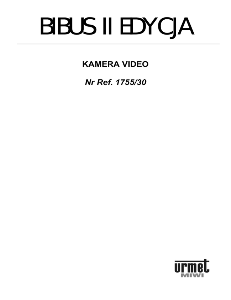 BIBUS II EDYCJA KAMERA VIDEO Nr Ref. 1755/30 SYSTEM BIBUS KAMERA VIDEO 1755/30 NOTATKI 2 MIWI-URMET Sp. z o.o. 91-341 Łódź ul. Pojezierska 90a tel. (42) 616-21-00 fax. (42) 616-21-13 SYSTEM BIBUS KAMERA VIDEO 1755/30 KAMERA VIDEO 1755/30 DANE TECHNICZNE Napięcia zasilania Pobór prądu Przetwornik wizyjny Obiektyw Migawka Ostrość Automatyczna regulacja czułości Natężenie oświetlenia Wyjście video Temperatura pracy 14 -18 Vdc 180 mA CCD – 1/3” f=5,3mm, 1:1,3 montowana seryjnie stała 100 – 4000 Lx 0,2 Lux (min), 3 Lux zalecane 1 Vpp 75 Ohm od –5 do 50°C Kamera video nr ref. 1775/30 przeznaczona jest do montażu w panelach K-Steel. Wymaga odpowiedniej obudowy i ramki. Kamera posiada regulację kąta widzenia. W pionie: 10° w górę, 15° w dół, w poziomie: w obu kierunkach 10°. A – śruba mocująca B, C – suwaki regulujące położenie soczewki D, E – listwy zaciskowe Regulacja kamery w pionie W celu regulacji kąta widzenia kamery, należy najpierw poluzować śrubę A. Następnie przesuwając suwak B w górę podnosimy soczewkę kamery do góry. Odwrotnie, jeżeli będziemy przesuwać suwak B w dół, soczewka zostanie opuszczona. Regulacja kamery w poziomie Najpierw należy poluzować śrubę A. Następnie przesuwając suwak C w prawo, przesuwamy soczewkę kamery w prawo. Jeżeli będziemy przesuwać suwak C w lewo, soczewka zostanie przekręcona w lewo. UKŁAD ZAPOBIEGAJĄCY ZAPAROWANIU KAMERY W celu włączenia układu należy połączyć zaciski ~0 i ~12 z zasilaczem. Do tego celu należy użyć oddzielnego transformatora. OPIS ZACISKÓW +Tc T R2 R1 A B ~0, ~12 Nie używane Sterowanie zasilaniem Zasilanie kamery Masa Sygnał video Sygnał video Zasilanie obwodu zapobiegającego zaparowaniu urządzenia MIWI-URMET Sp. z o.o. 91-341 Łódź ul. Pojezierska 90a tel. (42) 616-21-00 fax. (42) 616-21-13 3 MIWI-URMET Sp. z o. o ul. Pojezierska 90A 91-341 Łódź tel: (0-42) 616-21-00 fax: (0-42) 616-21-13 e-mail: [email protected] http:/www.miwiurmet.com.pl Z dnia 01.06.2010 Dyspozycja dotycząca uŜywania sprzętu elektrycznego i elektronicznego w krajach Unii Europejskiej. Ten symbol umieszczony na produkcie, na opakowaniu lub w instrukcji obsługi, oznacza, Ŝe urządzenie nie powinno być wyrzucane, tak jak zwykłe odpady lecz oddawane do odpowiedniego punktu skupu/punktu zbioru zuŜytych urządzeń elektrycznych i elektronicznych działających w systemie recyklingu zgodnie z ustawą z dnia 29 lipca 2005 r. o zuŜytym sprzęcie elektrycznym i elektronicznym {D.U. z 2005 r. nr 180, poz. 1494 i 1495} Postępowanie zgodnie z powyŜszymi wskazówkami pozwala ustrzec się potencjalnych, negatywnych konsekwencji dla środowiska i zdrowia człowieka wynikających ze złego składowania i przetwarzania zuŜytego sprzętu elektrycznego i elektronicznego. (WEEE). Jeśli jest to moŜliwe proszę wyjąc z urządzenia baterie i/lub akumulatory i przekazać je do punków zbiórki zgodnie z obowiązującymi wymaganiami. Przestrzeganie powyŜszych zasad związanych z recyklingiem zuŜytego sprzętu i materiałów pozwala utrzymać zasoby i surowce naturalne.