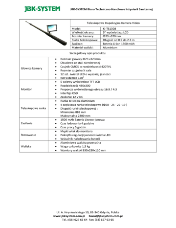 JBK-SYSTEM Biuro Techniczno Handlowe Inżynierii Sanitarnej Teleskopowa Inspekcyjna Kamera Video Model: Wielkość ekranu: Rozmiar kamery: Rurka teleskopowa: Zasilacz: Materiał walizki: KI-TS1308 5” wyświetlacz LCD Φ23 x320mm Długość od 0.9 do 2.3 m Bateria Li-ion 1500 mAh Aluminium Szczegółowy opis produktu: Głowica kamery Monitor Teleskopowa rurka Zasilanie Sterowanie Walizka Rozmiar głowicy Φ23 x320mm Obudowa ze stali nierdzewnej Czujnik CMOS o rozdzielczości 420TVL Rozmiar czujnika ¼ cala 12 szt. świateł LED o wysokiej jasności Kat widzenia 120o 5-calowy wyświetlacz TFT LCD Rozdzielczość 480x300 Proporcje wyświetlanego obrazu 16:9 / 4:3 Interfejs OSD Zasilanie 12 V DC Rurka ze stopu aluminium 4 częściowa rurka teleskopowa (Φ28 - 25 - 22 -19 ) Długość rurki teleskopowej : Minimalna 888 mm Maksymalna 2300 mm 1500 mAh Bateria Litowo-jonowa Czas ładowania 4 godziny Czas pracy 5 godzin Męski wtyk do monitora Pokrętło regulacji jasności światła LED Wskaźnik naładowania baterii Aluminiowa walizka przenośna Waga całkowita 1,5 kg Wymiary walizki 930x250x110 mm Ul. A. Hryniewickiego 10, 81-340 Gdynia, Polska www.jbksystem.com.pl [email protected] Tel.: (58) 627 63 64 Fax: (58) 627 63 65 JBK-SYSTEM Biuro Techniczno Handlowe Inżynierii Sanitarnej Wodoodporna Mini Kamera Video Model: Wielkość ekranu: Rozmiar kamery: Kabel: Zasilacz: Materiał walizki: KI-35 7” wyświetlacz TFT LCD Φ12 mm 20m Φ5.2 mm Bateria Li-ion 4400 mAh Aluminium Szczegółowy opis produktu: Głowica kamery Monitor DVR jednostka sterowania Zasilanie Kabel bębnowy Walizka Rozmiar głowicy Φ12 mm Rozmiar czujnika 1/5 cala Kat widzenia 60o Prąd pracy kamery 100mA Zasilanie kamery 3.3V DC 4 szt. białych świateł LED Rozdzielczość PAL 720x576; NTSC 720x480 Obiektyw z szafirowego szkła Obudowa z aluminium 7-calowy wyświetlacz TFT LCD Zasilanie 12 V DC Zasilanie DVR 12V DC Prąd pracy DVR 200mA Nośnik danych karta SD (karta SD 8 GB w zestawie) Zestaw baterii litowo - jonowych ( 4400 mAh ) Czas ładowania 5 godziny Czas pracy 7 godzin Wymiar bębna Φ320 x 110 mm Materiał kabla: pręt z włókna szklanego Długość kabla 20m (standard) Średnica kabla Φ5.2 mm Aluminiowa walizka przenośna Wymiary walizki 450 x 330 x 170 mm Temperatura pracy: -10o do 50o C, wilgotność do 95% RH Temperatura przechowywania: -20o do 70o C, wilgotność do 95% RH Ul. A. Hryniewickiego 10, 81-340 Gdynia, Polska www.jbksystem.com.pl [email protected] Tel.: (58) 627 63 64 Fax: (58) 627 63 65 JBK-SYSTEM Biuro Techniczno Handlowe Inżynierii Sanitarnej Specjalny System Inspekcji CCTV z giętkim kablem Model: Wielkość ekranu: Rozmiar kamery: Kabel: Zasilacz: Materiał walizki: KI-3088 7” wyświetlacz TFT LCD Φ23 x 45mm 30m Bateria Li-ion 4400 mAh Aluminium Szczegółowy opis produktu: Głowica kamery Monitor DVR jednostka sterowania Zasilanie Kabel bębnowy Walizka Rozmiar głowicy Φ23 x 45 mm do inspekcji podwodnych lub kominów itp. Rozmiar czujnika ¼ cala Kat widzenia 120o 12 szt. białych świateł LED Rozdzielczość PAL 720x576; NTSC 720x480 Obiektyw z szafirowego szkła Obudowa ze stali nierdzewnej 7-calowy wyświetlacz TFT LCD Zasilanie 12 V DC Zasilanie DVR 12V DC Prąd pracy DVR 200mA Zestaw baterii litowo - jonowych ( 4400 mAh ) Czas ładowania 5 godziny Czas pracy 7 godzin Długość kabla 30m z plastikowym bębnem Aluminiowa walizka przenośna Wymiary walizki 450 x 212 x 425 mm Temperatura pracy: -10o do 50o C, wilgotność do 95% RH Temperatura przechowywania: -20o do 70o C, wilgotność do 95% RH Ul. A. Hryniewickiego 10, 81-340 Gdynia, Polska www.jbksystem.com.pl [email protected] Tel.: (58) 627 63 64 Fax: (58) 627 63 65 JBK-SYSTEM Biuro Techniczno Handlowe Inżynierii Sanitarnej Przenośny sprzęt do Inspekcji Rur Model: Wielkość ekranu: Rozmiar kamery: Kabel: Zasilacz: Materiał walizki: KI-3188 7” wyświetlacz TFT LCD Φ23 x 45mm 20m Φ5.2 mm Bateria Li-ion 4400 mAh Aluminium Szczegółowy opis produktu: Głowica kamery Monitor DVR jednostka sterowania Zasilanie Kabel bębnowy Walizka Rozmiar głowicy Φ23 x 45 mm do rur Φ25 do 200 mm Rozmiar czujnika ¼ cala Kat widzenia 120o 12 szt. białych świateł LED Rozdzielczość PAL 720x576; NTSC 720x480 Obiektyw z szafirowego szkła Obudowa z aluminium 7-calowy wyświetlacz TFT LCD Zasilanie 12 V DC Zasilanie DVR 12V DC Prąd pracy DVR 200mA Zestaw baterii litowo - jonowych ( 4400 mAh ) Czas ładowania 5 godziny Czas pracy 7 godzin Wymiar bębna ze stali nierdzewnej Φ320 x 110 mm Materiał kabla: pręt z włókna szklanego Długość kabla 20m (standard) Średnica kabla Φ5.2 mm Kabel do wpychania Aluminiowa walizka przenośna Wymiary walizki 450 x 330 x 170 mm Temperatura pracy: -10o do 50o C, wilgotność do 95% RH Temperatura przechowywania: -20o do 70o C, wilgotność do 95% RH Ul. A. Hryniewickiego 10, 81-340 Gdynia, Polska www.jbksystem.com.pl [email protected] Tel.: (58) 627 63 64 Fax: (58) 627 63 65 JBK-SYSTEM Biuro Techniczno Handlowe Inżynierii Sanitarnej Wodoodporny System do Inspekcji Rur Model: Wielkość ekranu: Rozmiar kamery: Kabel: Zasilacz: Materiał walizki: KI-3188DN 7” wyświetlacz TFT LCD Φ23 x 45mm 20m Φ5.2 mm Bateria Li-ion 4400 mAh ABS Szczegółowy opis produktu: Głowica kamery Monitor DVR jednostka sterowania Zasilanie Kabel bębnowy Walizka Rozmiar głowicy Φ23 x 45 mm do rur Φ25 do 200 mm Rozmiar czujnika ¼ cala Kat widzenia 120o 12 szt. białych świateł LED Rozdzielczość PAL 720x576; NTSC 720x480 Obiektyw z szafirowego szkła Obudowa z aluminium 7-calowy wyświetlacz TFT LCD Zasilanie 12 V DC Zasilanie DVR 12V DC Prąd pracy DVR 200mA Nośnik danych karta SD (karta SD 8 GB w zestawie ) Zestaw baterii litowo - jonowych ( 4400 mAh ) Czas ładowania 5 godziny Czas pracy 7 godzin Wymiar bębna ze stali nierdzewnej Φ320 x 110 mm Materiał kabla: pręt z włókna szklanego Długość kabla 20m (standard) Dostępne długości kabla 30m , 40m Średnica kabla Φ5.2 mm Kabel do wpychania Wali
