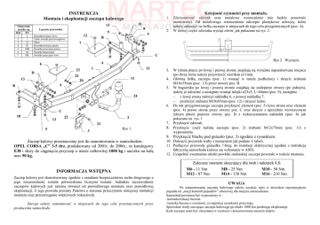 Kolejność czynności przy montaŜu. INSTRUKCJA MontaŜu i eksploatacji zaczepu kulowego Oznaczenie zacisku wg ISO PN 1 L 2 + 3 31 4 R 5 58R 6 54 7 58L 1. D 13 8 Łączenie przewodów 9 12 Kierunkowskazy lewe Tylne światła przeciwmgłowe Masa Kierunkowskazy prawe Światła pozycyjne prawe Światła hamowania Światła pozycyjne lewe 2. 4 B Zdemontować zderzak oraz metalowe wzmocnienie (nie będzie ponownie montowane). Od metalowego wzmocnienia odczepić plastykowe uchwyty, które naleŜy zahaczyć na belkę zaczepu w miejscach do tego celu przygotowanych (poz. A). W dolnej części zderzaka wyciąć otwór, jak pokazano na rys. 2. 50 7 C Rys 2. Wycięcie A 6 13 1 23 D 22 13 11 20 A B 24 C 10 13 22 2 21 5 3 Rys 1. 3. W tylnim płacie po lewej i prawej stronie znajdują się wyraźnie napunktowane miejsca (po dwa), które naleŜy przewiercić wiertłem ø11mm. 4. Główną belkę zaczepu (poz. 1) wsunąć w tunele podłuŜnicy i skręcić śrubami M10x35mm (poz. 13) przez otwory poz. B. 5. W bagaŜniku po lewej i prawej stronie znajdują się zaślepione otwory (po jednym), naleŜy je udroŜnić a następnie wsunąć tulejki ø25x5, L=44mm (poz. 9), następnie − z lewej strony nałoŜyć nakładkę 6, z prawej nakładkę 7, − przełoŜyć śrubami M10x85mm (poz. 12) i skręcić luźno. 6. Do tak przygotowanego zaczepu przykręcić element (poz. 5) lewa strona oraz element (poz. 4) prawa strona przez otwory poz. C oraz skręcić z uprzednio wywierconym tylnym płacie poprzez otwory poz. D z wykorzystaniem nakładek (poz. 8) jak pokazano na rys. 1 7. Przykręcić zderzak. 8. Przykręcić część kulistą zaczepu (poz. 2) śrubami M12x75mm (poz. 11) z wyposaŜenia. 9. Przykręcić blachę pod gniazdo (poz. 3) zgodnie z rysunkiem. Zaczep kulowy przeznaczony jest do zamontowania w samochodzie: OPEL CORSA „C” 3-5 drz. produkowany od 2001r. do 2006r., nr katalogowy E38 i słuŜy do ciągnięcia przyczep o masie całkowitej 1000 kg i nacisku na kulę max 50 kg. INFORMACJA WSTĘPNA Zaczep kulowy jest skonstruowany zgodnie z zasadami bezpieczeństwa ruchu drogowego a jego niezawodność została potwierdzona licznymi testami. JednakŜe niezawodność zaczepów kulowych jest zaleŜna równieŜ od prawidłowego montaŜu oraz prawidłowej eksploatacji. Z tego powodu prosimy Państwa o staranne przeczytanie niniejszej instrukcji montaŜu oraz przestrzeganie właściwych wskazówek. Zaczep naleŜy zamontować w miejscach do tego celu przeznaczonych przez producenta samochodu. 10. Dokręcić pozostałe śruby z momentem jak podano w tabeli. 11. Podłączyć przewody gniazdka 7-bieg. do instalacji elektrycznej zgodnie z instrukcją fabryczną samochodu (zaleca się wykonanie w ASO). 12. Uzupełnić ewentualne ubytki powłoki malarskiej zaczepu powstałe w trakcie montaŜu. Zalecany moment skręcający dla śrub i nakrętek 8,8: M6 - 11 Nm M8 - 25 Nm M10 - 50 Nm M12 - 87 Nm M14 - 138 Nm M16 - 210 Nm UWAGA Po zamontowaniu zaczepu kulowego naleŜy uzyskać wpis w dowodzie rejestracyjnym pojazdu na „stacji kontroli pojazdów” właściwej dla miejsca zamieszkania. Samochód powinien być wyposaŜony w : -kierunkowskazy boczne -lusterka boczne o rozstawie, co najmniej szerokości przyczepy. Sprawdzać śruby mocujące zaczepu kulowego po około 1000 km przebiegu eksploatacji. Kula zaczepu musi być utrzymana w czystości i konserwowana smarem stałym . PPUH AUTO-HAK S.J. WyposaŜenie zaczepu: Produkcja Zaczepów Kulowych Henryk & Zbigniew Nejman 76-200 SŁUPSK ul. Słoneczna 16K tel/fax (059) 8-414-414; 8-414-413 E-mail: [email protected] www. autohak.com.pl Zaczep kulowy bez wyposaŜenia elektrycznego E38 Klasa: A50-X Nr kat. Przeznaczony do zamontowania w samochodzie: Producent: OPEL Model: CORSA C Typ: 3-5 drz. produkowanego od 2001r. do 2006r. Dane techniczne: Wartość siły D : 5,73 kN maksymalna masa przyczepy: 1000 kg maksymalny nacisk na kulę: 50 kg Numer homologacji zgodnie z wytycznymi regulaminu EKG/ONZ 55.01: E20-55R-01 0804 KARTA GWARANCYJNA Producent udziela gwarancji niniejszą kartą gwarancyjną na okres 24 miesięcy licząc od dnia zakupu zaczepu kulowego do samochodu: OPEL CORSA „C” 3-5 drz. produkowany od 2001r. do 2006r. Data produkcji .............................. Data zakupu......................................... Zakres gwarancji obejmuje wyłącznie wady jakościowe wynikające z winy producenta. Gwarancja nie obejmuje natomiast uszkodzeń zawinionych przez nabywcę, wynikających z niewłaściwego montaŜu, uŜytkowania lub konserwacji, uszkodzeń mechanicznych, normalnego zuŜycia podczas eksploatacji itp. Gwarancja udzielona na zakupiony towar nie wyłącza, nie ogranicza ani nie zawiesza uprawnień kupującego wynikających z niezgodności towaru z umową. Reklamacje naleŜy zgłaszać w punkcie sprzedaŜy, składając jednocześnie kartę gwarancyjną. Usunięcie "wady" następuje po stwierdzeniu przez punkt sprzedaŜy wspólnie z producentem słuszności złoŜonej reklamacji. Reklamacja powinna być załatwiona w ciągu czternastu dni od dnia uznania reklamacji. Karta gwarancyjna jest niewaŜna jeŜeli nie jest wypełniona i podpisana. Data zgłoszenia reklamacji: ................................................................... INFORMACJA WSTĘPNA Zaczep kulowy jest skonstruowany zgodnie z zasadami bezpieczeństwa ruchu drogowego. Zaczep kulowy jest elementem wpływającym na bezpieczeństwo jazdy i moŜe zostać zainstalowany wyłącznie przez personel wyspecjalizowany. Niedopuszczalne jest dokonywanie jakichkolwiek zmian w konstrukcji zaczepu. Powoduje to wygaśniecie dopuszczenia do stosowania. W przypadku obecności masy izolacyjnej lub osłony podwozia w miejscu przylegania zaczepu, naleŜy ją usunąć. Nieosłonięte miejsca karoserii oraz wywiercone otwory naleŜy pomalować farbą antykorozyjną. Informacjami wiąŜącymi odnośnie wartości obciąŜeń są dane podawane przez producenta samochodu, względnie wartości maksymalnej masy przyczep
