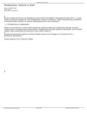 Muzeum Miasta Jaworzna Modelarstwo. Historia w skali! Autor: Administrator 31.01.2013. Zmieniony 15.02.2013.  Muzeum Miasta Jaworzna oraz Modelarnia Lotnicza „SieLata― zapraszają 8 lutego 2013 r. o godz. 18.00 na otwarcie wystawy pt. „Modelarstwo. Historia w skali―. Celem wystawy jest przybliżenie modelarstwa jako sposobu na ciekawe zagospodarowanie czasu wolnego. >> FOTORELACJA Z WERNISAŻU Hobby to ma wiele form, można skleić kartonowy model samolotu lub model tegoż samego samolotu wygenerować w komputerowej rzeczywistości. Modelarstwo ma jeden wspÃłlny mianownik: są nim ludzie i zapał z jakim podchodzą do tworzonych przez siebie modeli.  Wystawa prezentowana będzie w Muzeum Miasta Jaworzna od 8 lutego do 12 kwietnia 2013 r. Serdecznie zapraszamy! Projekt graficzny – Sławomir Śląski  http://www.muzeum.jaw.pl/sklep Kreator PDF Utworzono 4-03-2017, 07:02