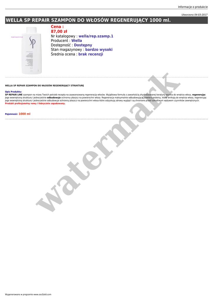 Informacje o produkcie Utworzono 04-03-2017 WELLA SP REPAIR SZAMPON DO WŁOSÓW REGENERUJĄCY 1000 ml. Cena : 87,00 zł Nr katalogowy : wella/rep.szamp.1 Producent : Wella Dostępność : Dostępny Stan magazynowy : bardzo wysoki Średnia ocena : brak recenzji er m ar k WELLA SP REPAIR SZAMPON DO WŁOSÓW REGENERUJĄCY STRUKTURĘ Opis Produktu: SP REPAIR LINE szampon na miarę Twoich potrzeb recepta na zaawansowaną regenerację włosów. Wyjątkowa formuła z zawartością zhydrolizowanej keratyny wynika do wnętrza włosa, regenerując jego wewnętrzną strukturę i jednocześnie odbudowuje ochronny płaszcz na powierzchni włosa. Regeneracja maksymalnie odbudowująca, zawiera proteiny, które wnikają do wnętrza włosa, regenerując jego wewnętrzną strukturę i jednocześnie odbudowuje ochronny płaszcz na powierzchni włosa które odzyskują zdrowy wygląd i są chronione przed szkodliwym wpływem czynników zewnętrznych. Produkt profesjonalny nowy i fabrycznie zapakowany. 1000 ml w at Pojemność: Wygenerowano w programie www.oscGold.com