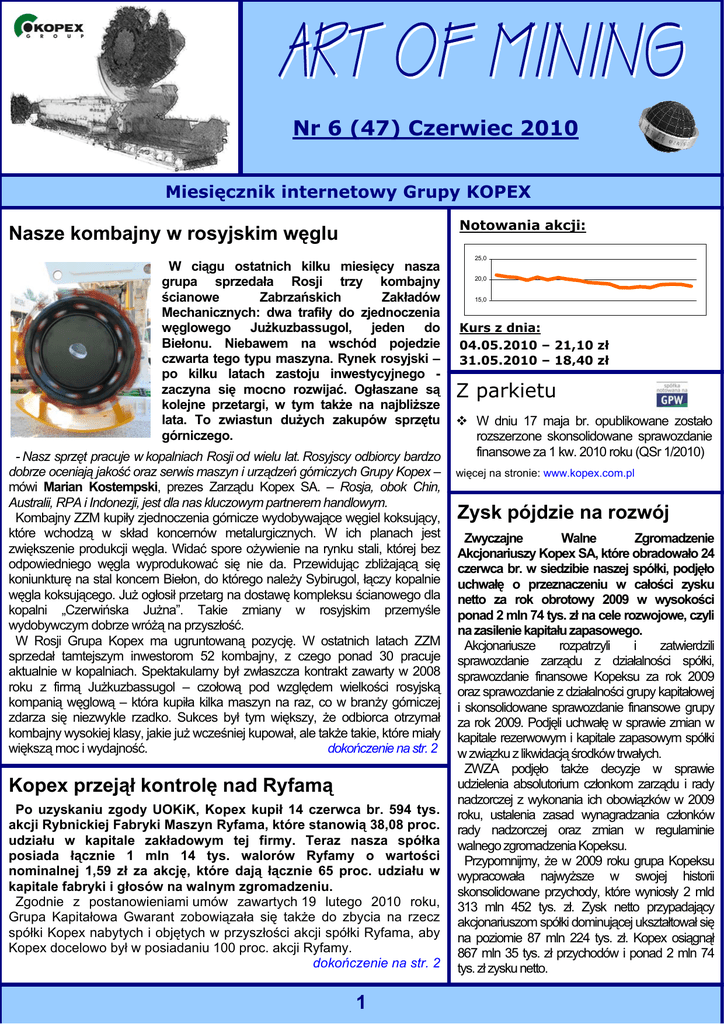Nr 6 (47) Czerwiec 2010 Miesięcznik internetowy Grupy KOPEX Notowania akcji: Nasze kombajny w rosyjskim węglu W ciągu ostatnich kilku miesięcy nasza grupa sprzedała Rosji trzy kombajny ścianowe Zabrzańskich Zakładów Mechanicznych: dwa trafiły do zjednoczenia węglowego Jużkuzbassugol, jeden do Biełonu. Niebawem na wschód pojedzie czwarta tego typu maszyna. Rynek rosyjski – po kilku latach zastoju inwestycyjnego zaczyna się mocno rozwijać. Ogłaszane są kolejne przetargi, w tym także na najbliższe lata. To zwiastun dużych zakupów sprzętu górniczego. - Nasz sprzęt pracuje w kopalniach Rosji od wielu lat. Rosyjscy odbiorcy bardzo dobrze oceniają jakość oraz serwis maszyn i urządzeń górniczych Grupy Kopex – mówi Marian Kostempski, prezes Zarządu Kopex SA. – Rosja, obok Chin, Australii, RPA i Indonezji, jest dla nas kluczowym partnerem handlowym. Kombajny ZZM kupiły zjednoczenia górnicze wydobywające węgiel koksujący, które wchodzą w skład koncernów metalurgicznych. W ich planach jest zwiększenie produkcji węgla. Widać spore ożywienie na rynku stali, której bez odpowiedniego węgla wyprodukować się nie da. Przewidując zbliżającą się koniunkturę na stal koncern Biełon, do którego należy Sybirugol, łączy kopalnie węgla koksującego. Już ogłosił przetarg na dostawę kompleksu ścianowego dla kopalni „Czerwińska Jużna”. Takie zmiany w rosyjskim przemyśle wydobywczym dobrze wróżą na przyszłość. W Rosji Grupa Kopex ma ugruntowaną pozycję. W ostatnich latach ZZM sprzedał tamtejszym inwestorom 52 kombajny, z czego ponad 30 pracuje aktualnie w kopalniach. Spektakularny był zwłaszcza kontrakt zawarty w 2008 roku z firmą Jużkuzbassugol – czołową pod względem wielkości rosyjską kompanią węglową – która kupiła kilka maszyn na raz, co w branży górniczej zdarza się niezwykle rzadko. Sukces był tym większy, że odbiorca otrzymał kombajny wysokiej klasy, jakie już wcześniej kupował, ale także takie, które miały większą moc i wydajność. dokończenie na str. 2 Kopex przejął kontrolę nad Ryfamą Po uzyskaniu zgody UOKiK, Kopex kupił 14 czerwca br. 594 tys. akcji Rybnickiej Fabryki Maszyn Ryfama, które stanowią 38,08 proc. udziału w kapitale zakładowym tej firmy. Teraz nasza spółka posiada łącznie 1 mln 14 tys. walorów Ryfamy o wartości nominalnej 1,59 zł za akcję, które dają łącznie 65 proc. udziału w kapitale fabryki i głosów na walnym zgromadzeniu. Zgodnie z postanowieniami umów zawartych 19 lutego 2010 roku, Grupa Kapitałowa Gwarant zobowiązała się także do zbycia na rzecz spółki Kopex nabytych i objętych w przyszłości akcji spółki Ryfama, aby Kopex docelowo był w posiadaniu 100 proc. akcji Ryfamy. dokończenie na str. 2 1 25,0 20,0 15,0 Kurs z dnia: 04.05.2010 – 21,10 zł 31.05.2010 – 18,40 zł Z parkietu W dniu 17 maja br. opublikowane zostało rozszerzone skonsolidowane sprawozdanie finansowe za 1 kw. 2010 roku (QSr 1/2010) więcej na stronie: www.kopex.com.pl Zysk pójdzie na rozwój Zwyczajne Walne Zgromadzenie Akcjonariuszy Kopex SA, które obradowało 24 czerwca br. w siedzibie naszej spółki, podjęło uchwałę o przeznaczeniu w całości zysku netto za rok obrotowy 2009 w wysokości ponad 2 mln 74 tys. zł na cele rozwojowe, czyli na zasilenie kapitału zapasowego. Akcjonariusze rozpatrzyli i zatwierdzili sprawozdanie zarządu z działalności spółki, sprawozdanie finansowe Kopeksu za rok 2009 oraz sprawozdanie z działalności grupy kapitałowej i skonsolidowane sprawozdanie finansowe grupy za rok 2009. Podjęli uchwałę w sprawie zmian w kapitale rezerwowym i kapitale zapasowym spółki w związku z likwidacją środków trwałych. ZWZA podjęło także decyzje w sprawie udzielenia absolutorium członkom zarządu i rady nadzorczej z wykonania ich obowiązków w 2009 roku, ustalenia zasad wynagradzania członków rady nadzorczej oraz zmian w regulaminie walnego zgromadzenia Kopeksu. Przypomnijmy, że w 2009 roku grupa Kopeksu wypracowała najwyższe w swojej historii skonsolidowane przychody, które wyniosły 2 mld 313 mln 452 tys. zł. Zysk netto przypadający akcjonariuszom spółki dominującej ukształtował się na poziomie 87 mln 224 tys. zł. Kopex osiągnął 867 mln 35 tys. zł przychodów i ponad 2 mln 74 tys. zł zysku netto. Miesięcznik internetowy Grupy KOPEX dokończenie ze str. 1 Nasze kombajny w rosyjskim węglu Handel z Rosją mógłby nabrać jeszcze większego rozmachu, gdyby polskich producentów sprzętu wydobywczego wspierały rządowe gwarancje w finansowaniu kontraktów z górnictwem rosyjskim. Chodzi o rozwiązania podobne do tych, jakie wprowadził rząd Czech dla swoich firm w handlu z Ukrainą. Co ciekawe, firmy te wcale nie należą do przemysłowych gigantów i nie produkują zbyt dużej ilości sprzętu, a mimo to popisały z górnictwem ukraińskim kontrakty na około 100 mln USD. - Rosyjscy inwestorzy zamierzają unowocześnić swoje górnictwo i mają na to pieniądze – podsumowuje J. Keller. – Wyposażenie kopalń chcą nabywać m. in. firmy leasingowe. Sprzętu, głównie nowoczesnych kombajnów i systemów elektroniki górniczej, szukają w wielu krajach, także na Zachodzie. Taką sytuację będzie chciała wykorzystać również nasza grupa. Po zakupie Ryfamy synergia działań marketingowych powoduje, że jesteśmy lepiej postrzegani na rynkach międzynarodowych, bo możemy dostarczyć pełny kompleks ścianowy złożony z naszych maszyn i urządzeń, które mają już referencje w wielu krajach świata, w tym także w Rosji. Dobrą markę na rynku rosyjskim mają również obudowy ścianowe Tagoru. W 2007 roku kupiła je Sybirskaja Ugolnaja Energeticzeskaja Kompania (SUEK) - największy rosyjski koncern górniczy, z którym podpisane zostały dwie umowy o wartość ponad 121 mln zł. Kopalnie wyposażone w nasze obudowy biją teraz rekordy wydobycia w Rosji. Jedną z nich wykorzystano już w t