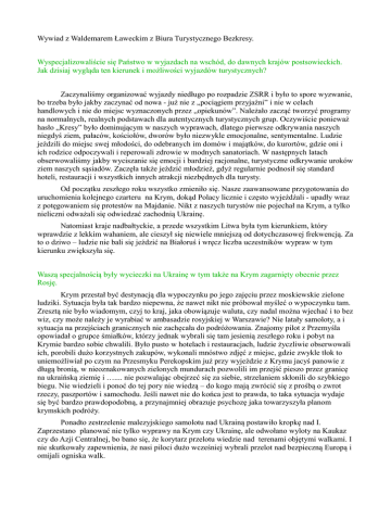 Wywiad z Waldemarem Ławeckim z Biura Turystycznego Bezkresy. Wyspecjalizowaliście się Państwo w wyjazdach na wschód, do dawnych krajów postsowieckich. Jak dzisiaj wygląda ten kierunek i możliwości wyjazdów turystycznych? Zaczynaliśmy organizować wyjazdy niedługo po rozpadzie ZSRR i było to spore wyzwanie, bo trzeba było jakby zaczynać od nowa - już nie z „pociągiem przyjaźni” i nie w celach handlowych i nie do miejsc wyznaczonych przez „opiekunów”. Należało zacząć tworzyć programy na normalnych, realnych podstawach dla autentycznych turystycznych grup. Oczywiście ponieważ hasło „Kresy” było dominującym w naszych wyprawach, dlatego pierwsze odkrywania naszych niegdyś ziem, pałaców, kościołów, dworów było niezwykle emocjonalne, sentymentalne. Ludzie jeździli do miejsc swej młodości, do odebranych im domów i majątków, do kurortów, gdzie oni i ich rodzice odpoczywali i reperowali zdrowie w modnych sanatoriach. W następnych latach obserwowaliśmy jakby wyciszanie się emocji i bardziej racjonalne, turystyczne odkrywanie uroków ziem naszych sąsiadów. Zaczęła także jeździć młodzież, gdyż regularnie podnosił się standard hoteli, restauracji i wszystkich innych atrakcji niezbędnych dla turysty. Od początku zeszłego roku wszystko zmieniło się. Nasze zaawansowane przygotowania do uruchomienia kolejnego czarteru na Krym, dokąd Polacy licznie i często wyjeżdżali - upadły wraz z potęgowaniem się protestów na Majdanie. Nikt z naszych turystów nie pojechał na Krym, a tylko nieliczni odważali się odwiedzać zachodnią Ukrainę. Natomiast kraje nadbałtyckie, a przede wszystkim Litwa była tym kierunkiem, który wprawdzie z lekkim wahaniem, ale cieszył się niewiele mniejszą od dotychczasowej frekwencją. Za to o dziwo – ludzie nie bali się jeździć na Białoruś i wręcz liczba uczestników wypraw w tym kierunku zwiększyła się. Waszą specjalnością były wycieczki na Ukrainę w tym także na Krym zagarnięty obecnie przez Rosję. Krym przestał być destynacją dla wypoczynku po jego zajęciu przez moskiewskie zielone ludziki. Sytuacja była tak bardzo niepewna, że nawet nikt nie próbował myśleć o wypoczynku tam. Zresztą nie było wiadomym, czyj to kraj, jaka obowiązuje waluta, czy nadal można wjechać i to bez wiz, czy może należy je wyrabiać w ambasadzie rosyjskiej w Warszawie? Nie latały samoloty, a i sytuacja na przejściach granicznych nie zachęcała do podróżowania. Znajomy pilot z Przemyśla opowiadał o grupce śmiałków, którzy jednak wybrali się tam jesienią zeszłego roku i pobyt na Krymie bardzo sobie chwalili. Było pusto w hotelach i restauracjach, ludzie życzliwie obserwowali ich, porobili dużo korzystnych zakupów, wykonali mnóstwo zdjęć z miejsc, gdzie zwykle tłok to uniemożliwiał po czym na Przesmyku Perekopskim już przy wyjeździe z Krymu jacyś panowie z długą bronią, w nieoznakowanych zielonych mundurach pozwolili im przejść pieszo przez granicę na ukraińską ziemię i ….... nie pozwalając obejrzeć się za siebie, strzelaniem skłonili do szybkiego biegu. Nie wiedzieli i ponoć do tej pory nie wiedzą – do kogo mają zwrócić się z prośbą o zwrot rzeczy, paszportów i samochodu. Jeśli nawet nie do końca jest to prawda, to taka sytuacja wydaje się być bardzo prawdopodobną, a przynajmniej obrazuje psychozę jaka towarzyszyła planom krymskich podróży. Ponadto zestrzelenie malezyjskiego samolotu nad Ukrainą postawiło kropkę nad I. Zaprzestano planować nie tylko wyprawy na Krym czy Ukrainę, ale odwołano wyloty na Kaukaz czy do Azji Centralnej, bo bano się, że korytarz przelotu wiedzie nad terenami objętymi walkami. I nie skutkowały zapewnienia, że nasi piloci dużo wcześniej wybrali przelot nad bezpieczną Europą i omijali ogniska walk. Jakie jest zainteresowanie polskich turystów wyjazdami na Ukrainę i możliwości w kontekście wojny na wschodzie tego kraju? Po zeszłorocznej zapaści i strachu przed wyjazdami, sytuacja mimo niewielkich zmian na wschodzie kraju – wraca do normy. Ludzie chyba zaczęli uświadamiać sobie, że Ukraina to wielki kraj o powierzchni niemal dwukrotnie przekraczającej obszar naszego kraju, gdzie zachód Ukrainy jest bardziej oddalony od Donbasu niż od Berlina. Dlatego odwiedziny naszych kresowych ziem są bezpieczne i można tam spokojnie podróżować. Zaczęły się zapisy i osób indywidualnych na proponowane przez nas typowe trasy, jak też zamawiają wyjazdy grupy, często dla konkretnych potrzeb, wg konkretnej „marszruty”. Niestety oprócz konieczności przezwyciężania strachu pojawiają się inne istotniejsze niedogodności. Otóż drogi ukraińskie – zawsze kiepskie – zaczynają być wręcz nieprzejezdne. Jakość dróg, asfaltu kładzionego łopatą, łatania dziur w niedawno naprawianych innych łatach, jeszcze przed Euro 2012 niepokoiła kibiców. Ale wówczas zdołano się z tym uporać i przynajmniej główne drogi dojazdowe do miast ze stadionami, były w miarę przyzwoite. Dziś, po kolejnej już zimie, wyraźnie widać, jaka przepaść dzieli Ukrainę od nie tylko Europy, ale także, co zakakuje naszych turystów, od Białorusi, gdzie nielubiany u nas Łukaszenko zadbał o jakość dróg do tego stopnia, że Białoruś może świecić przykładem, jak powinny wyglądać nawet lokalne drogi. Planując jakikolwiek przejazd na Ukrainie, należy dokładnie sprawdzić stan dróg i przewidywać przynajmniej dwukrotnie dłuższy czas podróżowania od np. zakładanego przez google. Wiele wsi i miast jest wręcz odgrodzona od innych miejscowości, bo ilość dziur albo zmusza do odwrotu albo powoduje, że przemieszczanie się pieszego jest szybsze niż pojazdu, który uważać przy tym musi, aby nieuszkodzony w ogóle dojechał. Otwory kanalizacyjne pod skradzionymi przykrywami, stają się przy ogromie dziur zupełnie nieistotnym drobiazgiem. Jeszcze innym problemem, coraz 