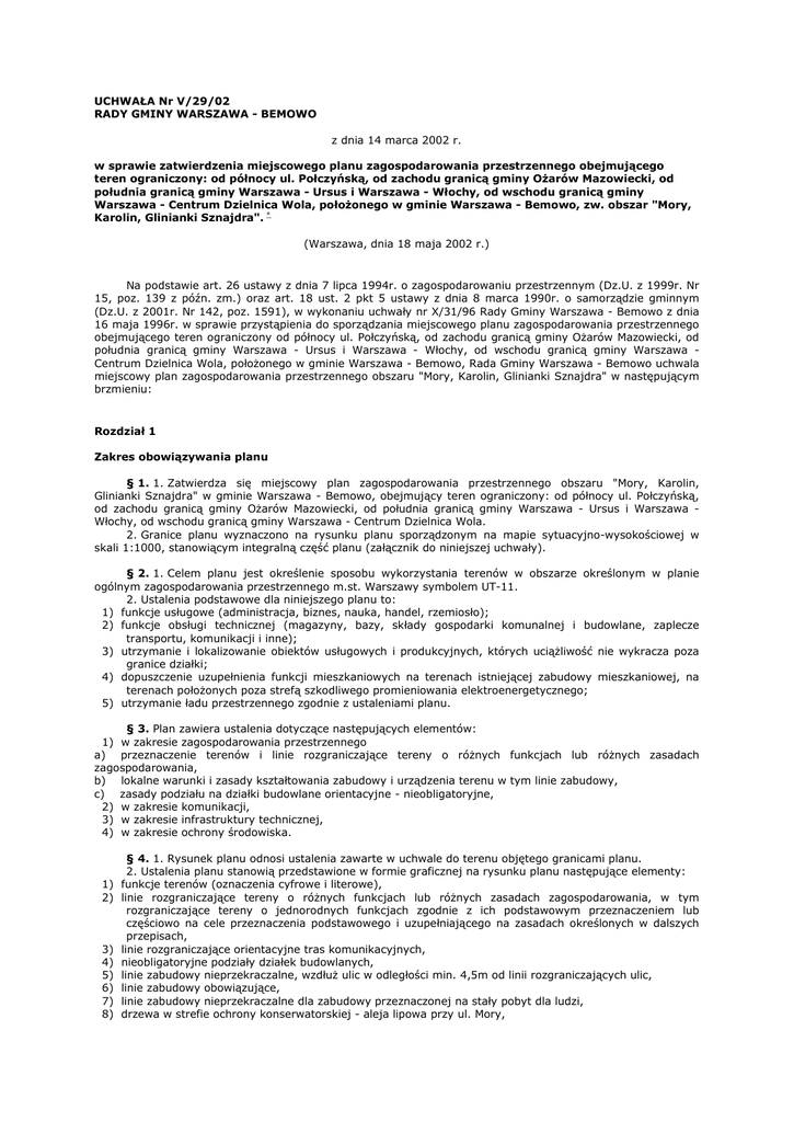 UCHWAŁA Nr V/29/02 RADY GMINY WARSZAWA - BEMOWO z dnia 14 marca 2002 r. w sprawie zatwierdzenia miejscowego planu zagospodarowania przestrzennego obejmującego teren ograniczony: od północy ul. Połczyńską, od zachodu granicą gminy OŜarów Mazowiecki, od południa granicą gminy Warszawa - Ursus i Warszawa - Włochy, od wschodu granicą gminy Warszawa - Centrum Dzielnica Wola, połoŜonego w gminie Warszawa - Bemowo, zw. obszar "Mory, Karolin, Glinianki Sznajdra". * (Warszawa, dnia 18 maja 2002 r.) Na podstawie art. 26 ustawy z dnia 7 lipca 1994r. o zagospodarowaniu przestrzennym (Dz.U. z 1999r. Nr 15, poz. 139 z późn. zm.) oraz art. 18 ust. 2 pkt 5 ustawy z dnia 8 marca 1990r. o samorządzie gminnym (Dz.U. z 2001r. Nr 142, poz. 1591), w wykonaniu uchwały nr X/31/96 Rady Gminy Warszawa - Bemowo z dnia 16 maja 1996r. w sprawie przystąpienia do sporządzania miejscowego planu zagospodarowania przestrzennego obejmującego teren ograniczony od północy ul. Połczyńską, od zachodu granicą gminy OŜarów Mazowiecki, od południa granicą gminy Warszawa - Ursus i Warszawa - Włochy, od wschodu granicą gminy Warszawa Centrum Dzielnica Wola, połoŜonego w gminie Warszawa - Bemowo, Rada Gminy Warszawa - Bemowo uchwala miejscowy plan zagospodarowania przestrzennego obszaru "Mory, Karolin, Glinianki Sznajdra" w następującym brzmieniu: Rozdział 1 Zakres obowiązywania planu § 1. 1. Zatwierdza się miejscowy plan zagospodarowania przestrzennego obszaru "Mory, Karolin, Glinianki Sznajdra" w gminie Warszawa - Bemowo, obejmujący teren ograniczony: od północy ul. Połczyńską, od zachodu granicą gminy OŜarów Mazowiecki, od południa granicą gminy Warszawa - Ursus i Warszawa Włochy, od wschodu granicą gminy Warszawa - Centrum Dzielnica Wola. 2. Granice planu wyznaczono na rysunku planu sporządzonym na mapie sytuacyjno-wysokościowej w skali 1:1000, stanowiącym integralną część planu (załącznik do niniejszej uchwały). § 2. 1. Celem planu jest określenie sposobu wykorzystania terenów w obszarze określonym w planie ogólnym zagospodarowania przestrzennego m.st. Warszawy symbolem UT-11. 2. Ustalenia podstawowe dla niniejszego planu to: 1) funkcje usługowe (administracja, biznes, nauka, handel, rzemiosło); 2) funkcje obsługi technicznej (magazyny, bazy, składy gospodarki komunalnej i budowlane, zaplecze transportu, komunikacji i inne); 3) utrzymanie i lokalizowanie obiektów usługowych i produkcyjnych, których uciąŜliwość nie wykracza poza granice działki; 4) dopuszczenie uzupełnienia funkcji mieszkaniowych na terenach istniejącej zabudowy mieszkaniowej, na terenach połoŜonych poza strefą szkodliwego promieniowania elektroenergetycznego; 5) utrzymanie ładu przestrzennego zgodnie z ustaleniami planu. § 3. Plan zawiera ustalenia dotyczące następujących elementów: 1) w zakresie zagospodarowania przestrzennego a) przeznaczenie terenów i linie rozgraniczające tereny o róŜnych funkcjach lub róŜnych zasadach zagospodarowania, b) lokalne warunki i zasady kształtowania zabudowy i urządzenia terenu w tym linie zabudowy, c) zasady podziału na działki budowlane orientacyjne - nieobligatoryjne, 2) w zakresie komunikacji, 3) w zakresie infrastruktury technicznej, 4) w zakresie ochrony środowiska. 1) 2) 3) 4) 5) 6) 7) 8) § 4. 1. Rysunek planu odnosi ustalenia zawarte w uchwale do terenu objętego granicami planu. 2. Ustalenia planu stanowią przedstawione w formie graficznej na rysunku planu następujące elementy: funkcje terenów (oznaczenia cyfrowe i literowe), linie rozgraniczające tereny o róŜnych funkcjach lub róŜnych zasadach zagospodarowania, w tym rozgraniczające tereny o jednorodnych funkcjach zgodnie z ich podstawowym przeznaczeniem lub częściowo na cele przeznaczenia podstawowego i uzupełniającego na zasadach określonych w dalszych przepisach, linie rozgraniczające orientacyjne tras komunikacyjnych, nieobligatoryjne podziały działek budowlanych, linie zabudowy nieprzekraczalne, wzdłuŜ ulic w odległości min. 4,5m od linii rozgraniczających ulic, linie zabudowy obowiązujące, linie zabudowy nieprzekraczalne dla zabudowy przeznaczonej na stały pobyt dla ludzi, drzewa w strefie ochrony konserwatorskiej - aleja lipowa przy ul. Mory, 9) strefa eksponowanego krajobrazu miasta (ul. Połczyńska) pod nadzorem architektonicznym, 10) granica terenów niekorzystnych dla zabudowy, 11) granica pasów przewietrzających. § 5. Ilekroć w dalszych przepisach niniejszej uchwały jest mowa o: 1) planie - naleŜy przez to rozumieć ustalenia planu, o których mowa w § 1 uchwały, 2) uchwale - naleŜy przez to rozumieć niniejszą uchwałę, 3) rysunku planu - naleŜy przez to rozumieć rysunek planu na mapie sytuacyjno-wysokościowej w skali 1:1000, stanowiący załącznik nr 1 do niniejszej uchwały, 4) funkcji podstawowej - naleŜy przez to rozumieć takie przeznaczenie, które powinno przewaŜać na danym obszarze wyznaczonym liniami rozgraniczającymi, 5) funkcji uzupełniającej - naleŜy przez to rozumieć rodzaje przeznaczenia inne niŜ podstawowe, które uzupełniają lub wzbogacają przeznaczenie podstawowe, 6) obszarze - naleŜy przez to rozumieć obszar o określonym rodzaju przeznaczenia podstawowego, wyznaczony na rysunku planu liniami rozgraniczającymi. Rozdział 2 Ustalenia ogólne dla obszaru objętego planem Ustalenia programowo-przestrzenne § 6. Celem regulacji zawartych w ustaleniach planu jest: 1) ochrona interesów publicznych lokalnych w zakresie zagospodarowania przestrzennego, 2) umoŜliwienie działalności inwestycyjnej róŜnorodnych podmiotów przy jednoczesnej wzajemnych konfliktów i optymalizacji korzyści wynikających ze wspólnych działań. minimalizacji § 7. Przedmiotem ustaleń oznaczonych na rysunku planu są: MN - tereny istniejącej zabudowy mieszkaniowej niskiej, U - tereny zabudowy usługowej, której uciąŜliwość nie wykracza poza granice działki, A - tereny zabudowy o funkcjach admini