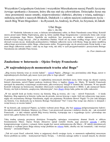 Wszystkim Czcigodnym Gościom i wszystkim Mieszkańcom naszej Parafii życzymy żywego spotkania z Jezusem, który dla nas stał się człowiekiem. Dzieciątko Jezus ma moc przemienić nasze smutki, niepowodzenia i słabości, abyśmy z wiarą, nadzieją i miłością myśleli o naszych Bliskich, Dalekich i o całym naszym codziennym życiu – niech Bóg Wam błogosławi – ks.Ryszard, ks.Andrzej, ks.Piotr, ks.Szymon, kl.Jakub Ufać Bogu (Łk 1, 26-38) IV Niedziela Adwentu to czas, w którym uświadamiamy sobie, że Boże Narodzenie coraz bliżej. Kościół stawia przed nami Matkę Najświętszą, jako tą, która zaufała Bogu bezgranicznie i zawierzyła Jemu całe swoje życie przyjmując Jego Słowo. Zgodziła się osobiście, bez przymusu na wielkie tajemnice i wszystkie konsekwencje swojej decyzji. „Oto ja służebnica Pańska. Niech mi się stanie według twego słowa”. W tych słowach wyraża się jej doskonałe posłuszeństwo. Oddanie całkowite życia woli Bożej. Stają się także modlitwą całkowitego powierzenia siebie Bogu, ofiarowania siebie. Przygotowując się do przeżywania Świąt każdy z nas musi Bogu całkowicie zaufać i zdać się na Jego wolę, tak żeby w tych przygotowaniach i przeżywaniu Bożego Narodzenia nie zabrakło Pana Jezusa. - ks. Piotr Jakubowski Znalezione w Internecie – Ojciec Święty Franciszek: „W najtrudniejszych momentach trzeba ufać Bogu” „Bóg tworzy historię wraz ze swoim ludem” – mówił Papież. „Dlatego i my powinniśmy ufać Bogu, nawet w najtrudniejszych chwilach, gdy nasze życie jest tylko w Jego rękach” - dodał. O potrzebie zawierzenia Bogu nawet w najbardziej mrocznych chwilach życia, które mogą się okazać częścią historii zbawienia, mówił Papież podczas środowej Mszy w kaplicy Domu św. Marty. W homilii Franciszek nawiązał do atmosfery wytężonego oczekiwania, jaka towarzyszy liturgii w ostatnie dni Adwentu. W ten sposób Kościół wskazuje na historyczny charakter zbawczych wydarzeń opisywanych w Biblii. I, jak zaznaczył Ojciec Święty, nie była to historia „aseptyczna, laboratoryjna”, lecz długie dzieje ludu, pełne nie tylko sukcesów. „W ten sposób krok po kroku tworzy się historię. Bóg ją tworzy, ale i my – mówił Franciszek. – A kiedy błądzimy, Bóg naprawia tę historię i pcha nas do przodu, zawsze krocząc z nami. Jeśli nie zobaczymy tego jasno, nigdy nie zrozumiemy Bożego Narodzenia, nigdy nie pojmiemy Wcielenia Słowa! Nigdy! To jest cała dziejąca się historia. Czy skończyła się ta historia Bożego Narodzenia? Nie! I teraz Pan wciąż nas zbawia w dziejach i wciąż kroczy ze swoim ludem”. W tej historii, jak zaznaczył Papież, są ludzie wybrani przez Boga, aby być pomocą pielgrzymującemu ludowi. Do takich należeli Abraham, Mojżesz czy Eliasz. I oni przeżywali mroczne i niełatwe chwile, ale – jak stwierdził Franciszek – w taki właśnie sposób Bóg tworzy historię, wytrącając nas z wygodnego życia i prowadząc nas nawet tam, gdzie byśmy iść nie chcieli. Taką trudną sytuację przytacza dzisiejsza Ewangelia, opisująca wewnętrzny dramat Józefa w obliczu brzemienności Maryi. Ojciec Święty obrazowo opisał rozterki Józefa, jego poczucie zawodu i próbę kompromisowego wyjścia z sytuacji, która mogła być nawet niebezpieczna dla Maryi. „W takich nieciekawych chwilach ci wybrani przez Boga muszą wziąć problem na własne barki, choćby nic nie rozumieli, i tak tworzyć historię” – stwierdził Papież. „Tak też czyni Józef, człowiek, który w najgorszej chwili swojego życia, w momencie najbardziej mrocznym bierze problem na siebie – kontynuował Ojciec Święty. – I obwinia samego siebie w oczach innych, by chronić swoją małżonkę. Pewnie jakiś psychoanalityk powie, że ten jego sen to esencja trwogi, która szuka ujścia... Ale niech mówią co chcą. Co jednak zrobił Józef? Powstawszy ze snu, wziął do siebie swoją małżonkę, jakby rzekł: «Nic nie rozumiem, ale Pan mi tak powiedział i ten urodzi się jako mój syn!»”. „W ten sposób Bóg tworzy historię wraz ze swoim ludem – mówił dalej Papież. – A czyni to wystawiając na próbę swoich wybranych, choć ostatecznie ich ratuje”. Dlatego i my powinniśmy ufać Bogu, nawet w najtrudniejszych chwilach, gdy nasze życie jest tylko w Jego rękach. Czego zatem uczą nas ci wybrani przez Boga? „Że Bóg idzie z nami, że Bóg tworzy historię, że Bóg poddaje nas próbie, ale ratuje nas w najgorszych chwilach, bo jest naszym Ojcem. A według Pawła jest On naszym Tatusiem. Niech Pan da nam zrozumieć tę tajemnicę Jego kroczenia ze swoim ludem przez dzieje, tego wystawiania na próbę swoich wybranych oraz ich wielkość serca, gdy biorą na siebie boleści, problemy, także pozory grzechu – jak w przypadku Jezusa – by rozwijać dalej historię” – zakończył homilię Ojciec Święty. ed/Radio Watykańskie 18.12.2014, 20:41 http://www.fronda.pl/a/franciszek-w-najtrudniejszych-momentach-trzeba-ufac-bogu,45256.html Ogłoszenia duszpasterskie 1. Ostatnie w tym roku Msze Święte Roratnie w poniedziałek i wtorek o 18:00 oraz we wtorek o 6:45. Dzisiaj prosimy dzieci uczestniczące w Roratach o pozostawienie zakrystii podpisanej planszy roratniej. 2. Biuro parafialne w tym tygodniu czynne będzie tylko we wtorek – w nagłych sprawach prosimy kontaktować się z księdzem po rannej Mszy Świętej, a w sobotę od 8:00 do 8:30. Biuro parafialne w okresie kolędowym (do połowy lutego) czynne będzie tylko w sobotę od 8:00 do 8:30. 3. Zapraszamy na Koronkę do Bożego Miłosierdzia w poniedziałek, Godzinki do Najświętszej Marii Panny Niepokalanie Poczętej w niedzielę o 7:30. 4. Zbiórka wszystkich ministrantów w najbliższy poniedziałek o 17:00. 5. Chór „Epifania” nie będzie miał prób w najbliższe wtorki (23 i 30 grudnia), spotka się za to w dzisiejszą niedzielę o 19:00. 6. Chorych z Komunią Święt