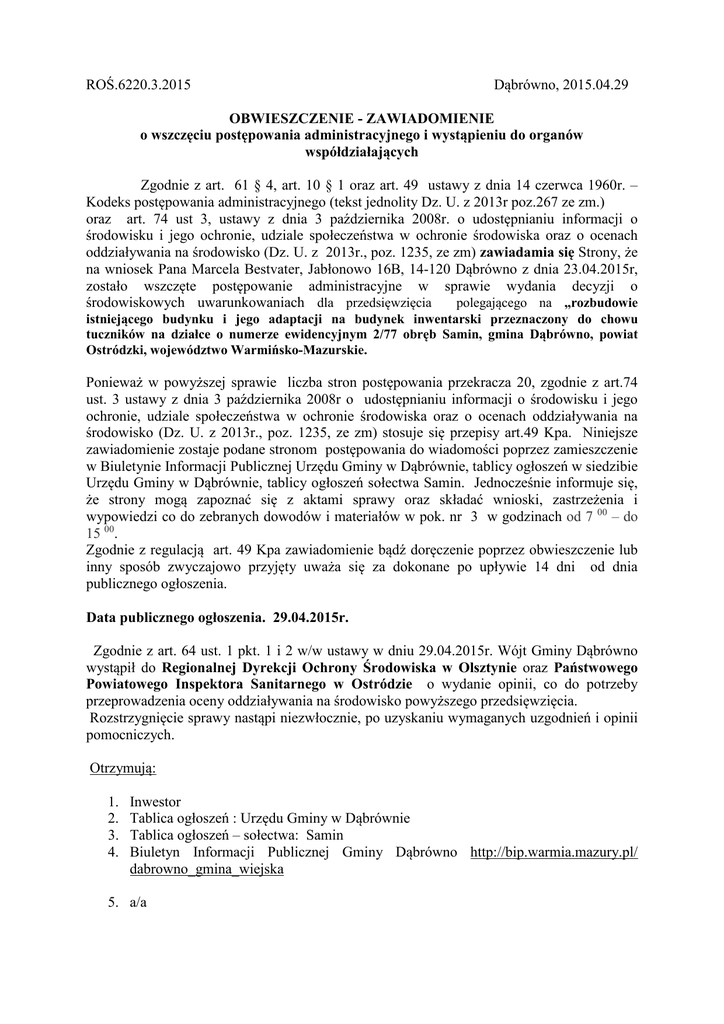 ROŚ.6220.3.2015 Dąbrówno, 2015.04.29 OBWIESZCZENIE - ZAWIADOMIENIE o wszczęciu postępowania administracyjnego i wystąpieniu do organów współdziałających Zgodnie z art. 61 § 4, art. 10 § 1 oraz art. 49 ustawy z dnia 14 czerwca 1960r. – Kodeks postępowania administracyjnego (tekst jednolity Dz. U. z 2013r poz.267 ze zm.) oraz art. 74 ust 3, ustawy z dnia 3 października 2008r. o udostępnianiu informacji o środowisku i jego ochronie, udziale społeczeństwa w ochronie środowiska oraz o ocenach oddziaływania na środowisko (Dz. U. z 2013r., poz. 1235, ze zm) zawiadamia się Strony, że na wniosek Pana Marcela Bestvater, Jabłonowo 16B, 14-120 Dąbrówno z dnia 23.04.2015r, zostało wszczęte postępowanie administracyjne w sprawie wydania decyzji o środowiskowych uwarunkowaniach dla przedsięwzięcia polegającego na „rozbudowie istniejącego budynku i jego adaptacji na budynek inwentarski przeznaczony do chowu tuczników na działce o numerze ewidencyjnym 2/77 obręb Samin, gmina Dąbrówno, powiat Ostródzki, województwo Warmińsko-Mazurskie. Ponieważ w powyższej sprawie liczba stron postępowania przekracza 20, zgodnie z art.74 ust. 3 ustawy z dnia 3 października 2008r o udostępnianiu informacji o środowisku i jego ochronie, udziale społeczeństwa w ochronie środowiska oraz o ocenach oddziaływania na środowisko (Dz. U. z 2013r., poz. 1235, ze zm) stosuje się przepisy art.49 Kpa. Niniejsze zawiadomienie zostaje podane stronom postępowania do wiadomości poprzez zamieszczenie w Biuletynie Informacji Publicznej Urzędu Gminy w Dąbrównie, tablicy ogłoszeń w siedzibie Urzędu Gminy w Dąbrównie, tablicy ogłoszeń sołectwa Samin. Jednocześnie informuje się, że strony mogą zapoznać się z aktami sprawy oraz składać wnioski, zastrzeżenia i wypowiedzi co do zebranych dowodów i materiałów w pok. nr 3 w godzinach od 7 00 – do 15 00. Zgodnie z regulacją art. 49 Kpa zawiadomienie bądź doręczenie poprzez obwieszczenie lub inny sposób zwyczajowo przyjęty uważa się za dokonane po upływie 14 dni od dnia publicznego ogłoszenia. Data publicznego ogłoszenia. 29.04.2015r. Zgodnie z art. 64 ust. 1 pkt. 1 i 2 w/w ustawy w dniu 29.04.2015r. Wójt Gminy Dąbrówno wystąpił do Regionalnej Dyrekcji Ochrony Środowiska w Olsztynie oraz Państwowego Powiatowego Inspektora Sanitarnego w Ostródzie o wydanie opinii, co do potrzeby przeprowadzenia oceny oddziaływania na środowisko powyższego przedsięwzięcia. Rozstrzygnięcie sprawy nastąpi niezwłocznie, po uzyskaniu wymaganych uzgodnień i opinii pomocniczych. Otrzymują: 1. 2. 3. 4. Inwestor Tablica ogłoszeń : Urzędu Gminy w Dąbrównie Tablica ogłoszeń – sołectwa: Samin Biuletyn Informacji Publicznej Gminy Dąbrówno http://bip.warmia.mazury.pl/ dabrowno_gmina_wiejska 5. a/a