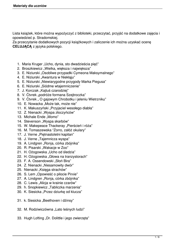 Materiały dla uczniów Lista książek, które można wypożyczyć z biblioteki, przeczytać, przyjść na dodatkowe zajęcia i opowiedzieć p. Stradomskiej. Za przeczytanie dodatkowych pozycji książkowych i zaliczenie ich można uzyskać ocenę CELUJĄCĄ z języka polskiego. 1. Maria Kruger „Ucho, dynia, sto dwadzieścia pięć” 2. Broszkiewicz „Wielka, większa i największa” 3. E. Niziurski „Osobliwe przypadki Cymeona Maksymalnego” 4. E. Niziurski „Awantura w Niekłąju” 5. E. Niziurski „Niewiarygodne przygody Marka Piegusa” 6. E. Niziurski „Siódme wtajemniczenie” 7. J. Korczak „Kajtuś czarodziej” 8. V. Ćtvrek „podróże formana Szejtroczka” 9. V. Ćtvrek „ O gajowym Chrobotku i jeleniu Wietrzniku” 10. E. Nowacka „Może tak, może nie” 11. K. Makuszyński „Przyjaciel wesołego diabła” 12. Z. Nienacki „Wyspa złoczyńców” 13. Michale Ende „Momo” 14. Stevenson „Wyspa skarbów” 15. W. Makepeace Thackeray „Pierścień i róża” 16. M. Tomaszewska “Zorro, załóż okulary” 17. J. Verne „Piętnastoletni kapitan” 18. J. Verne „Tajemnicza wyspa” 19. A. Lindgren „Ronja, córka zbójnika” 20. R. Pisarski „Wakacje w Zoo” 21. H. Ożogowska „Ucho od śledzia” 22. H. Ożogowska „Głowa na tranzystorach” 23. F. A. Ossendowski „Słoń Bira” 24. Z. Nienacki „Niesamowity dwór” 25. Nienacki „Księga strachów” 26. S. Lem „Opowieść o pilocie Pirxie” 27. A. Lindgren „Ronja, córka zbójnika” 28. C. Lewis „Alicja w krainie czarów” 29. h. Snopkiewicz „Tabliczka marzenia” 30. K. Siesicka „Przez dziurkę od klucza” 31. k. Siesicka „Beethoven i dżinsy” 32. M. Rodziwiczówna „Lato leśnych ludzi” 33. Hugh Lofting „Dr. Dolittle i jego zwierzęta” 1/6 Materiały dla uczniów WYKAZ LEKTUR OBOWIĄZKOWYCH I UZUPEŁNIAJĄCYCH W ROKU SZKOLNYM 2013/2014 Klasa IV Lektury obowiązkowe: J. Brzechwa „Akademia Pana Kleksa” (październik) Collodi C. „Pinokio” (luty) 2/6 Materiały dla uczniów Burnett F.E. „Mała księżniczka” (grudzień) Szmaglewska S. „Czarne stopy” (kwiecień) Roalda Dahl „Charlie i fabryka czekolady” (maj) Lektury uzupełniające: J. Korczak „Król Maciuś Pierwszy” Maria Kruger „Ucho, dynia, sto dwadzieścia pięć!” Andersen .H.Ch.: Baśnie Grimm J.L. i W.: Baśnie Perrault Ch.: Baśnie Klasa V Lektury obowiązkowe: 3/6 Materiały dla uczniów Sienkiewicz H. „W pustyni i w puszczy” (październik) Niziurski E. „Sposób na Alcybiadesa”(luty) Molnar F. „Chłopcy z Placu Broni” (grudzień) Twain M. „Przygody Tomka Sawyera” (maj) Astrid Lindgren „Bracia Lwie serce” (kwiecień) Lektury uzupełniające: M.Eden: Momo Burnett F.E. „Tajemniczy ogród” Makuszyński K. „Panna z mokrą głową” Parandowski J. „Przygody Odyseusza” Sat Okh: „Biały mustang” Oppman A. Legendy warszawskie 4/6 Materiały dla uczniów Klasa VI Lektury obowiązkowe: Jurgielewiczowa J. „Ten obcy” (styczeń) Musierowicz M. „Kłamczucha” (październik) Makuszyński K. „Szatan z siódmej klasy” (kwiecień) Montgomery L.M. „Ania z Zielonego Wzgórza” (marzec) Verne J. „W 80 dni dookoła świata” (maj) Karol Dickens „Opowieść wigilijna” (listopad) Lektury uzupełniające: H.Ożogowska „Tajemnica zielonej pieczęci” Lem S.: „Bajki robotów” 5/6 Materiały dla uczniów Ks. Twardowski J. „Zeszyt w kratkę” Ożogowska H. „Dziewczyna i chłopak” R.L.Stevenson „Wyspa skarbów” 6/6