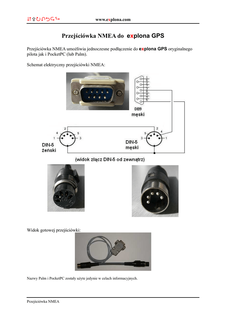 www.explona.com Przejściówka NMEA do explona GPS Przejściówka NMEA umożliwia jednoczesne podłączenie do explona GPS oryginalnego pilota jak i PocketPC (lub Palm). Schemat elektryczny przejściówki NMEA: Widok gotowej przejściówki: Nazwy Palm i PocketPC zostały użyte jedynie w celach informacyjnych. Przejściówka NMEA