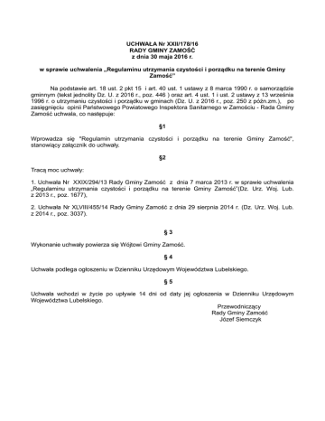 UCHWAŁA Nr XXII/178/16 RADY GMINY ZAMOŚĆ z dnia 30 maja 2016 r. w sprawie uchwalenia „Regulaminu utrzymania czystości i porządku na terenie Gminy Zamość” Na podstawie art. 18 ust. 2 pkt 15 i art. 40 ust. 1 ustawy z 8 marca 1990 r. o samorządzie gminnym (tekst jednolity Dz. U. z 2016 r., poz. 446 ) oraz art. 4 ust. 1 i ust. 2 ustawy z 13 września 1996 r. o utrzymaniu czystości i porządku w gminach (Dz. U. z 2016 r., poz. 250 z późn.zm.), po zasięgnięciu opinii Państwowego Powiatowego Inspektora Sanitarnego w Zamościu - Rada Gminy Zamość uchwala, co następuje: §1 Wprowadza się "Regulamin utrzymania czystości i porządku na terenie Gminy Zamość", stanowiący załącznik do uchwały. §2 Tracą moc uchwały: 1. Uchwała Nr XXIX/294/13 Rady Gminy Zamość z dnia 7 marca 2013 r. w sprawie uchwalenia „Regulaminu utrzymania czystości i porządku na terenie Gminy Zamość”(Dz. Urz. Woj. Lub. z 2013 r., poz. 1677), 2. Uchwała Nr XLVIII/455/14 Rady Gminy Zamość z dnia 29 sierpnia 2014 r. (Dz. Urz. Woj. Lub. z 2014 r., poz. 3037). §3 Wykonanie uchwały powierza się Wójtowi Gminy Zamość. §4 Uchwała podlega ogłoszeniu w Dzienniku Urzędowym Województwa Lubelskiego. §5 Uchwała wchodzi w życie po upływie 14 dni od daty jej ogłoszenia w Dzienniku Urzędowym Województwa Lubelskiego. Przewodniczący Rady Gminy Zamość Józef Siemczyk Uzasadnienie do Uchwał w sprawie odpadów komunalnych: Dotychczasowe akty prawa miejscowego wydane na podstawie art. 4, art. 6n, art. 6r ust 3 i 4 ustawy o utrzymaniu czystości i porządku w gminach tracą moc prawną z końcem lipca 2016 roku. Jest to skutek ustawy z dnia 28.11.2014 roku, którą wprowadzona została zmiana ustawy o utrzymaniu czystości i porządku w gminach. W związku z powyższym, każda gmina by móc realizować gospodarkę odpadami musi przyjąć nowe regulacje prawne. Dokonano poprawek ,,kosmetycznych,, wykreślono to co zarzucała Prokuratura w regulaminie utrzymania czystości na terenie Gminy Zamość. Projekty uchwał posiadają pozytywną opinię Sanepidu. Wyk. Referat Gospodarki Komunalnej i Miesz. - Jerzy Sobczuk
