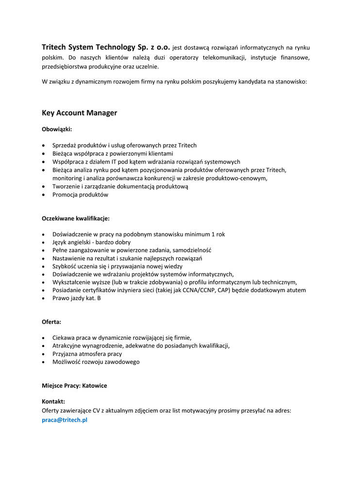 Tritech System Technology Sp. z o.o. jest dostawcą rozwiązań informatycznych na rynku polskim. Do naszych klientów należą duzi operatorzy telekomunikacji, instytucje finansowe, przedsiębiorstwa produkcyjne oraz uczelnie. W związku z dynamicznym rozwojem firmy na rynku polskim poszykujemy kandydata na stanowisko: Key Account Manager Obowiązki: Sprzedaż produktów i usług oferowanych przez Tritech Bieżąca współpraca z powierzonymi klientami Współpraca z działem IT pod kątem wdrażania rozwiązań systemowych Bieżąca analiza rynku pod kątem pozycjonowania produktów oferowanych przez Tritech, monitoring i analiza porównawcza konkurencji w zakresie produktowo-cenowym, Tworzenie i zarządzanie dokumentacją produktową Promocja produktów Oczekiwane kwalifikacje: Doświadczenie w pracy na podobnym stanowisku minimum 1 rok Język angielski - bardzo dobry Pełne zaangażowanie w powierzone zadania, samodzielność Nastawienie na rezultat i szukanie najlepszych rozwiązań Szybkość uczenia się i przyswajania nowej wiedzy Doświadczenie we wdrażaniu projektów systemów informatycznych, Wykształcenie wyższe (lub w trakcie zdobywania) o profilu informatycznym lub technicznym, Posiadanie certyfikatów inżyniera sieci (takiej jak CCNA/CCNP, CAP) będzie dodatkowym atutem Prawo jazdy kat. B Oferta: Ciekawa praca w dynamicznie rozwijającej się firmie, Atrakcyjne wynagrodzenie, adekwatne do posiadanych kwalifikacji, Przyjazna atmosfera pracy Możliwość rozwoju zawodowego Miejsce Pracy: Katowice Kontakt: Oferty zawierające CV z aktualnym zdjęciem oraz list motywacyjny prosimy przesyłać na adres: [email protected]