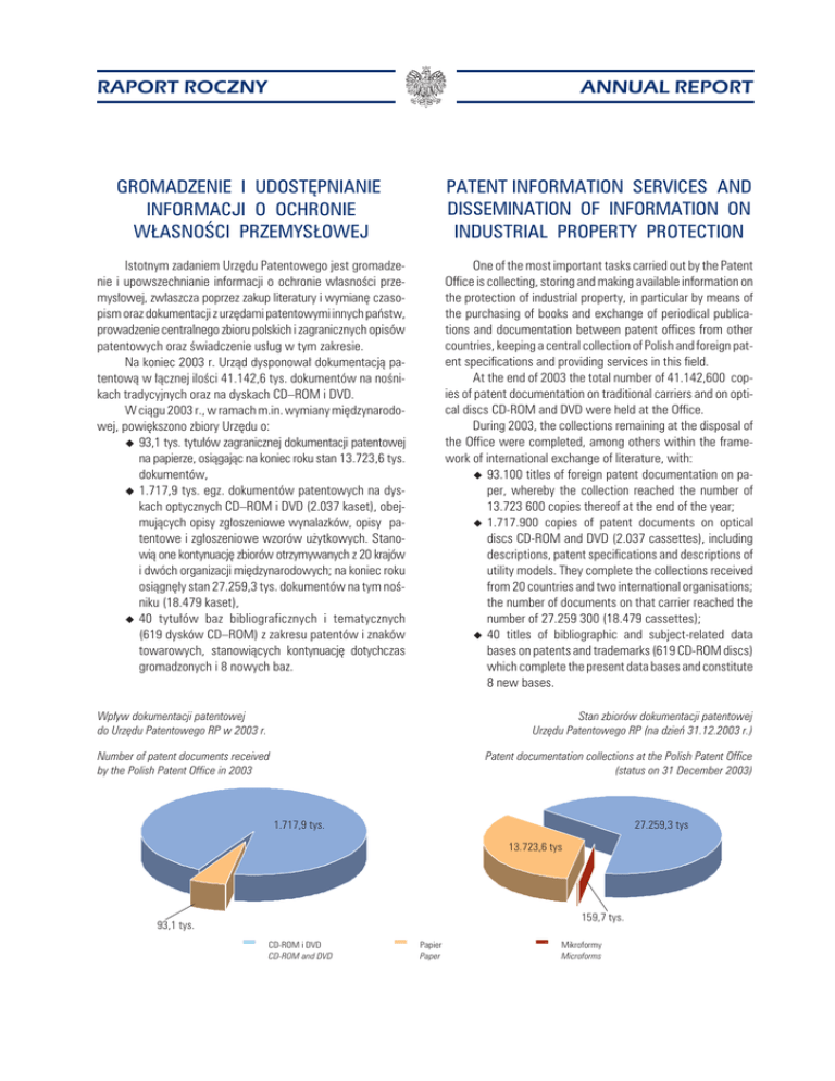 RAPORT ROCZNY ANNUAL REPORT GROMADZENIE I UDOSTÊPNIANIE INFORMACJI O OCHRONIE W£ASNOŒCI PRZEMYS£OWEJ PATENT INFORMATION SERVICES AND DISSEMINATION OF INFORMATION ON INDUSTRIAL PROPERTY PROTECTION Istotnym zadaniem Urzêdu Patentowego jest gromadzenie i upowszechnianie informacji o ochronie w³asnoœci przemys³owej, zw³aszcza poprzez zakup literatury i wymianê czasopism oraz dokumentacji z urzêdami patentowymi innych pañstw, prowadzenie centralnego zbioru polskich i zagranicznych opisów patentowych oraz œwiadczenie us³ug w tym zakresie. Na koniec 2003 r. Urz¹d dysponowa³ dokumentacj¹ patentow¹ w ³¹cznej iloœci 41.142,6 tys. dokumentów na noœnikach tradycyjnych oraz na dyskach CD–ROM i DVD. W ci¹gu 2003 r., w ramach m.in. wymiany miêdzynarodowej, powiêkszono zbiory Urzêdu o: u 93,1 tys. tytu³ów zagranicznej dokumentacji patentowej na papierze, osi¹gaj¹c na koniec roku stan 13.723,6 tys. dokumentów, u 1.717,9 tys. egz. dokumentów patentowych na dyskach optycznych CD–ROM i DVD (2.037 kaset), obejmuj¹cych opisy zg³oszeniowe wynalazków, opisy patentowe i zg³oszeniowe wzorów u¿ytkowych. Stanowi¹ one kontynuacjê zbiorów otrzymywanych z 20 krajów i dwóch organizacji miêdzynarodowych; na koniec roku osi¹gnê³y stan 27.259,3 tys. dokumentów na tym noœniku (18.479 kaset), u 40 tytu³ów baz bibliograficznych i tematycznych (619 dysków CD–ROM) z zakresu patentów i znaków towarowych, stanowi¹cych kontynuacjê dotychczas gromadzonych i 8 nowych baz. One of the most important tasks carried out by the Patent Office is collecting, storing and making available information on the protection of industrial property, in particular by means of the purchasing of books and exchange of periodical publications and documentation between patent offices from other countries, keeping a central collection of Polish and foreign patent specifications and providing services in this field. At the end of 2003 the total number of 41.142,600 copies of patent documentation on traditional carriers and on optical discs CD-ROM and DVD were held at the Office. During 2003, the collections remaining at the disposal of the Office were completed, among others within the framework of international exchange of literature, with: u 93.100 titles of foreign patent documentation on paper, whereby the collection reached the number of 13.723 600 copies thereof at the end of the year; u 1.717.900 copies of patent documents on optical discs CD-ROM and DVD (2.037 cassettes), including descriptions, patent specifications and descriptions of utility models. They complete the collections received from 20 countries and two international organisations; the number of documents on that carrier reached the number of 27.259 300 (18.479 cassettes); u 40 titles of bibliographic and subject-related data bases on patents and trademarks (619 CD-ROM discs) which complete the present data bases and constitute 8 new bases. Wp³yw dokumentacji patentowej do Urzêdu Patentowego RP w 2003 r. Stan zbiorów dokumentacji patentowej Urzêdu Patentowego RP (na dzieñ 31.12.2003 r.) Number of patent documents received by the Polish Patent Office in 2003 Patent documentation collections at the Polish Patent Office (status on 31 December 2003) 27.259,3 tys 1.717,9 tys. 13.723,6 tys 159,7 tys. 93,1 tys. CD-ROM i DVD CD-ROM and DVD Papier Paper Mikroformy Microforms RAPORT ROCZNY Ponadto pozyskano: u 202 tytu³y publikacji (4.858 zeszytów) literatury patentowej, technicznej i prawnej na papierze, u 158 woluminów druków zwartych o tematyce naukowo-technicznej i prawnej. Opracowano, usystematyzowano i w³¹czono do zbiorów wp³ywaj¹c¹ dokumentacjê i literaturê patentow¹. W 2003 roku Urz¹d Patentowy udostêpni³ czytelnikom z zewn¹trz i ekspertom UP RP ponad 7,4 tys. teczek z zagraniczn¹ dokumentacj¹ patentow¹. Nale¿y podkreœliæ, ¿e nast¹pi³ wyraŸny spadek zainteresowania czytelników noœnikiem tradycyjnym (papierowym), co wynika ze wzrastaj¹cej ³atwoœci dostêpu do zasobów dokumentacji na CD–ROM i DVD oraz zasobów dostêpnych w Internecie. Udostêpniono tak¿e 16,6 tys. pojedynczych polskich i zagranicznych opisów patentowych, 0,6 tys. woluminów druków zwartych, 0,9 tys. czasopism oraz, w wolnym dostêpie, zbiory polskiej dokumentacji i literatury patentowej, wykazy zg³oszonych i zarejestrowanych znaków towarowych, wykazy wy³o¿eñ wzorów zdobniczych. Wykonano 28.504 wyszukiwañ w bazach patentowych na CD–ROM dla ponad 5,7 tys. u¿ytkowników z zewn¹trz oraz pobrano z bazy ARSPATENT oko³o 73 tys. kB informacji dla 1,4 tys. u¿ytkowników. W ramach dystrybucji sprzedano 1 komplet bazy TRACES nowej edycji. Na zamówienia u¿ytkowników wykonano odp³atnie ok. 190 tys. stron, a dla ekspertów Urzêdu bezp³atnie oko³o 290 tys. stron kopii polskiej i zagranicznej dokumentacji patentowej oraz prowadzono wyszukiwania w bazach danych na CD–ROM i internetowych. Do 27 krajowych oœrodków informacji patentowej przekazano 1.773 dyski z pe³notekstowymi bazami na CD–ROM, 454 zeszyty biuletynów patentowych, 191 sztuk dysków z literatur¹ patentow¹ oraz 2.859 egz. opisów polskich wzorów u¿ytkowych i zdobniczych. W 2003 r., podobnie jak w latach poprzednich, Urz¹d Patentowy podejmowa³ szereg ró¿norodnych dzia³añ maj¹cych na celu upowszechnianie wiedzy z zakresu ochrony w³asnoœci przemys³owej. Do dzia³añ tych nale¿y zaliczyæ w szczególnoœci: u zorganizowanie na terenie Urzêdu cyklu publicznych odczytów na wybrane tematy z zakresu ochrony w³asnoœci przemys³owej w Polsce. S³uchaczami byli m.in. rzecznicy patentowi, cz³onkowie stowarzyszeñ zawodowych i organizacji ANNUAL REPORT Additionally there were acquired: 202 titles of publications (4.858 pamphlets) of patent, technical and law literature on paper u 158 volumes of books on scientific, technical and legal issues. The received patent literature and documentation was made up, arranged and added to the existing c