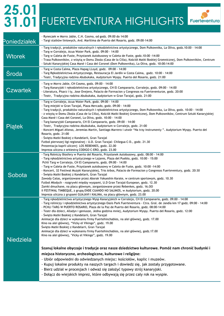 25.01 31.01 FUERTEVENTURA HIGHLIGHTS Poniedziałek - Ryneczek w Morro Jable, C.H. Cosmo, od godz. 09:00 do 14:00 - Targi statków liniowych, Avd. Marítima de Puerto del Rosario, godz. 09:00-14:00 Wtorek - Środa - Targ w Costa Calma, Plaza Hapag LLoyd, godz. 09:00 - 14:00 - Targ Rękodzielnictwa Artystycznego, Restauracja El Jardín w Costa Calma, godz. 10:00 - 14:00 - Teatr, Tradycyjna rodzina Abubukaka, Audytorium Wyspy. Puerto del Rosario, godz. 21:00 Czwartek - Piątek - Targ w Corralejo, Acua Water Park, godz. 09:00 - 14:00 - Targ miejski w Gran Tarajal, Plaza Mercado, godz. 09:00 - 14:00 - Targ tradycji, produktów naturalnych i rękodzielnictwa artystycznego, Dom Pułkownika, La Oliva, godz. 10:00 - 14:00 - z wizytą w Domu Zboża (Casa de la Cilla), Kościół Matki Boskiej Gromnicznej, Dom Pułkowników, Centrum Sztuki Kanaryjskiej Casa Mané i Casa del Coronel, La Oliva, godz. 10:00 - 14:00 - Targ kanaryjski Campanario, CH El Campanario, godz. 09:00 - 14:00 - Teatr, Tradycyjna rodzina Abubukaka, Audytorium w Corralejo, godz. 21:00 - Koncert Miguel Afonso, Jeremias Martin, Santiago Marrero i utwór “Na trzy instrumenty ”. Audytorium Wyspy. Puerto del Rosario, godz. 21:00 - Święto Matki Boskiej z Kandelarii, Gran Tarajal Futbol pierwszej ligi regionalnej : U.D. Gran Tarajal- Chilegua C-D., godz. 21.30 Prezentacja kaprli ulicznrj LOS REBENKES, godz. 22.00 Impreza uliczna z orkiestrą CODIGO C-ERO, godz. 23.00 Sobota Niedziela Targ tradycji, produktów naturalnych i rękodzielnictwa artystycznego, Dom Pułkownika, La Oliva, godz.10:00 - 14:00 Targ w Corralejo, Acua Water Park, godz. 09:00 - 14:00 Targ w Caleta de Fuste, Przystanek Autobusowy w Caleta de Fuste, godz.10:00 -14:00 Trasa Pułkowników, z wizytą w Domu Zboża (Casa de la Cilla), Kościół Matki Boskiej Gromnicznej, Dom Pułkowników, Centrum Sztuki Kanaryjskiej Casa Mané i Casa del Coronel (Dom Pułkownika), La Oliva, godz. 10:00:14:00 Targ w Morro Jable, CH Cosmo, godz. 09:00 - 14:00 Targ Kanaryjski i rękodzielnictwa artystycznego, CH El Campanario, Corralejo, godz. 09:00 - 14:00 Literatura, Pisarz i ty, Jose Ovejero, Palacio de Formacion y Congresos na Fuerteventurze, godz. 20:00 Teatr, Tradycyjna rodzina Abubukaka, Audytorium w Gran Tarajal, godz. 21:00 -Targ Rolniczy Biosfery w Puerto del Rosario, Przystanek Autobusowy, godz. 08:00 - 14:00 - Targ rękodzielnictwa artystycznego w Lajares, Plaza del Pueblo, godz. 10:00 - 15:00 Pchli Targ w Corralejo, CH El Campanario, godz. 09:00 - 14:00 - Targ w Caleta de Fuste, Przystanek autobusowy w Caleta de Fuste, godz. 10:00 -14:00 - Koncert, 32 Festiwal Muzyki Kanaryjskiej, Trio Arbos, Palacio de Formacion y Congresos Fuerteventury, godz. 20:30 - Święto Matki Boskiej z Kandelarii, Gran Tarajal Zawody Catas, organizowane przez Aborak Yokueshin Karate, w centrum sportowym, godz. 10.30 Futbol Młodych - rozgrywki między wyspami, U.D Gran Tarajal-European, godz. 12.30 Zamki dmuchane, na placu głównym, zorganizowane przez Rebenkes, godz. 16.OO II FESTIWAL TIMBEQUE, z grupą ENDE CUANDO NO SALIMOS, w Audytorium, godz. 20.00 Impreza uliczna z grupami GUAJAVI i KALIMA, na placu głównym, godz. 23.00 - Targ rękodzielnictwa artystycznego Wysp Kanaryjskich w Corralejo, CH El Campanario, godz. 09:00 - 14:00 - Targ roliniczy i rękodzielnictwa artystycznego Oasis Park Fuerteventura - Ctra. Gral. de Jandía km 17 godz. 09:00 - 14:00 - PCHLI TARG W PUERTO ROSARIO, Plaza de la Paz de Puerto del Rosario, godz. 08:00-14:00 - Teatr dla dzieci, Alladyn i geniusze, Jedna godzina mniej, Audytorium Wyspy. Puerto del Rosario, godz. 12:00 - Święto Matki Boskiej z Kandelarii, Gran Tarajal Animacje dla dzieci w wykonaniu firmy Fuertehinchables, na alei głównej, godz. 17.00 Kino na alei głównej, “Vicky el Vikingo”, godz. 19.00 Święto Matki Boskiej z Kandelarii, Gran Tarajal Animacje dla dzieci w wykonaniu firmy Fuertehinchables, na alei głównej, godz.17.00 Kino na alei głównej, "Vicky el Vikingo”, godz. 19.00 Szanujlokalneobyczajeitradycjeoraznaszedziedzictwokulturowe.Pomóżnamchronićbudynkii miejscahistoryczne,archeologiczne,kulturoweireligijne: - Ubiór odpowiedni do odwiedzanych miejsc: kościołów, kaplic i muzeów. Kupuj lokalne produkty na naszych targach i dowiedz się, jak zostały przygotowane. Bierz udział w procesjach i odważ się założyć typowy strój kanaryjski. Dołącz do wiejskich imprez, które odbywają się przez cały rok na wyspie.