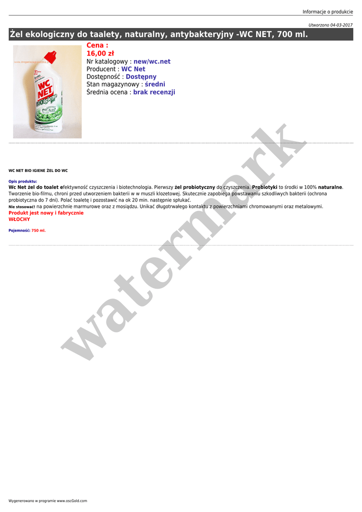 Informacje o produkcie Utworzono 04-03-2017 Żel ekologiczny do taalety, naturalny, antybakteryjny -WC NET, 700 ml. Cena : 16,00 zł WC NET BIO IGIENE ŻEL DO WC Opis produktu: er m ar k Nr katalogowy : new/wc.net Producent : WC Net Dostępność : Dostępny Stan magazynowy : średni Średnia ocena : brak recenzji Wc Net żel do toalet efektywność czyszczenia i biotechnologia. Pierwszy żel probiotyczny do czyszczenia. Probiotyki to środki w 100% naturalne. Tworzenie bio-filmu, chroni przed utworzeniem bakterii w w muszli klozetowej. Skutecznie zapobiega powstawaniu szkodliwych bakterii (ochrona probiotyczna do 7 dni). Polać toaletę i pozostawić na ok 20 min. następnie spłukać. Nie stosować! na powierzchnie marmurowe oraz z mosiądzu. Unikać długotrwałego kontaktu z powierzchniami chromowanymi oraz metalowymi. Produkt jest nowy i fabrycznie WŁOCHY w at Pojemność: 750 ml. Wygenerowano w programie www.oscGold.com