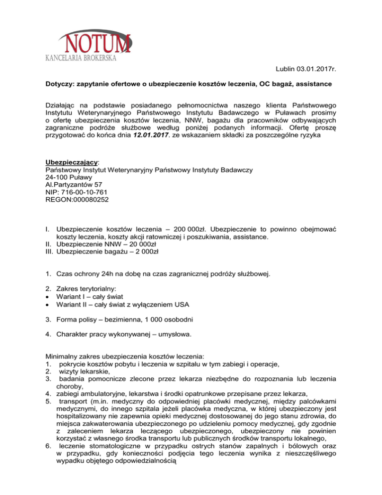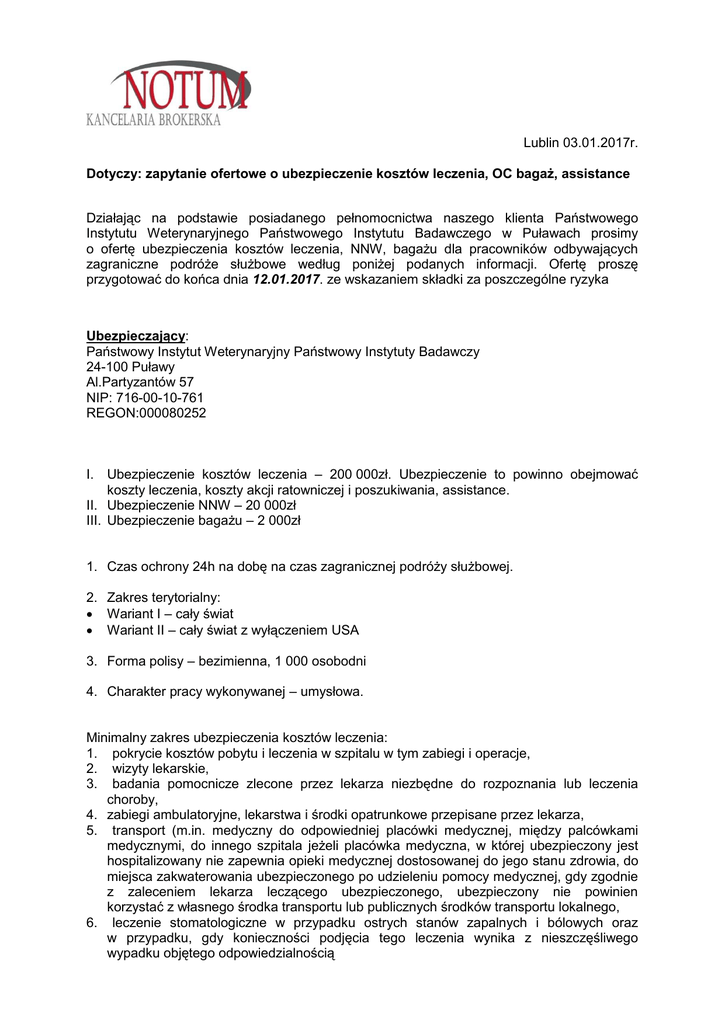 Lublin 03.01.2017r. Dotyczy: zapytanie ofertowe o ubezpieczenie kosztów leczenia, OC bagaż, assistance Działając na podstawie posiadanego pełnomocnictwa naszego klienta Państwowego Instytutu Weterynaryjnego Państwowego Instytutu Badawczego w Puławach prosimy o ofertę ubezpieczenia kosztów leczenia, NNW, bagażu dla pracowników odbywających zagraniczne podróże służbowe według poniżej podanych informacji. Ofertę proszę przygotować do końca dnia 12.01.2017. ze wskazaniem składki za poszczególne ryzyka Ubezpieczający: Państwowy Instytut Weterynaryjny Państwowy Instytuty Badawczy 24-100 Puławy Al.Partyzantów 57 NIP: 716-00-10-761 REGON:000080252 I. Ubezpieczenie kosztów leczenia – 200 000zł. Ubezpieczenie to powinno obejmować koszty leczenia, koszty akcji ratowniczej i poszukiwania, assistance. II. Ubezpieczenie NNW – 20 000zł III. Ubezpieczenie bagażu – 2 000zł 1. Czas ochrony 24h na dobę na czas zagranicznej podróży służbowej. 2. Zakres terytorialny: Wariant I – cały świat Wariant II – cały świat z wyłączeniem USA 3. Forma polisy – bezimienna, 1 000 osobodni 4. Charakter pracy wykonywanej – umysłowa. Minimalny zakres ubezpieczenia kosztów leczenia: 1. pokrycie kosztów pobytu i leczenia w szpitalu w tym zabiegi i operacje, 2. wizyty lekarskie, 3. badania pomocnicze zlecone przez lekarza niezbędne do rozpoznania lub leczenia choroby, 4. zabiegi ambulatoryjne, lekarstwa i środki opatrunkowe przepisane przez lekarza, 5. transport (m.in. medyczny do odpowiedniej placówki medycznej, między palcówkami medycznymi, do innego szpitala jeżeli placówka medyczna, w której ubezpieczony jest hospitalizowany nie zapewnia opieki medycznej dostosowanej do jego stanu zdrowia, do miejsca zakwaterowania ubezpieczonego po udzieleniu pomocy medycznej, gdy zgodnie z zaleceniem lekarza leczącego ubezpieczonego, ubezpieczony nie powinien korzystać z własnego środka transportu lub publicznych środków transportu lokalnego, 6. leczenie stomatologiczne w przypadku ostrych stanów zapalnych i bólowych oraz w przypadku, gdy konieczności podjęcia tego leczenia wynika z nieszczęśliwego wypadku objętego odpowiedzialnością leczenie związane z ciążą i porodem (w tym również koszty transportu medycznego do placówki medycznej), nie później jednak niż do zakończenia 32 tygodnia ciąży, 8. naprawa albo zakup protez (w tym dentystycznych), okularów korekcyjnych oraz środków pomocniczych których zniszczenie lub konieczność używania przez ubezpieczonego wynika z nieszczęśliwego wypadku ubezpieczeniowego objętego odpowiedzialnością 7. Ubezpieczenie kosztów leczenia powinno umożliwić rozliczenia bezgotówkowe między palcówką leczniczą a ubezpieczycielem. Nie dopuszcza się oferty, w której jedyną formą rozliczenia za koszty leczenia jest zwrot poniesionych kosztów przez ubezpieczonego na podstawie rachunków po powrocie do kraju (z wyjątkiem kosztów poniesionych np. na zakup leków). Brak franszyz integralnych i redukcyjnych. Brak konieczności podawania wykazu osób wyjeżdżających najpóźniej w dniu wyjazdu. Raz w miesiącu przekazywana będzie lista osób wyjeżdżających za granicę za miesiąc poprzedni z podaniem imienia i nazwiska, nr PESEL, daty wyjazdu i daty powrotu, miejsca wyjazdu. Minimalny zakres assistance: transport medyczny ubezpieczonego do domu, transport zwłok do miejsca pochówku (do faktycznie poniesionych kosztów), pokrycie kosztów poszukiwania i ratownictwa, organizacja kontynuacji leczenia po powrocie do domu na terenie RP dosłanie niezbędnych przedmiotów osobistych w przypadku uszkodzenia, zniszczenia lub utraty przedmiotów osobistych pomoc informacyjna i finansowa w przypadku kradzieży dokumentów pomoc w przekazaniu kaucji pomoc tłumacza pomoc prawna pokrycie kosztów poniesionych w związku z opóźnieniem podróży. Jeżeli dojdzie do udokumentowanego opóźnienia o co najmniej 6 godzin wylotu samolotu linii rejsowych, odjazdu pociągu lub autokaru lub wypłynięcia promu podczas podróży służbowej Z poważaniem Piotr Danilewicz