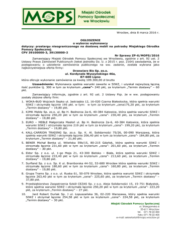 Wrocław, dnia 8 marca 2016 r. OGŁOSZENIE o wyborze wykonawcy dotyczy: przetargu nieograniczonego na dostawę mebli na potrzeby Miejskiego Ośrodka Pomocy Społecznej. CPV 39100000-3, 39130000-2 Nr Sprawy ZP-6/MOPS/2016 Zamawiający Miejski Ośrodek Pomocy Społecznej we Wrocławiu, zgodnie z art. 92 ust. 2 Ustawy Prawo Zamówień Publicznych (tekst jednolity Dz. U. z 2015 r. poz. 2164) zawiadamia, że w postępowaniu o udzielenie zamówienia publicznego na ww. zadanie, została wybrana jako najkorzystniejsza oferta firmy: Drzewiarz Bis Sp. zo.o. ul. Kardynała Wyszyńskiego 46a, 87-600 Lipno która oferuje wykonanie zamówienia za kwotę 109.300,00 zł brutto Uzasadnienie: Wykonawca spełnia warunki zawarte w SIWZ, i uzyskał najwyższą łączną ilość punktów tj. 300 w tym za kryterium „cena”- 240 pkt, za kryterium „Termin dostawy” – 60 pkt. Zamawiający informuje, zgodnie z art. 92 ust. 2 Ustawy Pzp. że w ww. postępowaniu zostały złożone oferty firm: 1. WOKA-BUD Wojciech Sepko ul. Jastrzębia 12, 16-020 Czarna Białostocka, która spełnia warunki SIWZ i otrzymała łącznie 195 pkt. w tym: w tym za kryterium „cena175,20 pkt, za kryterium „Termin dostawy” – 19,80 pkt. 2. KJMK Meble Sp. zo.o. ul. Bp H. Bednorza 2a-6, 40-384 Katowice, która spełnia warunki SIWZ i otrzymała łącznie 250,20 pkt w tym za kryterium „cena”- 230,40 pkt, za kryterium „Termin dostawy” – 19,80 pkt. 3. EURO – MEBLE Małgorzata Masłoń ul. Bp H. Bednorza 2a-6, 40-384 Katowice, która spełnia warunki SIWZ i otrzymała łącznie 219 pkt w tym za kryterium „cena”- 199,20 pkt, za kryterium „Termin dostawy” – 19,80 pkt. 4. KALL-CARRION TRADING Sp. zo.o. Sp. K. Al. Solidarności 75/26, 00-090 Warszawa, która spełnia warunki SIWZ i otrzymała łącznie 206,40 pkt w tym za kryterium „cena”- 184,80 pkt, za kryterium „Termin dostawy” – 21,60 pkt. 5. BENER Michał Benka ul. Wileńska 59b/15, 80-215 Gdańsk, która spełnia warunki SIWZ i otrzymała łącznie 231,60 pkt w tym za kryterium „cena”- 201,60 pkt, za kryterium „Termin dostawy” – 30 pkt. 6. Eldor Sp. z o.o. ul. 1-go Maja 21, 43-300 Bielsko – Biała, która spełnia warunki SIWZ i otrzymała łącznie 233,40 pkt w tym za kryterium „cena”- 213,60 pkt, za kryterium „Termin dostawy” – 19,80 pkt. 7. Surfland Sp. z o.o. Sp. K ul. Braniborska 44-52, 53-680 Wrocław która spełnia warunki SIWZ i otrzymała łącznie 180,60 pkt w tym za kryterium „cena”- 160,80 pkt, za kryterium „Termin dostawy” – 19,80 pkt. 8. Grupa Trams Sp. z o.o. ul. Ruska 61, 50-079 Wrocław, która spełnia warunki SIWZ i otrzymała łącznie 263,40 pkt w tym za kryterium „cena”- 225,60 pkt, za kryterium „Termin dostawy” – 37,80 pkt. 9. Przedsiębiorstwo Zaopatrzenia Szkół CEZAS Sp. z o.o. Aleja Solidarności 15, 15-751 Białystok, które spełnia warunki SIWZ i otrzymała łącznie 250,20 pkt w tym za kryterium „cena”- 223,20 pkt, za kryterium „Termin dostawy” – 27 pkt. 10. Jard Robert Durlak Sp. J ul. Łopuszańska 36, 02-220 Warszawa, który spełnia warunki SIWZ i otrzymał łącznie 254,58 pkt w tym za kryterium „cena”- 224,58 pkt, za kryterium „Termin dostawy” – 30 pkt. Miejski Ośrodek Pomocy Społecznej ul. Strzegomska 6 53-611 Wrocław tel. 071 78 22 300 faks: 071 78 22 405 e-mail: [email protected]