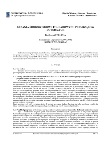 POLITECHNIKA RZESZOWSKA im. Ignacego Łukasiewicza Wydział Budowy Maszyn i Lotnictwa Katedra Awioniki i Sterowania BADANIA ŚRODOWISKOWE POKŁADOWYCH PRZYRZĄDÓW LOTNICZYCH Bartłomiej PAŁUCHA Seminarium Dyplomowe 2001/2002 LOTNICTWO-PILOTAŻ Streszczenie Referat ten ma przybliżyć czytelnikowi na czym polegają badania środowiskowe oraz warunki i metody ich przeprowadzania. Praca ta zawiera także przegląd aktualnie stosowanych procedur dotyczących badań środowiskowych wg normy DO-160 C. Omawia ona cel poszczególnych procedur jak i ogólną metodykę wraz z reprezentatywnymi zakresami ich stosowania. 1. Wstęp 1.1. Cel badań Badania środowiskowe mają na celu symulowanie w laboratorium rzeczywistych warunków pracy w jakich przyjdzie danemu urządzeniu pracować, oraz umożliwić określenie ich wpływu na dokładność wskazań. 1.2. Zasady opracowania dokumentu WYMAGANIA TECHNICZNE zawierającego szczegółowy program badań w zakładach PZL II Konstruktor projektujący wyposażenie pokładowe wraz z Głównym Inspektoratem Lotnictwa Cywilnego określa warunki jakie musi dany przyrząd spełniać. Następnie dobiera on odpowiednie normy i stopień ich szczegółowości na zasadzie kompromisu pomiędzy tym co chce otrzymać odbiorca a tym co w stanie jest zaoferować producent. Na podstawie zaakceptowanych obustronnie norm (jest to przeważnie norma BS 3 G100, powiązana z przepisami BCAR lub norma D0-160C) powstaje dokument: WYMAGANIA TECHNICZNE. Zawiera on szczegółowy program badań (rys.1) podzielony na część I wymagań szczegółowych (są tu podane punkty wymagań wg WT opracowane na podstawie powyższych norm) z bezpośrednio przytoczonymi zakresami, tolerancjami lub odwołaniem do konkretnej normy. Część II odnosi się do metodyki badań czyli bezpośredniego określenia warunków zewnętrznych czy wewnętrznych w jakich dany przyrząd będzie badany np. wielkości, czasu trwania, zmienności obciążeń, wielkości i prędkości zmian temperatury i ciśnienia, sposobie zamocowania i usytuowania przyrządu na stanowisku badawczym, oraz określeniem chwili w której nastąpi pomiar wskazań przyrządu. Karta pomiarowa (rys.2) związana jest z II częścią programu badań. Zawiera nie tylko uzyskane wyniki ale także wartości dopuszczalne które pozwalają stwierdzić czy wyrób przeszedł próbę [4]. 1.3. Przykład programu prób wraz z kartą pomiarową i schematem stanowiska do badań środowiskowych Rys.1 przedstawia program prób wariometrów membranowych opracowany w Wytwórni Sprzętu Komunikacyjnego PZL II. Karta pomiarowa przedstawiona na rys. 2 dotyczy podpunktu 16-ego programu badań (Sprawdzenie odporności na wibrację i cykliczną zmianę ciśnienia) powstaje ona na podstawie metodyki danej procedury. Schemat stanowiska rys. 3 również odnosi się do podpunktu 16-ego programu badań. Przedstawia on schemat połączeń pomiędzy poszczególnymi podzespołami mającymi w końcowym efekcie symulować dość złożone warunki rzeczywistej eksploatacji jak również umożliwić dokonanie pomiarów i ich odczyt w sposób przemyślany. Na ogół stanowiska są gotowymi produktami innych firm. Są to chłodziarko-podgrzewarki z możliwością zmiany wilgotności i ciśnienia. Produkowane one są przez firmy: KARL WEISS GRUNBACH, BRABENDER czy VOTSCH. W budowie urządzeń do badania wpływu środowiska morskiego specjalizuje się B. Pałucha Badania środowiskowe pokładowych przyrządów lotniczych BP - 1 firma KARL WEISS. Wstrząsarki z możliwością komputerowego projektowania przebiegu wstrząsów w całym zakresie częstotliwości jednocześnie buduje Firma TIRA [4]. Rys.1. Przykładowy program prób badań wariometrów membranowych. Example of examination plan 1 -manometr alkoholowy z podziałką w m/s (wariometr wzorcowy) 2 -zbiorniczek 9.3~9.5[l] 3 -rurki włoskowate 4 -barometr 5 -termometr 6 -barokomora 7 -badany przyrząd 8 -wstrząsarka 9 -zawory 10 -zbiornik o pojemności 15~20[l] 11 -wakuometr 12 -powietrzna popmpa próżniowa 1 2 3 5 4 6 7 8 12 Rys.2. Karta pomiarowa Examination chart B. Pałucha 9 11 10 9 Rys.3. Schemat stanowiska do badań środowiskowych Shematic diagram of environmental test device Badania środowiskowe pokładowych przyrządów lotniczych BP - 2 2. Warunki przeprowadzania testów Podłączenia i usytuowania przyrządów muszą być zgodne z zaleceniami producenta co do standardowego montowania ich w miejscu pracy. Połączenia których długość nie jest sprecyzowana przez producenta powinny mieć długość1,5 m lub tworzyć wiązkę o długości 1,2 m. Pomiar temperatury powietrza w pomieszczeniu testowym powinien być dokonywany w miejscu, gdzie warunki są reprezentatywne dla powietrza otaczającego przyrząd. Mierzenie temperatury przy ściance pomieszczenia jest niedopuszczalne ze względu na wymianę ciepła pomiędzy ścianką a otoczeniem . Jeśli nie jest to sprecyzowane przez konkretną normę wszystkie próby powinny przebiegać w następujących warunkach: - T=+15°~35°C ±3°C, - Wilgotność względna nie większa niż 85%, - Ciśnienie 840~1070 hPa (-1500 ft ~5000 ft) ±5% hPa, Podczas większości przeprowadzanych testów temperatura badanego przyrządu powinna być ustabilizowana. Za stabilizację temperatury urządzenia które podczas testu nie działa w pełnym zakresie swoich możliwości uważa się, gdy temperatura największej wewnętrznej masy przyrządu jest w granicach 3°C od wyspecjalizowanej temperatury testu. Jeśli pomiar wewnętrznej temperatury przyrządu jest trudny lub niemożliwy do zrealizowania to minimalny czas stabilizacji temperatury przyrządu wynosi 3h. Za stabilizację temperatury urządzenia które podczas testu działa w pełnym zakresie swoich możliwości uważa się, gdy temperatura największej wewnętrznej masy przyrządu nie zmienia się więcej niż 2°C/h. Jeśli pomiar wewnętrznej temperatury przyrządu jest trudny lub niemożliwy do zrealizowania to minima