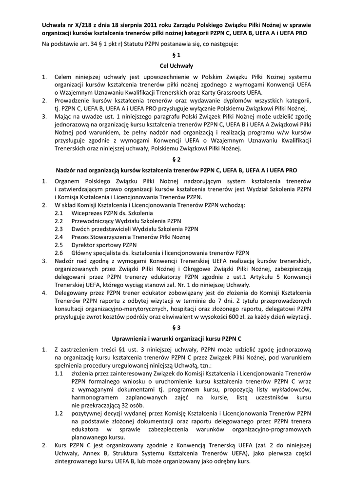 Uchwała nr X/218 z dnia 18 sierpnia 2011 roku Zarządu Polskiego Związku Piłki Nożnej w sprawie organizacji kursów kształcenia trenerów piłki nożnej kategorii PZPN C, UEFA B, UEFA A i UEFA PRO Na podstawie art. 34 § 1 pkt r) Statutu PZPN postanawia się, co następuje: §1 Cel Uchwały 1. 2. 3. Celem niniejszej uchwały jest upowszechnienie w Polskim Związku Piłki Nożnej systemu organizacji kursów kształcenia trenerów piłki nożnej zgodnego z wymogami Konwencji UEFA o Wzajemnym Uznawaniu Kwalifikacji Trenerskich oraz Karty Grassroots UEFA. Prowadzenie kursów kształcenia trenerów oraz wydawanie dyplomów wszystkich kategorii, tj. PZPN C, UEFA B, UEFA A i UEFA PRO przysługuje wyłącznie Polskiemu Związkowi Piłki Nożnej. Mając na uwadze ust. 1 niniejszego paragrafu Polski Związek Piłki Nożnej może udzielić zgodę jednorazową na organizację kursu kształcenia trenerów PZPN C, UEFA B i UEFA A Związkowi Piłki Nożnej pod warunkiem, że pełny nadzór nad organizacją i realizacją programu w/w kursów przysługuje zgodnie z wymogami Konwencji UEFA o Wzajemnym Uznawaniu Kwalifikacji Trenerskich oraz niniejszej uchwały, Polskiemu Związkowi Piłki Nożnej. §2 Nadzór nad organizacją kursów kształcenia trenerów PZPN C, UEFA B, UEFA A i UEFA PRO 1. 2. 3. 4. Organem Polskiego Związku Piłki Nożnej nadzorującym system kształcenia trenerów i zatwierdzającym prawo organizacji kursów kształcenia trenerów jest Wydział Szkolenia PZPN i Komisja Kształcenia i Licencjonowania Trenerów PZPN. W skład Komisji Kształcenia i Licencjonowania Trenerów PZPN wchodzą: 2.1 Wiceprezes PZPN ds. Szkolenia 2.2 Przewodniczący Wydziału Szkolenia PZPN 2.3 Dwóch przedstawicieli Wydziału Szkolenia PZPN 2.4 Prezes Stowarzyszenia Trenerów Piłki Nożnej 2.5 Dyrektor sportowy PZPN 2.6 Główny specjalista ds. kształcenia i licencjonowania trenerów PZPN Nadzór nad zgodną z wymogami Konwencji Trenerskiej UEFA realizacją kursów trenerskich, organizowanych przez Związki Piłki Nożnej i Okręgowe Związki Piłki Nożnej, zabezpieczają delegowani przez PZPN trenerzy edukatorzy PZPN zgodnie z ust.1 Artykułu 5 Konwencji Trenerskiej UEFA, którego wyciąg stanowi zał. Nr. 1 do niniejszej Uchwały. Delegowany przez PZPN trener edukator zobowiązany jest do złożenia do Komisji Kształcenia Trenerów PZPN raportu z odbytej wizytacji w terminie do 7 dni. Z tytułu przeprowadzonych konsultacji organizacyjno-merytorycznych, hospitacji oraz złożonego raportu, delegatowi PZPN przysługuje zwrot kosztów podróży oraz ekwiwalent w wysokości 600 zł. za każdy dzień wizytacji. §3 Uprawnienia i warunki organizacji kursu PZPN C 1. 2. Z zastrzeżeniem treści §1 ust. 3 niniejszej uchwały, PZPN może udzielić zgodę jednorazową na organizację kursu kształcenia trenerów PZPN C przez Związek Piłki Nożnej, pod warunkiem spełnienia procedury uregulowanej niniejszą Uchwałą, tzn.: 1.1 złożenia przez zainteresowany Związek do Komisji Kształcenia i Licencjonowania Trenerów PZPN formalnego wniosku o uruchomienie kursu kształcenia trenerów PZPN C wraz z wymaganymi dokumentami tj. programem kursu, propozycją listy wykładowców, harmonogramem zaplanowanych zajęć na kursie, listą uczestników kursu nie przekraczającą 32 osób. 1.2 pozytywnej decyzji wydanej przez Komisję Kształcenia i Licencjonowania Trenerów PZPN na podstawie złożonej dokumentacji oraz raportu delegowanego przez PZPN trenera edukatora w sprawie zabezpieczenia warunków organizacyjno-programowych planowanego kursu. Kurs PZPN C jest organizowany zgodnie z Konwencją Trenerską UEFA (zał. 2 do niniejszej Uchwały, Annex B, Struktura Systemu Kształcenia Trenerów UEFA), jako pierwsza części zintegrowanego kursu UEFA B, lub może organizowany jako odrębny kurs. 3. Dyplomy PZPN C, na podstawie protokołu podpisanego przez Komisje Egzaminacyjną, w składzie której musi być delegowany przez PZPN trener edukator, wyznaczony przez Wydział Szkolenia PZPN lub Komisję Kształcenia i Licencjonowania Trenerów PZPN, wydaje PZPN za odpłatnością 20 zł za dyplom. §4 Kryteria przyjęć na kurs trenerów PZPN C 1. Kandydatem na kurs trenerów PZPN C może być osoba, która spełnia następujące kryteria: 1.1 1.2 1.3 1.4 ma ukończone 18 lat, jest absolwentem szkoły / uczelni o kierunku sportowym lub nauczycielskim, lub legitymuje się stażem zawodniczym w rozgrywkach OZPN / ZPN dowolnego szczebla, potwierdzonym opinią wystawioną przez macierzysty Związek Piłki Nożnej. przedstawi zaświadczenie wystawione przez lekarza o stanie zdrowia pozwalającym na wykonywanie zawodu trenera piłki nożnej i uczestnictwo w kursie, złoży oświadczenie o niekaralności sądowej i pełnej zdolności do czynności prawnych. §5 Uprawnienia i warunki organizacji kursów UEFA B, UEFA B Wyrównawczego 1. 2. 3. Z zastrzeżeniem treści § 1 ust. 3 niniejszej uchwały, PZPN może udzielić zgodę jednorazową na organizację kursu trenerów UEFA B, UEFA B Wyrównawczego przez Związek Piłki Nożnej, pod warunkiem spełnienia procedury uregulowanej niniejszą Uchwałą, tzn.: 1.1 złożenia do PZPN formalnego wniosku o uruchomienie kursu kształcenia trenerów UEFA B wraz z wymaganymi dokumentami tj. programem kursu, propozycją listy wykładowców, harmonogramem zaplanowanych zajęć na kursie, listą uczestników kursu nie przekraczającą 32 osób. 1.2 pozytywnej decyzji wydanej przez Komisję Kształcenia i Licencjonowania Trenerów PZPN na podstawie złożonej dokumentacji oraz raportu delegowanego przez PZPN trenera edukatora w sprawie zabezpieczenia warunków organizacyjno-programowych planowanego kursu. Organizacja zintegrowanego kursu UEFA B odbywa się w połączeniu z kursem PZPN C. Dyplomy UEFA B, na podstawie protokołu podpisanego przez Komisję Egzaminacyjną, w składzie której musi być delegowany przez PZPN trener edukator wyznaczony przez Wydział Szkolenia PZPN lub Komisję Kszta