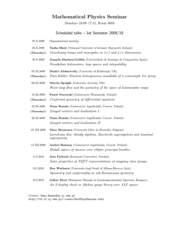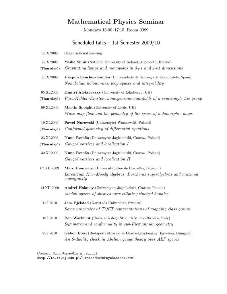 Mathematical Physics Seminar Mondays 16:00–17:15, Room 0089 Scheduled talks – 1st Semester 2009/10 05.X.2009 Organisational meeting 22.X.2009 Yasha Shnir (National University of Ireland, Maynooth, Ireland) (Thursday!) 26.X.2009 Gravitating lumps and monopoles in 3+1 and 4+1 dimensions Joaquı́n Sánchez-Guillén (Universidade de Santiago de Compostela, Spain) Nonabelian holonomies, loop spaces and integrability 05.XI.2009 (Thursday!) 09.XI.2009 Dmitri Alekseevsky (University of Edinburgh, UK) Para-Kähler–Einstein homogeneous manifolds of a semisimple Lie group Martin Speight (University of Leeds, UK) Wave-map flow and the geometry of the space of holomorphic maps 19.XI.2009 (Thursday!) 23.XI.2009 (Thursday!) 30.XI.2009 Pawel Nurowski (Uniwersytet Warszawski, Poland) Conformal geometry of differential equations Nuno Romão (Uniwersytet Jagielloński, Cracow, Poland) Gauged vortices and localisation I Nuno Romão (Uniwersytet Jagielloński, Cracow, Poland) Gauged vortices and localisation II 07.XII.2009 Marc Henneaux (Université Libre de Bruxelles, Belgium) Lorentzian Kac–Moody algebras, Borcherds superalgebras and maximal supergravity 14.XII.2009 Andrei Halanay (Uniwersytet Jagielloński, Cracow, Poland) Moduli spaces of sheaves over elliptic principal bundles 11.I.2010 Jens Fjelstad (Karlstads Universitet, Sweden) Some properties of TQFT representations of mapping class groups 18.I.2010 Ben Warhurst (Università degli Studi di Milano-Bicocca, Italy) Symmetry and conformality in sub-Riemannian geometry 25.I.2010 Gábor Etesi (Budapesti Műszaki és Gazdaságtudományi Egyetem, Hungary) An S-duality check in Abelian gauge theory over ALF spaces Contact: [email protected] http://th.if.uj.edu.pl/∼romao/MathPhysSeminar.html