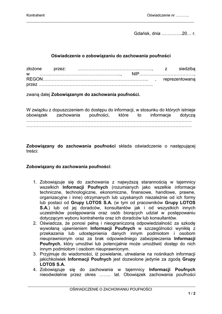 Oświadczenie nr ……….. Kontrahent ___________________________________________________________________________ Gdańsk, dnia …………..20… r. Oświadczenie o zobowiązaniu do zachowania poufności złożone przez: ………………………………………….., z siedzibą w ……..……………………………………….., NIP………………………………., REGON…………………………………………………………….. , reprezentowaną przez ………………………………………………………………….. zwaną dalej Zobowiązanym do zachowania poufności. W związku z dopuszczeniem do dostępu do informacji, w stosunku do których istnieje obowiązek zachowania poufności, które to informacje dotyczą ………………………………………………………………………………………………… ………………………………………………………………………………………………… Zobowiązany do zachowania poufności składa oświadczenie o następującej treści: Zobowiązany do zachowania poufności: 1. Zobowiązuje się do zachowania z najwyższą starannością w tajemnicy wszelkich Informacji Poufnych (rozumianych jako wszelkie informacje techniczne, technologiczne, ekonomiczne, finansowe, handlowe, prawne, organizacyjne i inne) otrzymanych lub uzyskanych niezależnie od ich formy lub postaci od Grupy LOTOS S.A. (w tym od pracowników Grupy LOTOS S.A.) lub od jej doradców, konsultantów jak i od wszystkich innych uczestników postępowania oraz osób biorących udział w postępowaniu dotyczącym wyboru kontrahenta oraz ich doradców lub konsultantów. 2. Oświadcza, że ponosi pełną i nieograniczoną odpowiedzialność za szkodę wywołaną ujawnieniem Informacji Poufnych w szczególności wynikłą z przekazania lub udostępnienia danych innym podmiotom i osobom nieuprawnionym oraz za brak odpowiedniego zabezpieczenia Informacji Poufnych, który umożliwi lub potencjalnie może umożliwić dostęp do nich innym podmiotom i osobom nieuprawnionym. 3. Przyjmuje do wiadomości, iż powielanie, utrwalanie na nośnikach informacji jakichkolwiek Informacji Poufnych jest dozwolone jedynie za zgodą Grupy LOTOS S.A. 4. Zobowiązuje się do zachowania w tajemnicy Informacji Poufnych nieodwołalnie przez okres …….. lat. Obowiązek zachowania poufności ___________________________________________________________________________ OŚWIADCZENIE O ZACHOWANIU POUFNOŚCI 1/2 Oświadczenie nr ……….. Kontrahent ___________________________________________________________________________ Informacji Poufnych wygasa jedynie w odniesieniu do tych informacji, które zostaną upowszechnione w wyniku okoliczności nie stanowiących naruszenia zobowiązania jakiegokolwiek podmiotu do zachowania poufności oraz jeżeli wymagają tego bezwzględnie obowiązujące przepisy prawa polskiego w zakresie wynikającym z tych przepisów. W drugim przypadku Zobowiązany do zachowania poufności zobowiązuje się niezwłocznie powiadomić Grupę LOTOS S.A. o obowiązku ujawnienia informacji oraz podjąć wszelkie prawnie dopuszczalne kroki zmierzające do zminimalizowania zakresu ujawnianych informacji. 5. Zobowiązuje się, iż na wyrażone w każdym czasie pisemne żądanie Grupy LOTOS S.A. obowiązany jest najpóźniej w ciągu 7 dni zgodnie z żądaniem Grupy LOTOS S.A. zwrócić wszystkie nośniki, na których zostały utrwalone Informacje Poufne lub usunąć je w sposób uniemożliwiający ich odtworzenie nie zatrzymując żadnych ich kopii ani innych reprodukcji. W tym samym terminie Zobowiązany do zachowania poufności zobowiązany jest do złożenia pisemnego oświadczenia o należytym wykonaniu obowiązku określonego w zdaniu poprzedzającym. W przypadku naruszenia postanowień powyższych w zakresie zachowania poufności, Zobowiązany do zachowania poufności zapłaci Grupie LOTOS S.A. karę umowną w kwocie …………………. (słownie: ……………………..) PLN za każde naruszenie postanowień niniejszej umowy. Kara ta nie wyklucza możliwości dochodzenia dodatkowego odszkodowania na zasadach ogólnych. Wszelkie stosunki wynikające z niniejszego zobowiązania podlegają prawu polskiemu. Sądem właściwym w sprawach spornych będzie sąd właściwy ze względu na siedzibę Grupy LOTOS S.A. Za naruszenie powyższych postanowień przez osoby, którym informacje zostały przekazane przez Zobowiązanego do zachowania poufności odpowiada on jak za własne naruszenie. Treść niniejszego oświadczenia ma charakter poufny. __________________________ Zobowiązany do zachowania poufności ___________________________________________________________________________ OŚWIADCZENIE O ZACHOWANIU POUFNOŚCI 2/2